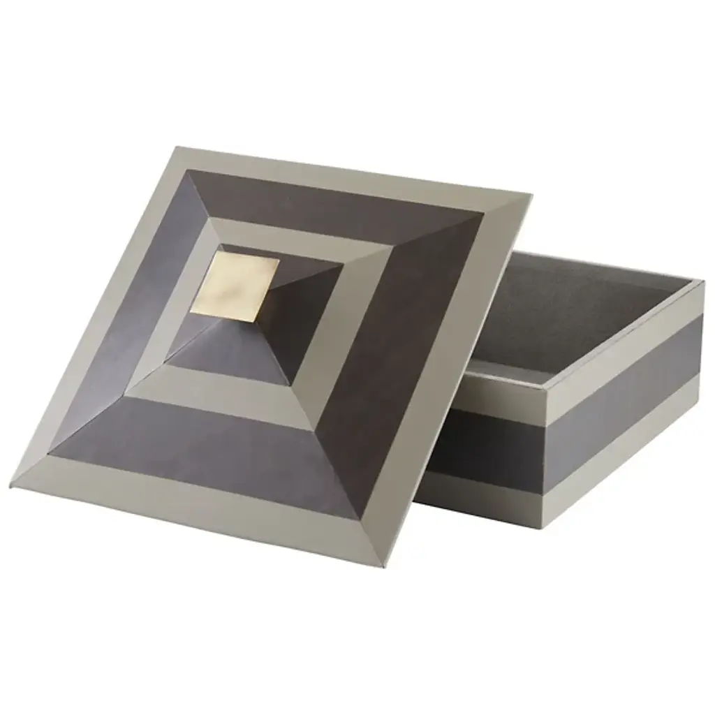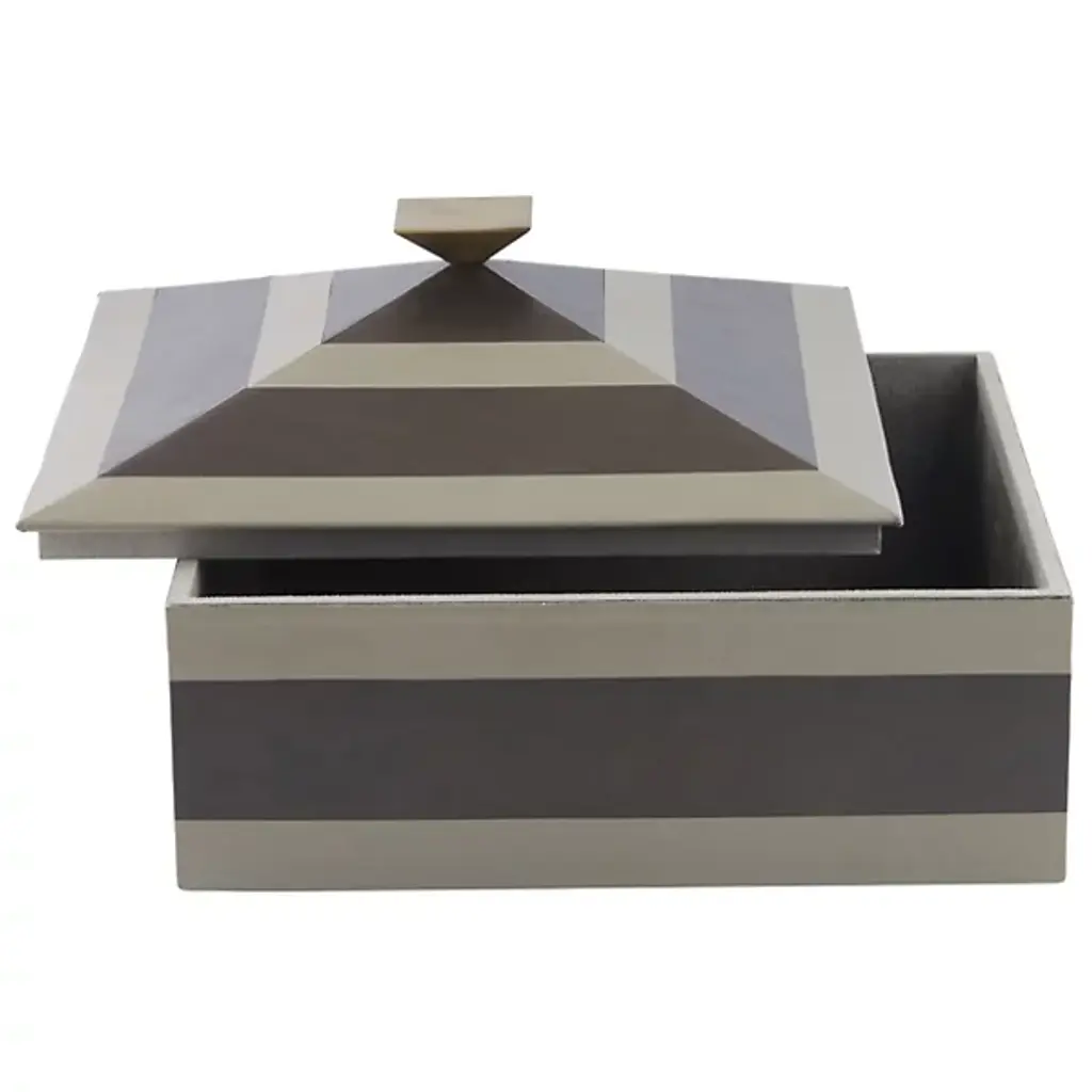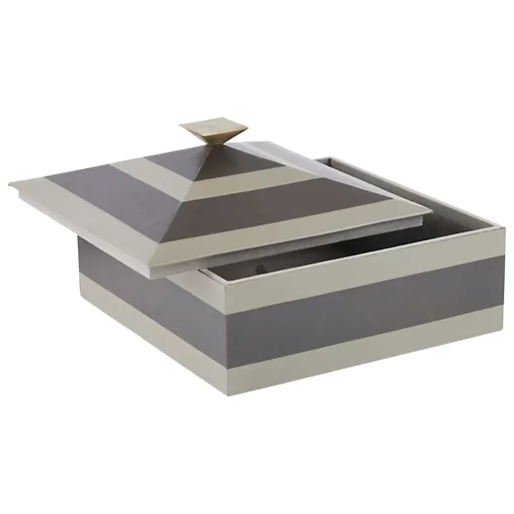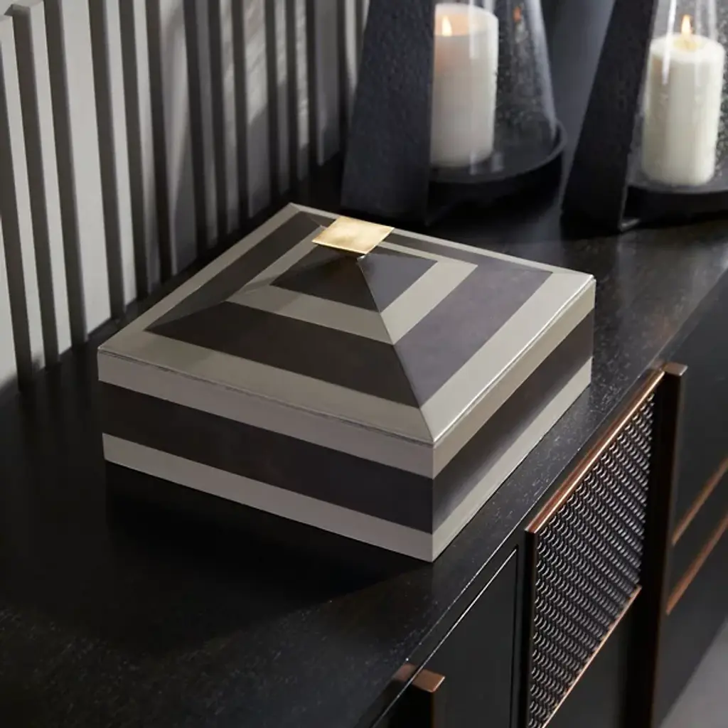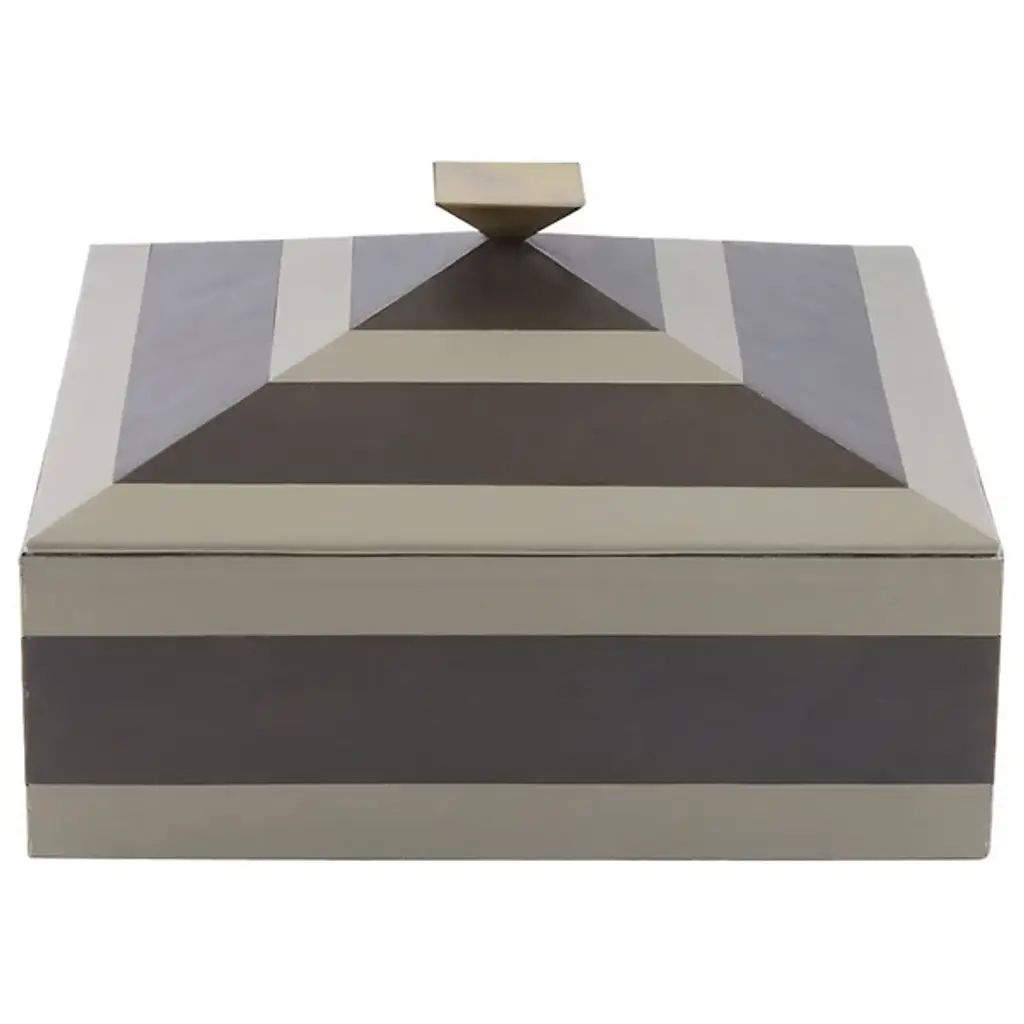 Tonal stripes accent the Cheshire Box from Arteriors for a polished touch. Inspired by pyramids, this accessory features a bronze-plated handle that complements its geometric lines. Lined with soft suede for a luxurious feel, it's perfect for organizing essentials with style. Each piece is unique, showcasing variations in finish that enhance its distinctive appeal.