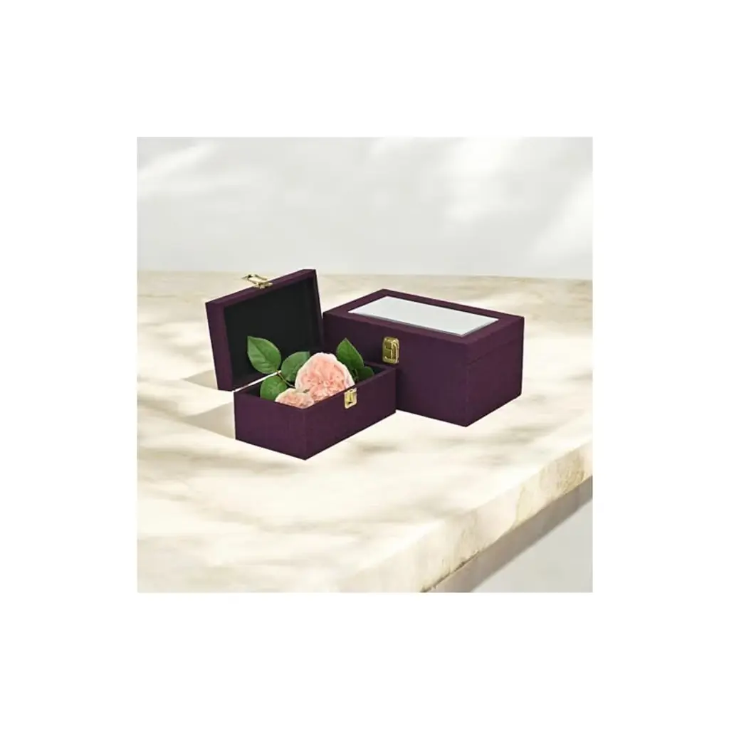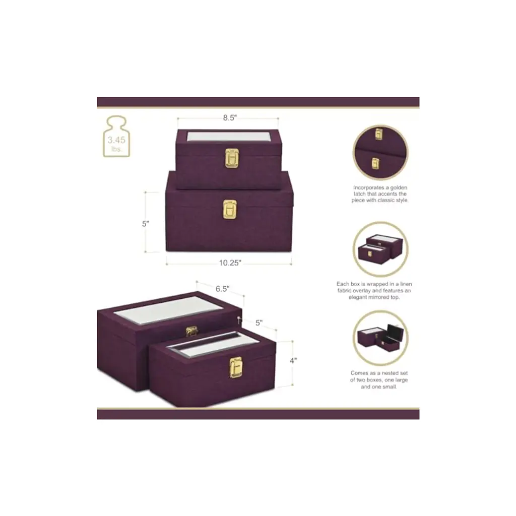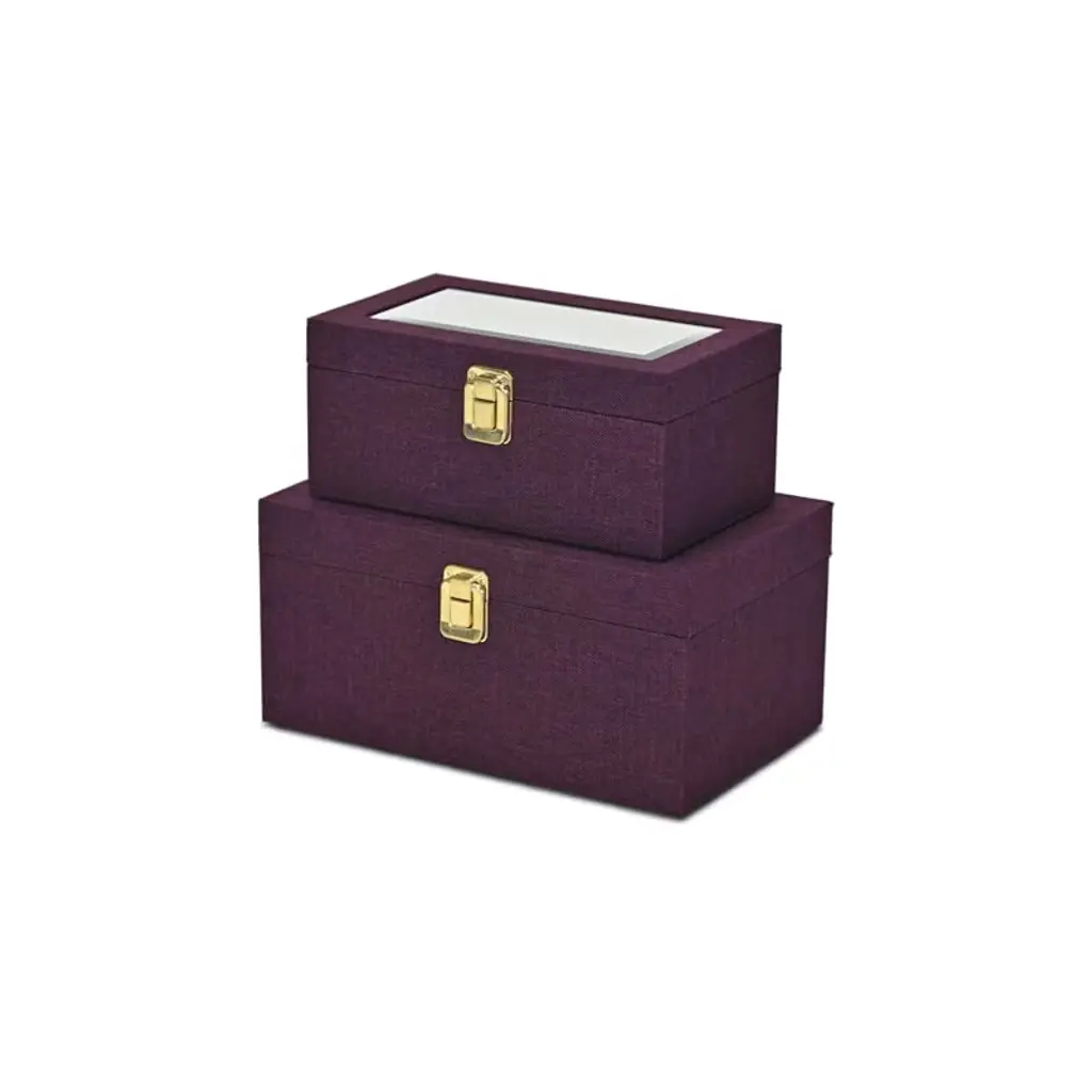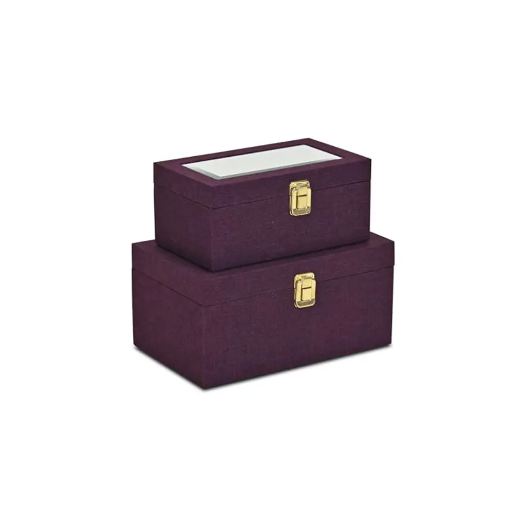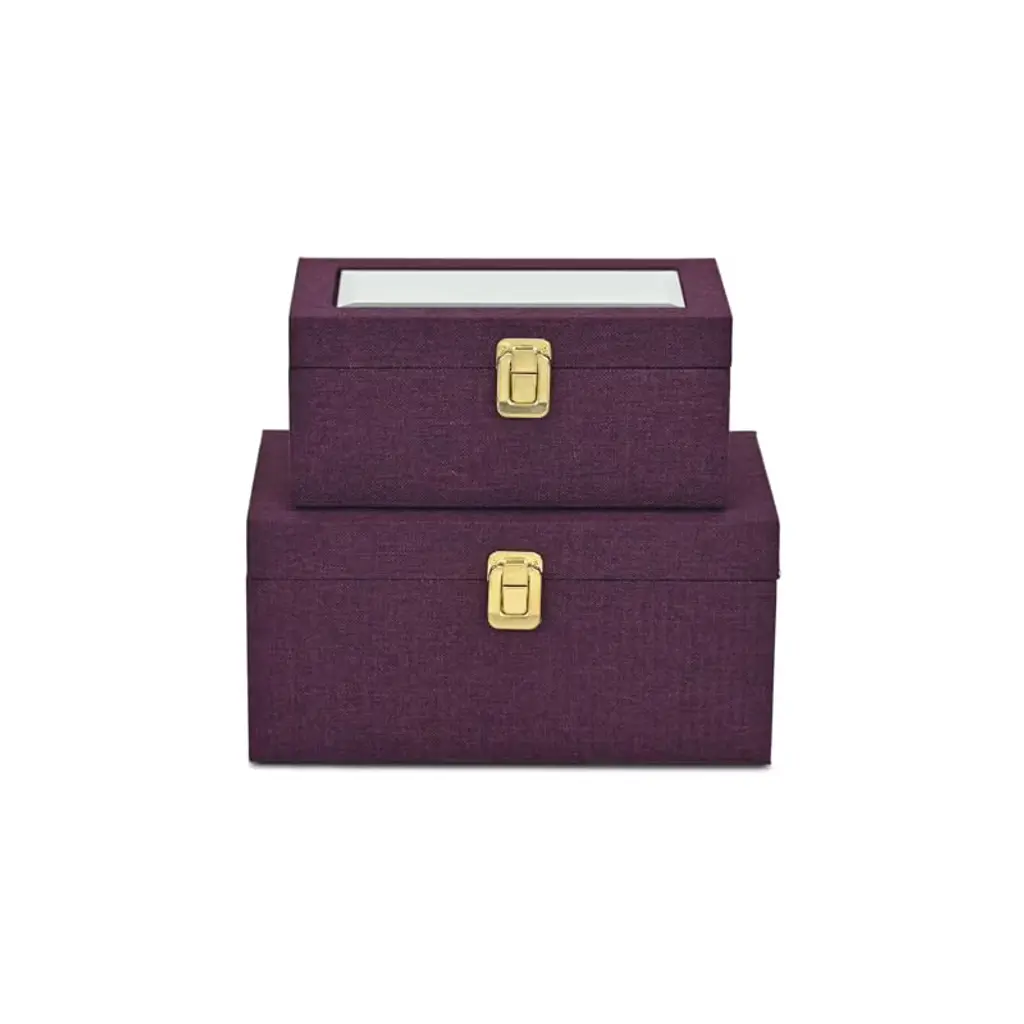 Add a touch of luxury with the Canter Isle Linen Box Set in purple. Handcrafted from premium wood, these compact storage boxes are both functional and stylish. Their modern, minimalist design with a rich purple finish and gold handles make them a standout in any space. Perfect for organizing remote controls, magazines, or office supplies, they blend practicality with elegance, enhancing your living room, office, or bedroom décor.