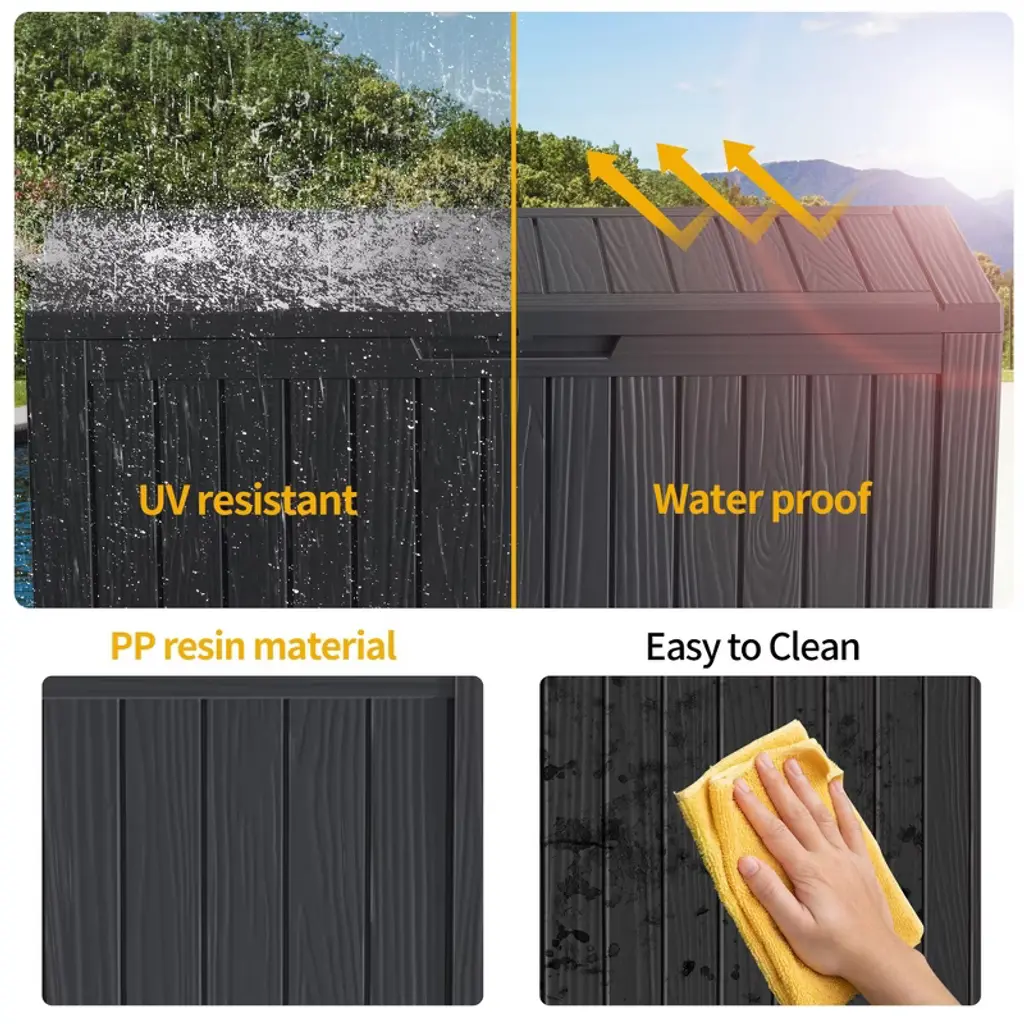About This ProductThe 80-gallon deck box is perfect for stashing away outdoor accessories on your patio or cold weather gear inside your laundry room or garage. Featuring weather resistant plastic construction that allows for year-round use and easy maintenance-along to complement your existing decor-this unit packs style and convenience into a small footprint. Regardless of your unique needs, this stylish small deck box will make a great addition to your home!Features 𝗟𝗮𝗿𝗴𝗲 c𝗮𝗽𝗮𝗰𝗶𝘁𝘆 o𝘂𝘁𝗱𝗼𝗼𝗿 s𝘁𝗼𝗿𝗮𝗴𝗲: This 80 gal. deck box offers plenty of storage space, allowing you to easily store additional items like patio cushions, pillows, pool toys, gardening tools, and more, keeping your backyard clean and organized𝗘𝗮𝘀𝘆 a𝘀𝘀𝗲𝗺𝗯𝗹𝘆: No screws or tools required, you can effortlessly assemble it in just 10-30 minutes we provide clear instructions to guide you through the assembly process, saving you time and effort𝗔𝗱𝗱𝗶𝘁𝗶𝗼𝗻𝗮𝗹 t𝗮𝗯𝗹𝗲 𝗼𝗿 se𝗮𝘁: With a load capacity of 660 lbs., it can be used as a single yard seat or indoor table, adding practical value to your outdoor space whether you want to relax or host outdoor gatherings, it meets a variety of needs𝗚𝗿𝗲𝗮𝘁 v𝗮𝗹𝘂𝗲 𝗳𝗼𝗿 m𝗼𝗻𝗲𝘆: In addition to its functionality and durability, this deck box features a user-friendly design it is equipped with sturdy side handles for easy transportation within this reasonable price range, you will get a product that truly offers value for your outdoor storage needsSize is ideal for indoor or outdoor settings