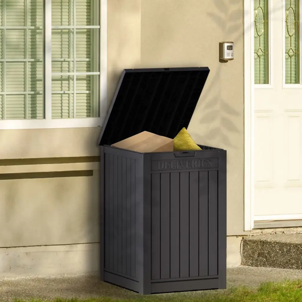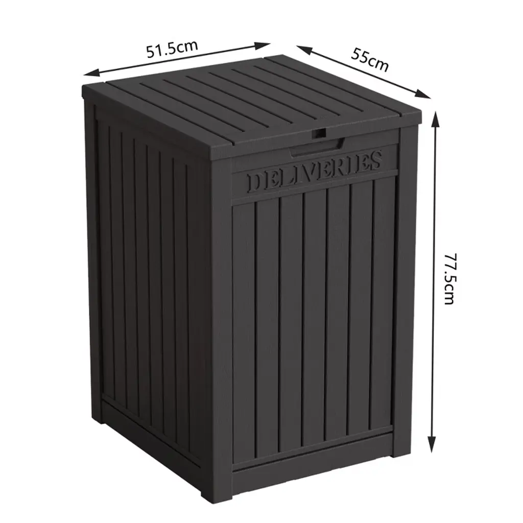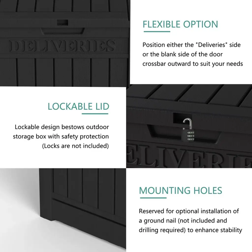 About This Product This outdoor parcel drop box is made of durable plastic material that ensures long-term protection from the elements. It has an extra-large storage space that provides enough room for packages of all sizes. The easy-to-install design allows you to install it on your porch or curb in no time. Whether for home or office use, this versatile box provides a safe and convenient solution for receiving packages. Features 𝐒𝐩𝐚𝐜𝐢𝐨𝐮𝐬 𝐒𝐭𝐨𝐫𝐚𝐠𝐞:Delivery Box measures 21.6" * 20.2" * 30.5", with 48 gallon large capacity, you can comfortably store various package sizes, making it convenient for all your delivery needs.𝐔𝐥𝐭𝐢𝐦𝐚𝐭𝐞 𝐒𝐞𝐜𝐮𝐫𝐢𝐭𝐲: Still worried about your package going missing? Don't worry, the DRATO Large Package Delivery and Storage Box features a locking system (lock not included), which effectively protects your parcels from animals, thieves and ensures that your parcels are safe and secure until you pick them up.𝐁𝐮𝐢𝐥𝐭 𝐭𝐨 𝐋𝐚𝐬𝐭: Highly durable weather-and-UV-resistant resin finish, This Outdoor Package Delivery Box is ruggedly constructed to withstand rain, snow, typhoons, sunlight and other harsh weather conditions. It's a great choice for you.𝐒𝐥𝐞𝐞𝐤 𝐃𝐞𝐬𝐢𝐠𝐧: Two-side door crossbar that facilitates installation on either side - Position the side with “Deliveries” outward to signal its purpose, or use the other side that’s blank depending on your needs; minimalist style makes this a great dust-proof addition to your porch, curb, apartment, office, store, etc.