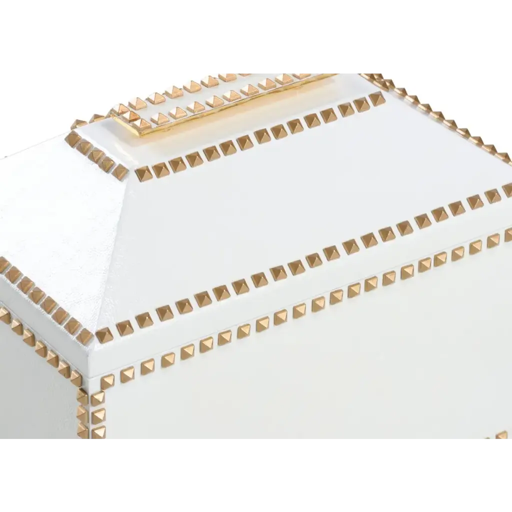 HANDSOME WHITE AND GOLD FAUX LEATHER BOX WITH HAND APPLIED STUD DESIGN AND METAL HANDLE. DESIGNED BY SHAYLA COPAS.