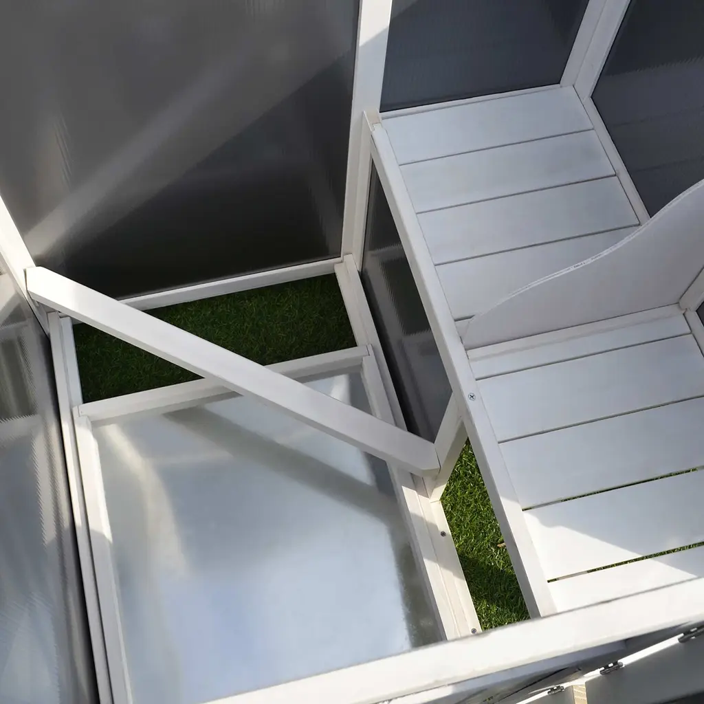 This outdoor chicken coop, made of strong waterproof lacquered fir wood, has a stable structure, underslope metal panels for extended service life, weather-resistant asphalt roof and upper nesting boxes to protect your pet from the elements. The stylish look adds modernity to your backyard and house, with a locking design that keeps your household animals safe from predators plus wire mesh to maintain good ventilation. The Windows of the coop use transparent PVC panels to increase indoor light and facilitate observation of the chicks, and detachable trays and open rear doors make cleaning easy.
