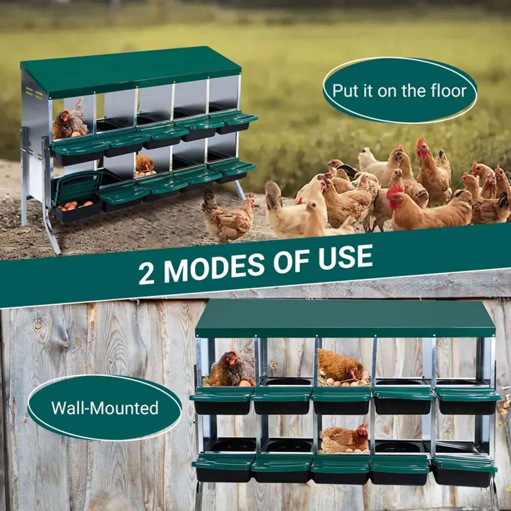 Chicken Nesting Box, 10 Hole Chicken Laying Box With Chicken Perch, Metal Roll Away Nest Box For Chicken Coop Hens Poultry, Green With Legs