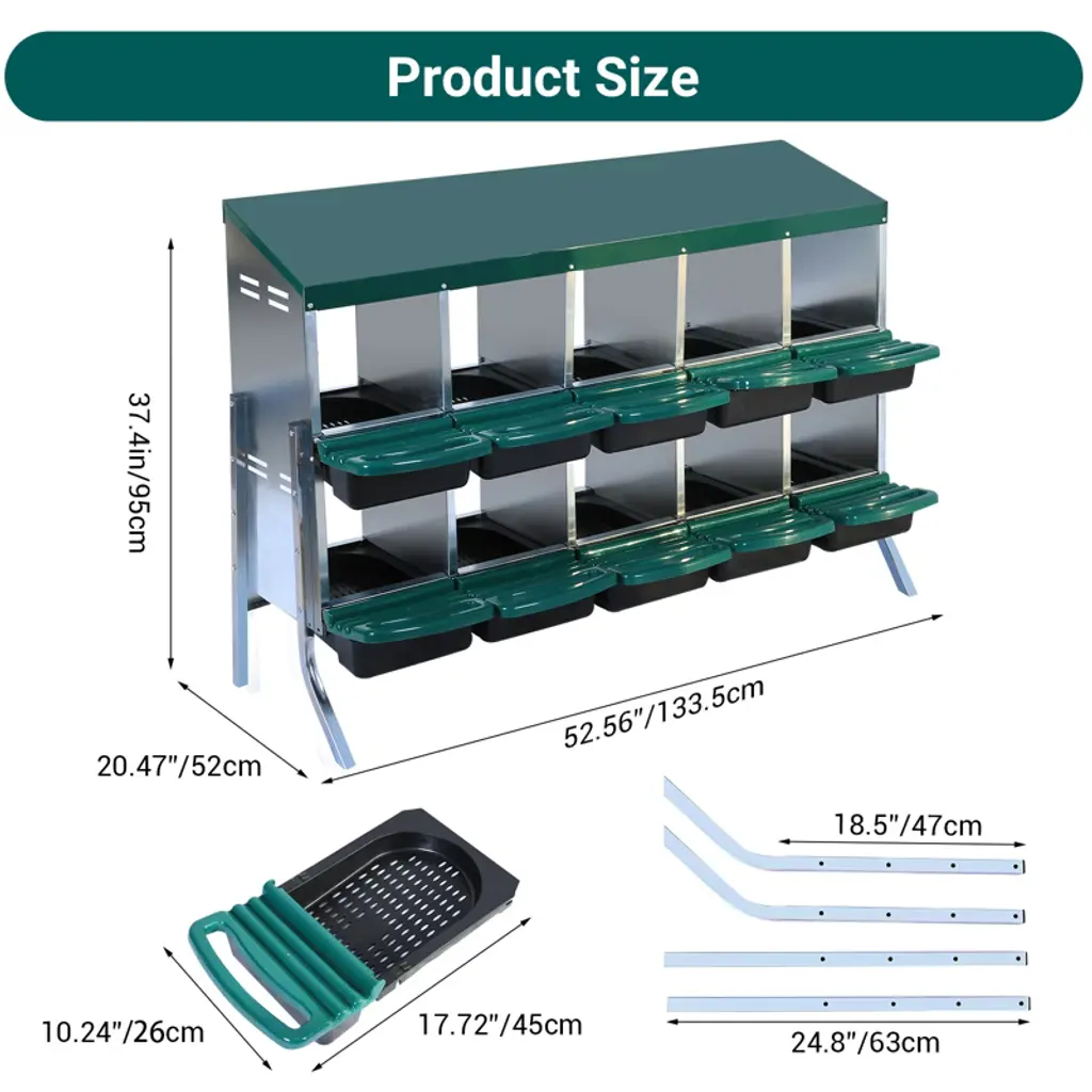 Give Your Hens the Perfect Laying SpaceOur galvanized steel nesting box provides a safe, comfortable spot for egg laying while making egg collection effortless for you. Key Features That Deliver Results• Roll-Away Egg System: Slanted floor automatically moves eggs to a covered collection tray, keeping them clean and unbroken• All-Weather Durability: Thick galvanized steel stands up to rain, sun, and curious beaks• Happy Hens: Swing perch aids entry, ventilation prevents overheating, and enclosed design reduces stress• Install Your Way: Mount securely on walls or use as a freestanding unit with included adjustable legs• Low Maintenance: Removable tray cleans quickly; drainage holes keep bedding dry Simple Setup & Use Assemble in minutes using included hardware and manualInstall 18-20 inches off ground (wall or legs)Add bedding to nesting areaCollect clean eggs daily from the front tray Tip: Place soft padding under the lid for added egg protection Package Includes1x Galvanized Steel Nesting Box1x Hardware Kit1x Assembly Guide Provide your flock with a stress-free laying environment and enjoy cleaner eggs every morning!