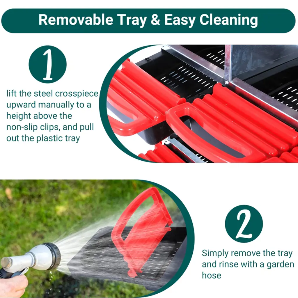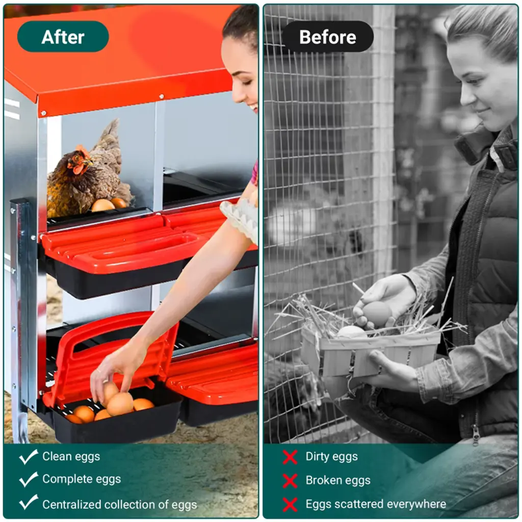 Give Your Hens the Perfect Laying SpaceOur galvanized steel nesting box provides a safe, comfortable spot for egg laying while making egg collection effortless for you. Key Features That Deliver Results• Roll-Away Egg System: Slanted floor automatically moves eggs to a covered collection tray, keeping them clean and unbroken• All-Weather Durability: Thick galvanized steel stands up to rain, sun, and curious beaks• Happy Hens: Swing perch aids entry, ventilation prevents overheating, and enclosed design reduces stress• Install Your Way: Mount securely on walls or use as a freestanding unit with included adjustable legs• Low Maintenance: Removable tray cleans quickly; drainage holes keep bedding dry Simple Setup & Use Assemble in minutes using included hardware and manualInstall 18-20 inches off ground (wall or legs)Add bedding to nesting areaCollect clean eggs daily from the front tray Tip: Place soft padding under the lid for added egg protection Package Includes1x Galvanized Steel Nesting Box1x Hardware Kit1x Assembly Guide Provide your flock with a stress-free laying environment and enjoy cleaner eggs every morning!