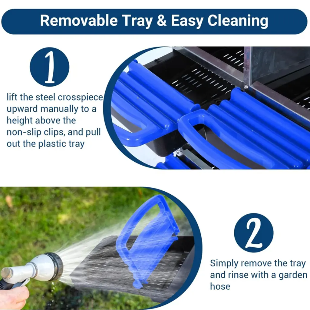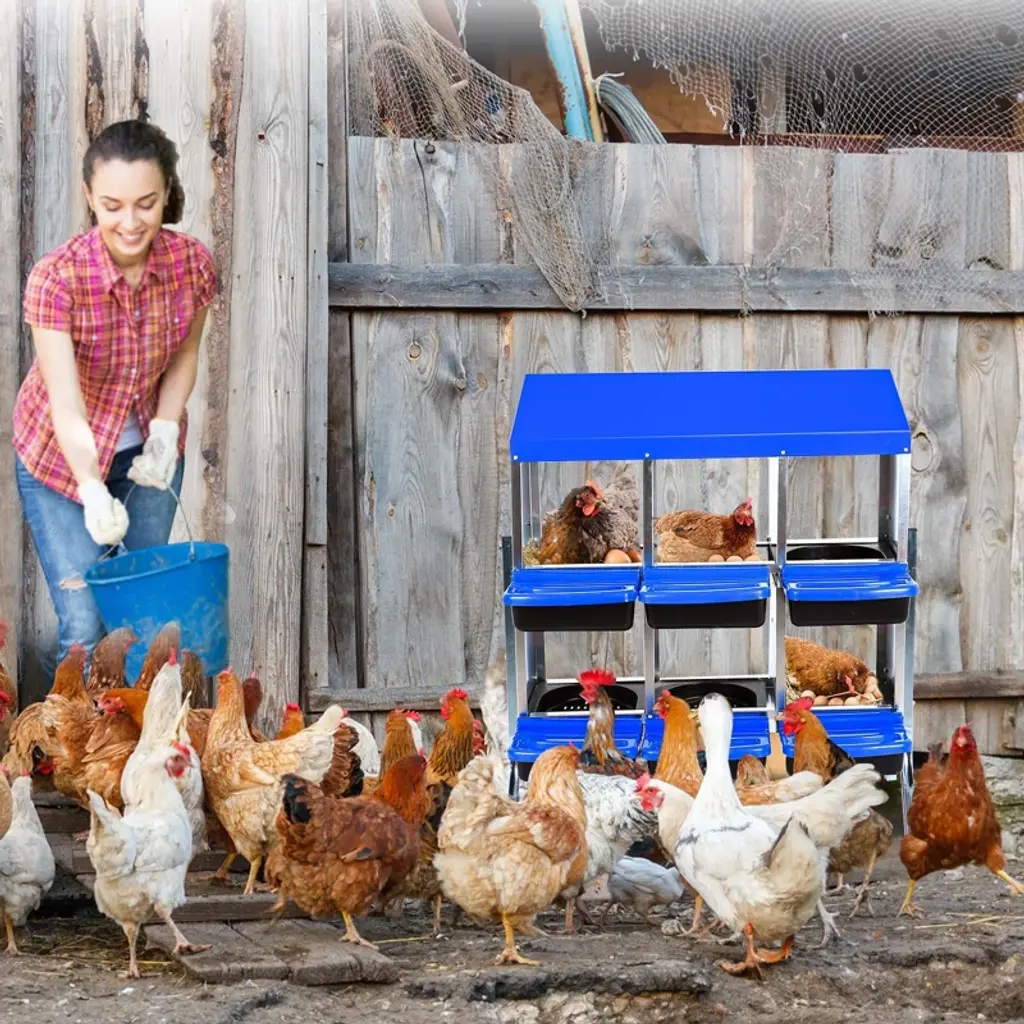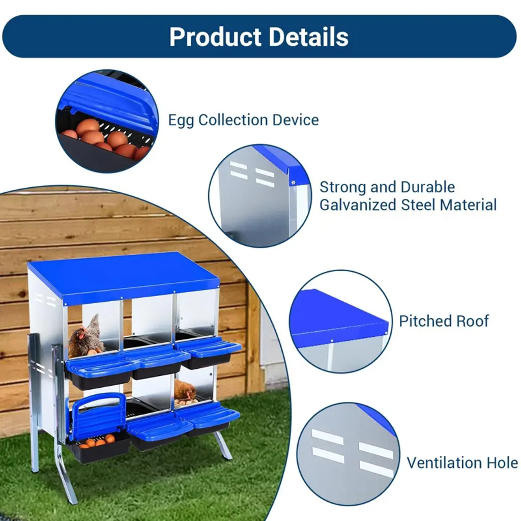 Product Description Upgrade your chicken coop with the premium chicken nesting box, crafted from durable galvanized steel. With a protective lid and easy egg collection system, this nesting box offers a secure and comfortable space for your hens, ensuring happy hens and fresh eggs every day! Highlights at a Glance: - galvanized steel withstands the elements. - Sloped design automatically collect eggs for a fresh harvest daily. - Covered boxes prevent hens from eating their eggs. - Swing perch in front gives hens a convenient spot to jump and land before entering. - Ventilation openings on bottom and sides ensure airflow for chickens comfort. - Versatile installation: wall-mount or place on the ground. - Can be installed 18-20 inches off the ground for easy access with its equipped legs. Specifications: Material: Galvanized Steel Packing List: 1 x Chicken Nesting Box 1 x Hardware Pack 1 x Assembly Manual Notes: Please follow the installation instructions step by step. Before starting, make sure you have all the parts you need. We suggest adding some padding under the lid of the egg collection box to provide extra protection for the eggs against impacts.