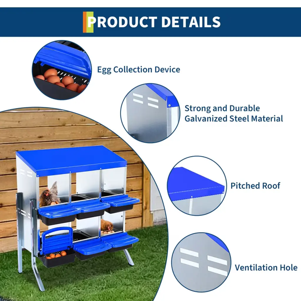 Product Name: Nesting Boxes For ChickensMain Material: Galvanized SteelA variety of sizes are available, there is always one that suits you:1.Nesting boxes 6 holes (without leg): 32"L x 20.5"W x 31"H2.Nesting boxes 6 holes (with leg): 32"L x 20.5"W x 37.4"H3.Nesting box 8 holes (without leg): 42.3"L x 20.5"W x 31.1"H4.Nesting box 8 holes (with leg): 42.3"L x 20.5"W x 37.4"H 5.Nesting box10 holes (without leg): 52.56"L x 20.47"W x 31.1"H6.Nesting box10 holes (with leg): 52.56"L x 20.47"W x 37.4"H