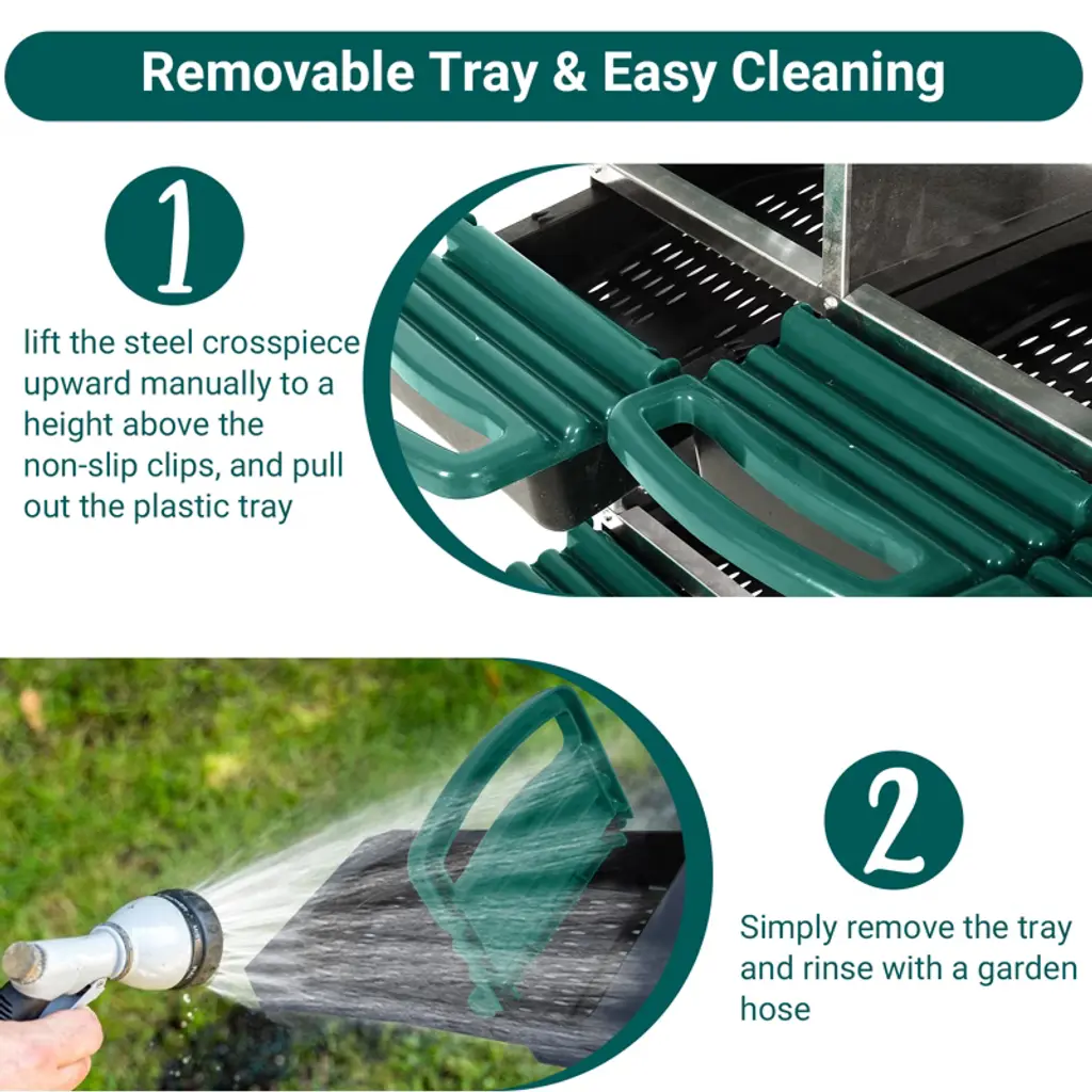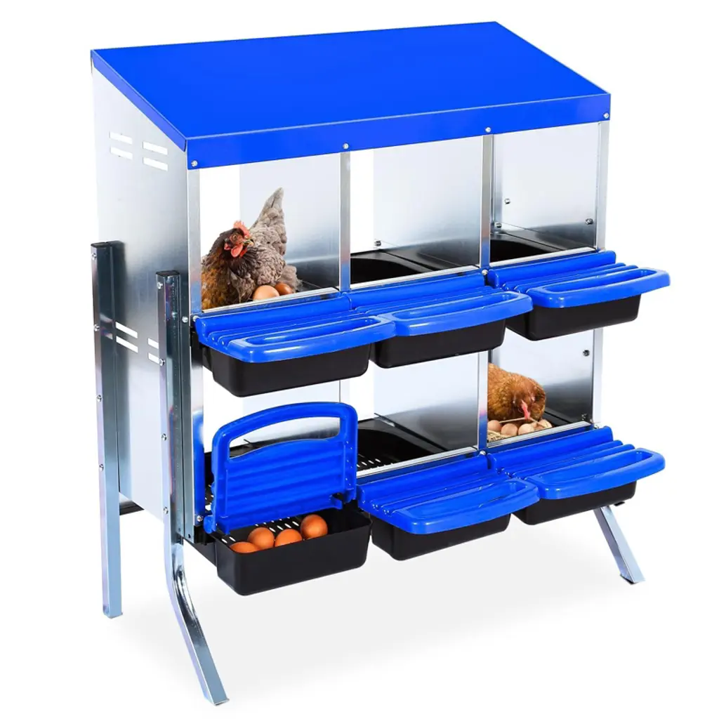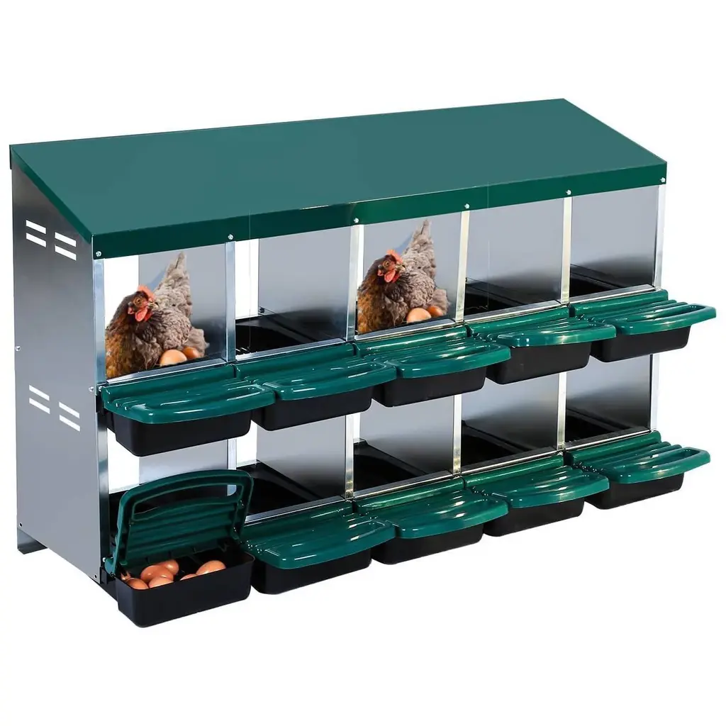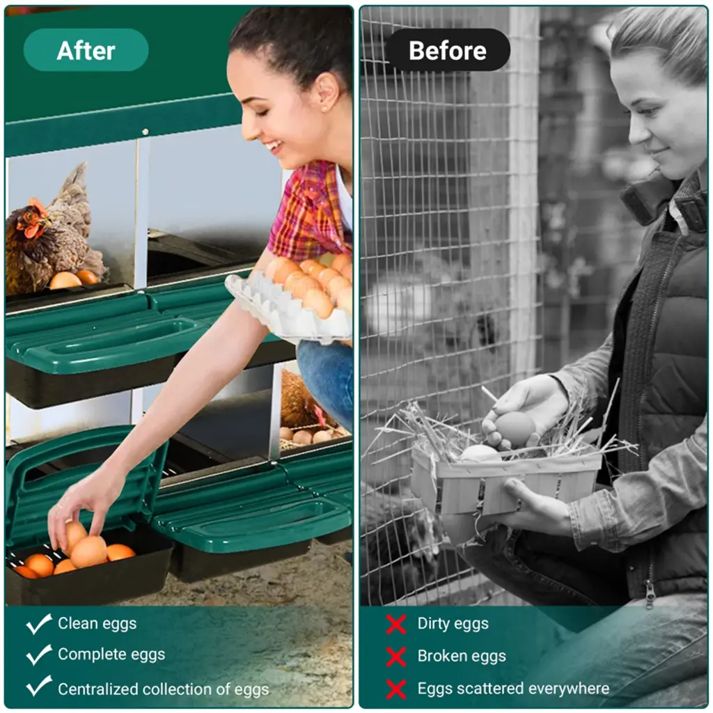 Give Your Hens the Perfect Laying SpaceOur galvanized steel nesting box provides a safe, comfortable spot for egg laying while making egg collection effortless for you. Key Features That Deliver Results• Roll-Away Egg System: Slanted floor automatically moves eggs to a covered collection tray, keeping them clean and unbroken• All-Weather Durability: Thick galvanized steel stands up to rain, sun, and curious beaks• Happy Hens: Swing perch aids entry, ventilation prevents overheating, and enclosed design reduces stress• Install Your Way: Mount securely on walls or use as a freestanding unit with included adjustable legs• Low Maintenance: Removable tray cleans quickly; drainage holes keep bedding dry Simple Setup & Use Assemble in minutes using included hardware and manualInstall 18-20 inches off ground (wall or legs)Add bedding to nesting areaCollect clean eggs daily from the front tray Tip: Place soft padding under the lid for added egg protection Package Includes1x Galvanized Steel Nesting Box1x Hardware Kit1x Assembly Guide Provide your flock with a stress-free laying environment and enjoy cleaner eggs every morning!