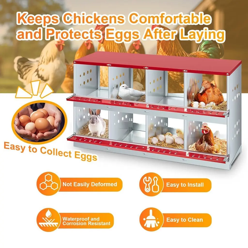 All-Metal Construction: Crafted from heavy duty weather-resistant galvanized steel, our chicken nesting boxes eliminate the fragility of plastic materials. This robust design ensures long-term stability and reliability, making it perfect for both backyard enthusiasts and commercial poultry farmers.Enhanced Ventilation: The chicken nest boxes come with multiple vented holes that improve airflow in your coop. This design promotes a comfortable and safe atmosphere for your flock, enhancing their well-being.Space-Saving Design: Our thoughtfully designed egg laying boxes maximize space with a compact yet spacious layout, allowing you to house multiple hens comfortably while optimizing your coop's footprint. Suitable for small backyards or larger farming operations.Easy Installation: The nesting boxes come with perfectly aligned pre-drilled holes and all necessary hardware, making assembly and installation a breeze, and it can be mounted either directly on the ground or on a wall or fence. Perfect for novice chicken owners and seasoned farmers alike who want a hassle-free setup.Easy Cleaning Access: The chicken laying boxes are equipped with removable dividers and front swing perch, making egg collection and cleaning simple and efficient. Maintain a hygienic environment effortlessly, ensuring healthier chickens and fresher eggs.