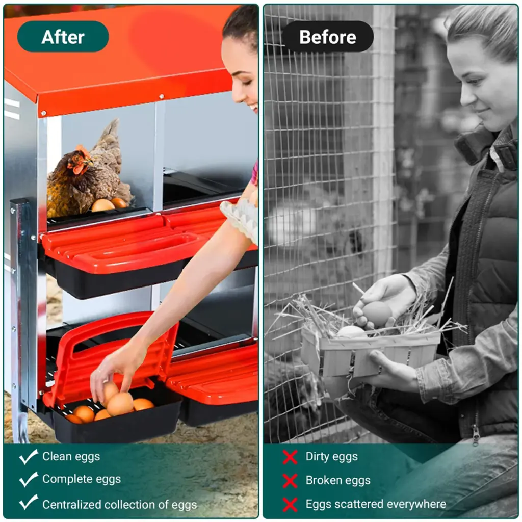Enhance your chicken coop with this vibrant red 10-compartment Chicken Nesting Box, crafted from heavy-duty galvanized steel for long-lasting durability. Resistant to rust, weather, and pecking, this sturdy metal nesting box outperforms plastic or wood alternatives, providing a secure and comfortable environment for your hens to lay eggs. The innovative roll-away egg system gently guides eggs into a covered tray, keeping them clean, intact, and out of hens¡¯ reach¡ªhelping to prevent egg-eating and saving valuable time during daily egg collections with easy-access design. Each compartment features a perfect 18-20" height and includes a swing perch for hens to enter easily. Ventilation holes maintain consistent airflow to keep your layers cool and stress-free. The dark, enclosed design replicates natural nesting environments, encouraging improved egg production while reducing stress during laying. Installation is flexible, allowing secure wall mounting or freestanding placement using the included legs. Adjustable positioning fits any coop size, from small to large. With keyhole slots and clear instructions, setup is quick and tool-free. The easy-clean design includes removable trays with drainage holes to prevent moisture buildup, ensuring a hygienic space that promotes healthier hens. The wipe-down surface simplifies maintenance. Dimensions: [Dimensions not specified] Material: Heavy-duty galvanized steel What You Get: One 10-compartment chicken nesting box in red, with roll-away trays, lid cover, swing perch, legs, mounting hardware, and instructions After-Sales Service: Customer support available for installation assistance and product inquiries