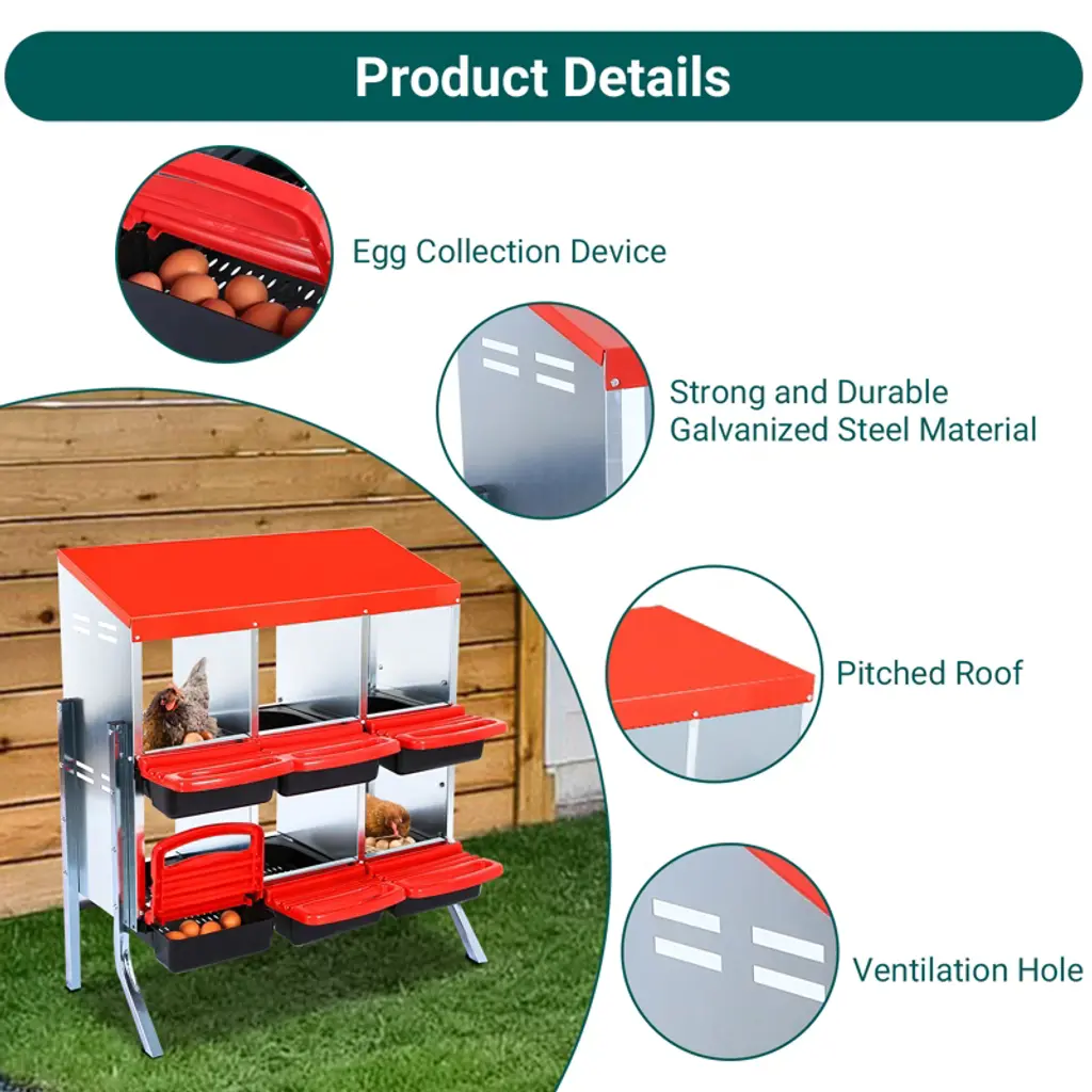 Highlights at a Glance:- Durable galvanized steel withstands the elements.- 6/8/10 compartments automatically collect eggs for a fresh harvest daily.- Covered boxes prevent hens from eating their eggs.- Ventilation openings ensure airflow for chicken comfort.- Versatile installation: wall-mount or place on the ground. Specifications:Size: 31.89 x 20.47 x 37.4 inches / 42.32 x 20.47 x 37.4 inches / 52.56 x 20.47 x 31.1 inchesMaterial: Galvanized Steel Packing List:1 x Chicken Nesting Box1 x Hardware Pack1 x Instruction Manual Notes:Please follow the installation instructions step by step. Before starting, make sure you have all the parts you need.Before purchasing, confirm that the number and size of nesting boxes are suitable for your flock. Typically, each hen should have her own space to minimize competition.Select an appropriate location for the nesting boxes, avoiding noisy and high-traffic areas to reduce stress on the chickens, and ensure that the boxes are stable and secure.