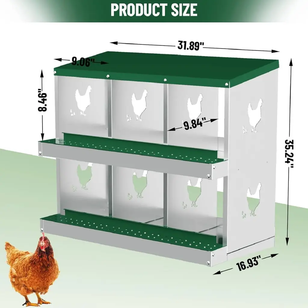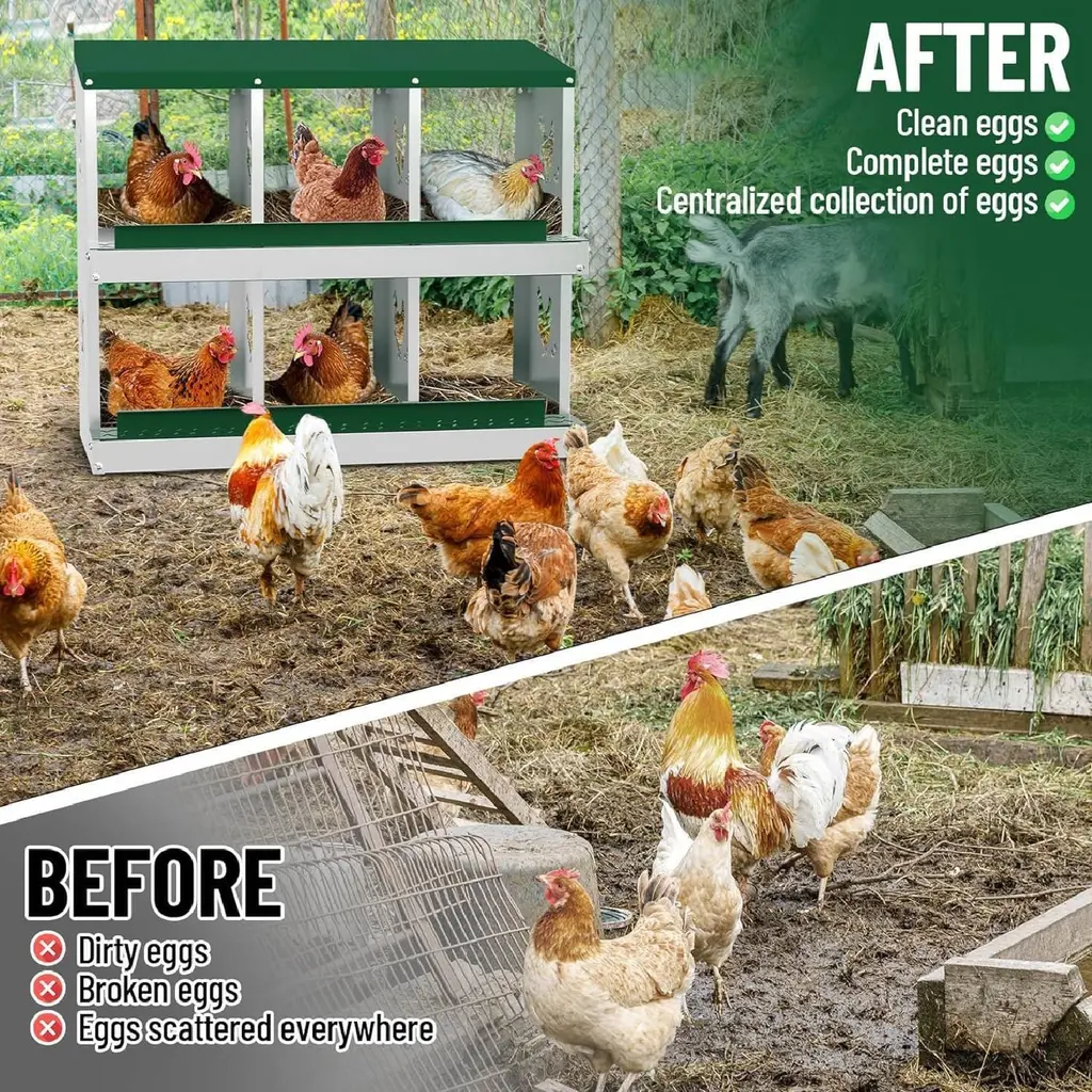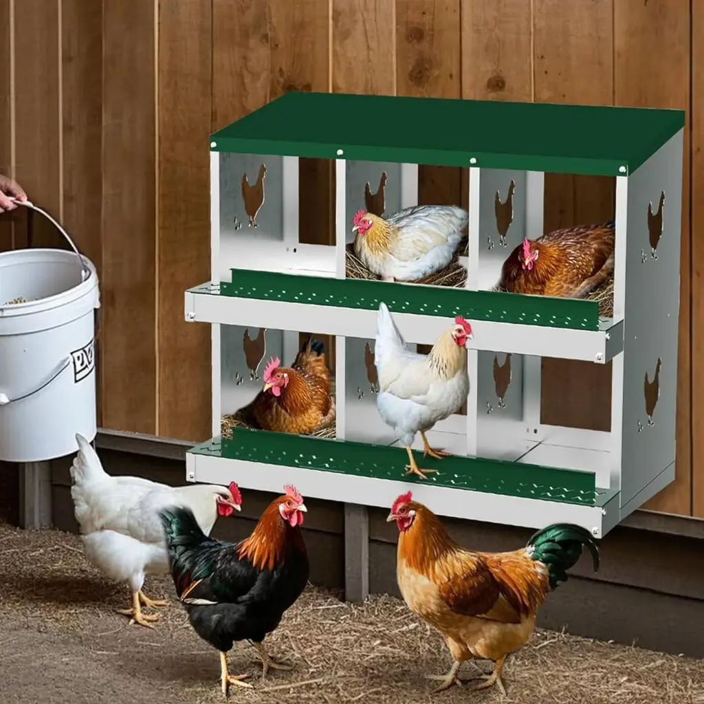 Premium Quality: Our Chicken Nesting Boxes are made from galvanised steel and have a strong and robust construction.Ventilation holes provide fresh air to the hens and keep the nesting boxes dry and cool, providing a good environment for the hens and improving production.Egg Collection: The nesting box chassis is slightly tilted to allow the eggs to roll safely into the egg collection box, keeping the eggs clean and intact, you can easily get more high quality eggs, in order to protect the eggs from collision, you can put some padding under the lid of the egg collection box to reduce the cushioning.Comfortable Space: The metal nesting boxes provide hens with plenty of space for laying eggs, the sloping roof design prevents water from pooling in rainy days, and the spacious, comfortable, safe and stress-free environment allows hens to feel comfortable, which will naturally increase egg production.Wide Range of Applications: Whether it's a small free-range flock or a large chicken farm, this nesting box is perfectly suited to a wide range of coop sizes and layouts, the nesting box is equally suited to ducks, geese and even rabbits, making it the ideal choice for chicken enthusiasts of all levels of farming to meet a wide range of farming needs.Easy to Install: Each pack of hen boxes contains all the screws and nuts required for assembly and can be completed with simple installation by following the instructions provided, the components are a breeze to set up and remove the nesting boxes easily.