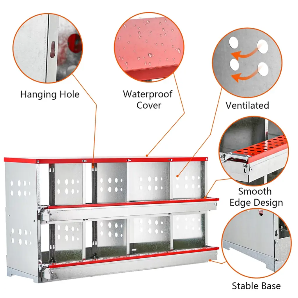 Efficient Egg Production: Equipped with 6 compartments, this nesting box provides ample space for your hens, reducing competition for nesting spots and improving egg-laying efficiency. Easy Collection: The unique roll-out design allows eggs to roll out naturally, making collection effortless and minimizing the risk of egg damage. Durable Materials: Made from metal, this nesting box is sturdy and durable, designed to withstand daily wear and tear for long-term use. Heavy-Duty Structure: Built as a heavy-duty chicken coop, it remains stable in various weather conditions, ensuring the safety and comfort of your poultry. Includes a perch, offering extra resting space for your birds, enhancing their comfort.