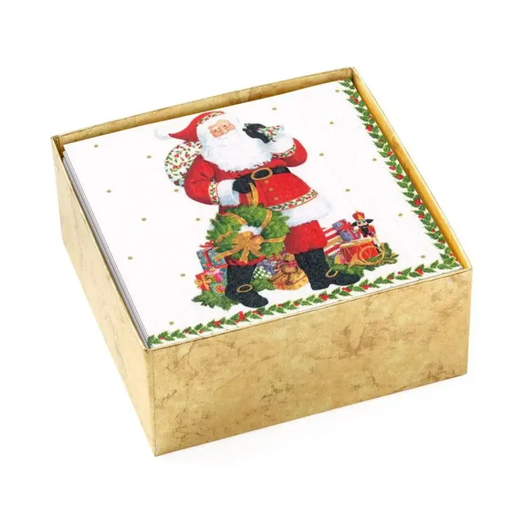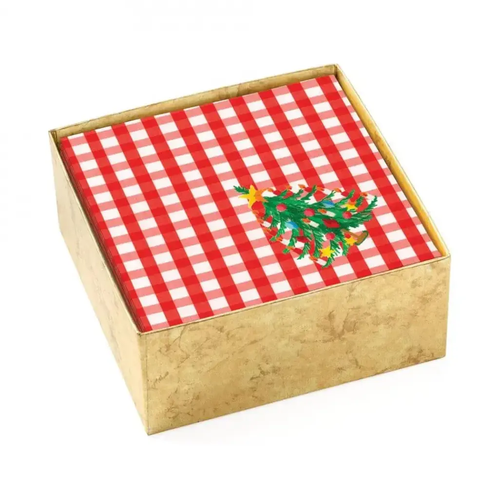 Caspari triple-ply napkins are both striking in design and durable in function. Thoughtfully designed to elevate any occasion, they feature artwork and designs from museums and artists around the world. Each is made of triple-ply tissue and printed in Germany with nontoxic, water-soluble dyes and food-safe ink. They are FSC-certified and made using environmentally-conscious raw materials, which ensures they are both biodegradable and compostable. Our napkins bring eco-friendly style and convenience to your tabletop. 40 napkins included in a gilded gift box with acetate lid. Caspari boxed cocktail napkins make an excellent and useful gift item.