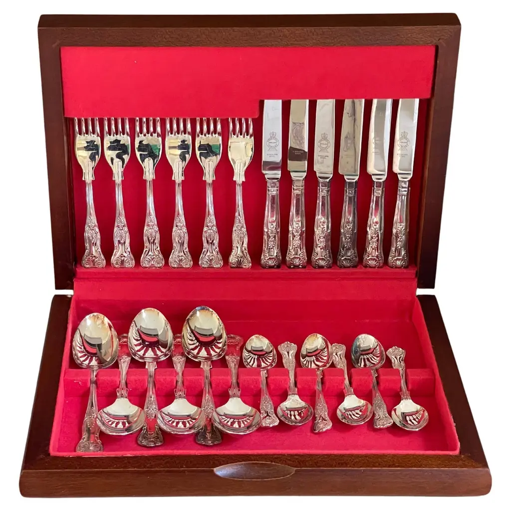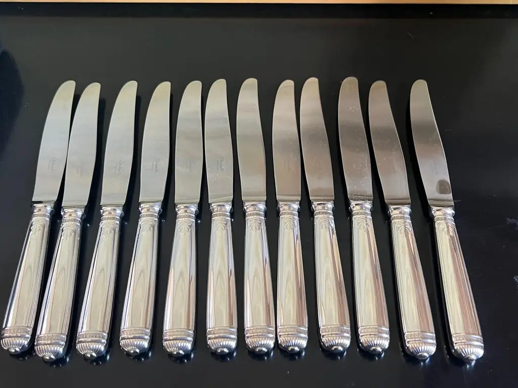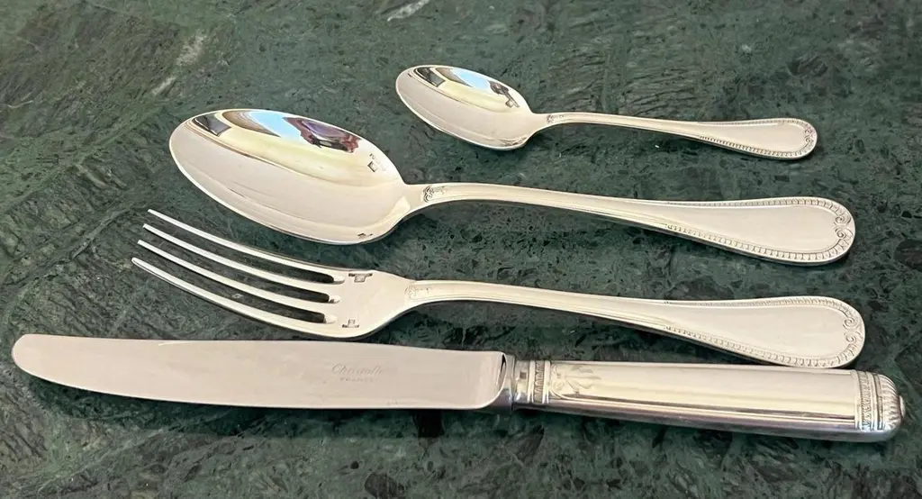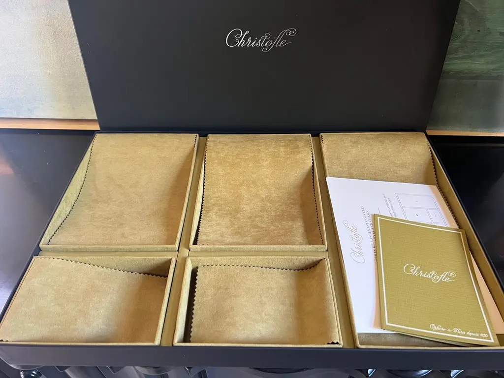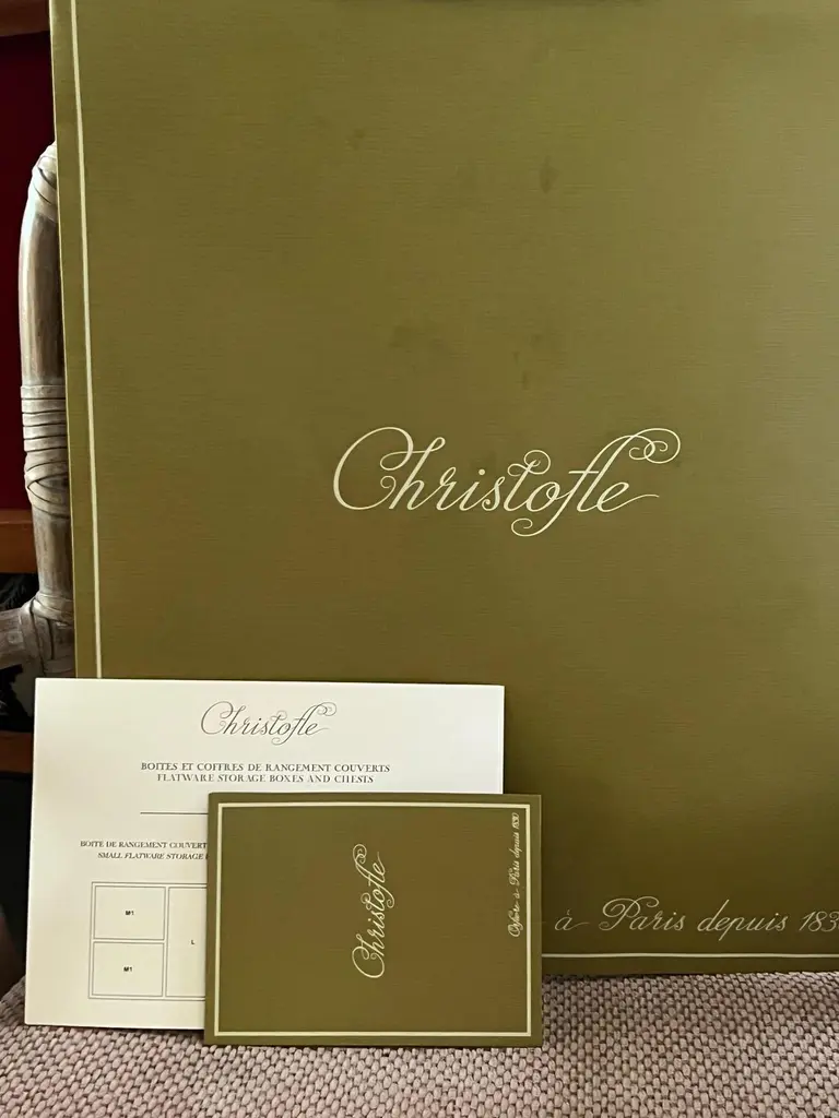 Forty nine piece flatware set made by Christofle in France, in the Malmaison pattern. The service for twelve was made around 2000. All the pieces are hallmarked and come in a new box with room to grow your set. A Christofle bag is included to use for gifting12 Dinner Knives 9.6"12 Dinner Spoons 8"12 Dinner Forks: 8.1"12 Tea / Coffee Spoons: 5.3"1 Condiment Spoon: 4"One of Christofle's most historic and sought after patterns, Malmaison is a nod to the Chateau de la Malmaison, a favored Parisian residence of Napoleon Bonaparte and Empress Josephine. Launched in 1967, the frieze of delicate palm & lotus leaves decorating the flatware are typical of the Empire style.