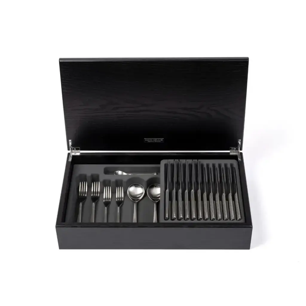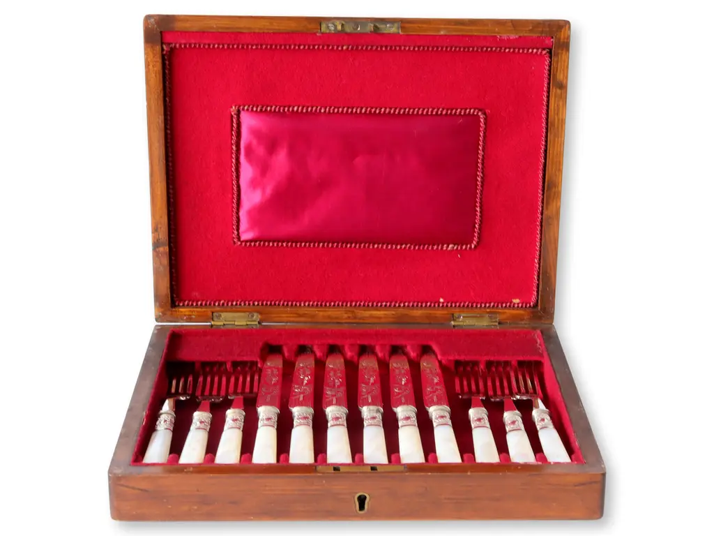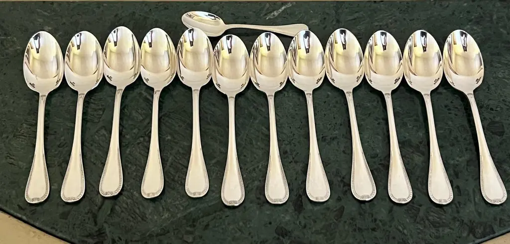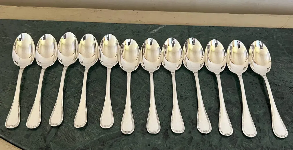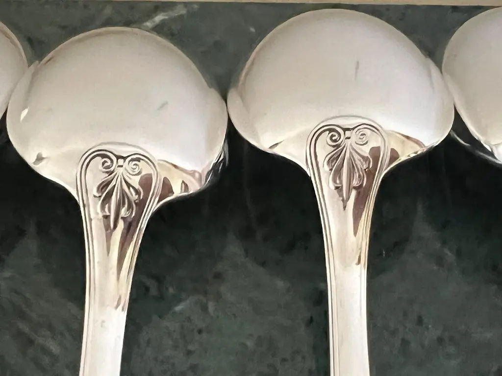 Forty nine piece flatware set made by Christofle in France, in the Malmaison pattern. The service for twelve was made around 2000. All the pieces are hallmarked and come in a new box with room to grow your set. A Christofle bag is included to use for gifting12 Dinner Knives 9.6"12 Dinner Spoons 8"12 Dinner Forks: 8.1"12 Tea / Coffee Spoons: 5.3"1 Condiment Spoon: 4"One of Christofle's most historic and sought after patterns, Malmaison is a nod to the Chateau de la Malmaison, a favored Parisian residence of Napoleon Bonaparte and Empress Josephine. Launched in 1967, the frieze of delicate palm & lotus leaves decorating the flatware are typical of the Empire style.