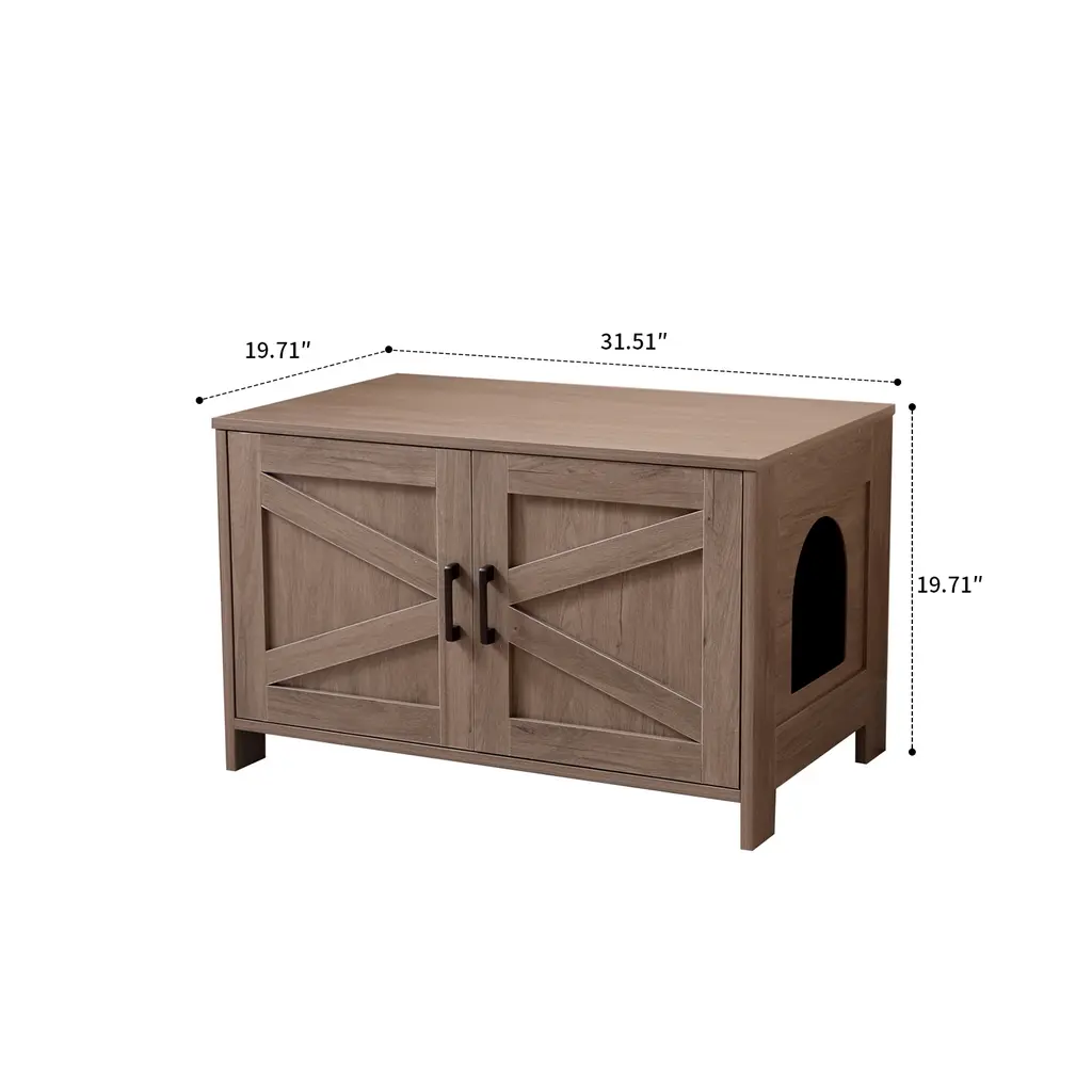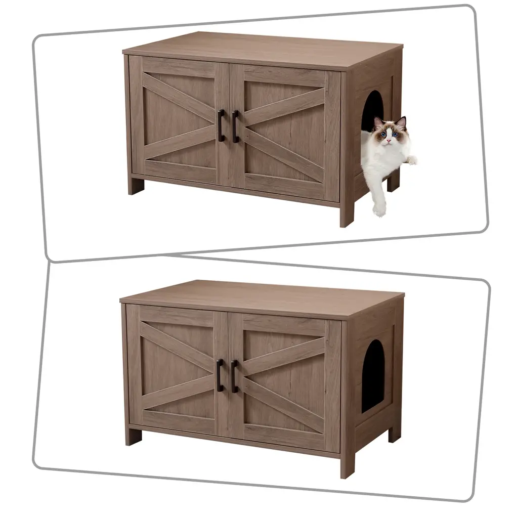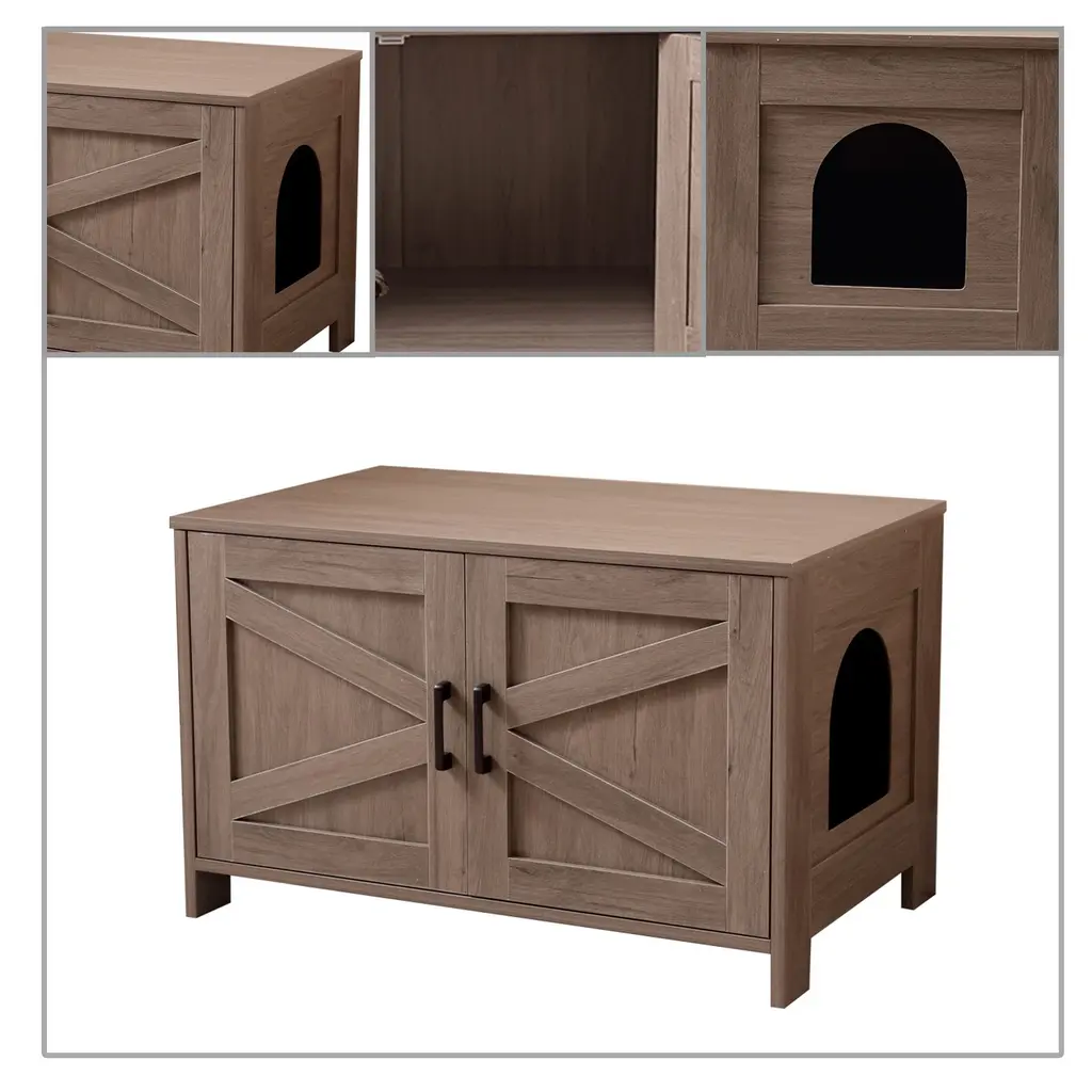 Classic Wooden Cat Litter Box House With Two Front Doors - Greige