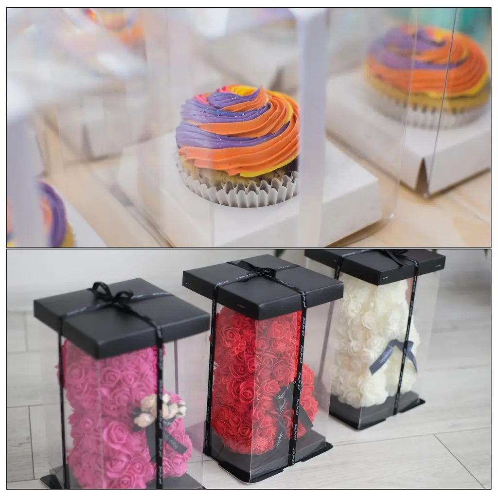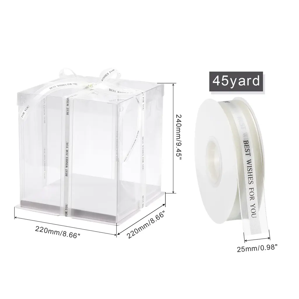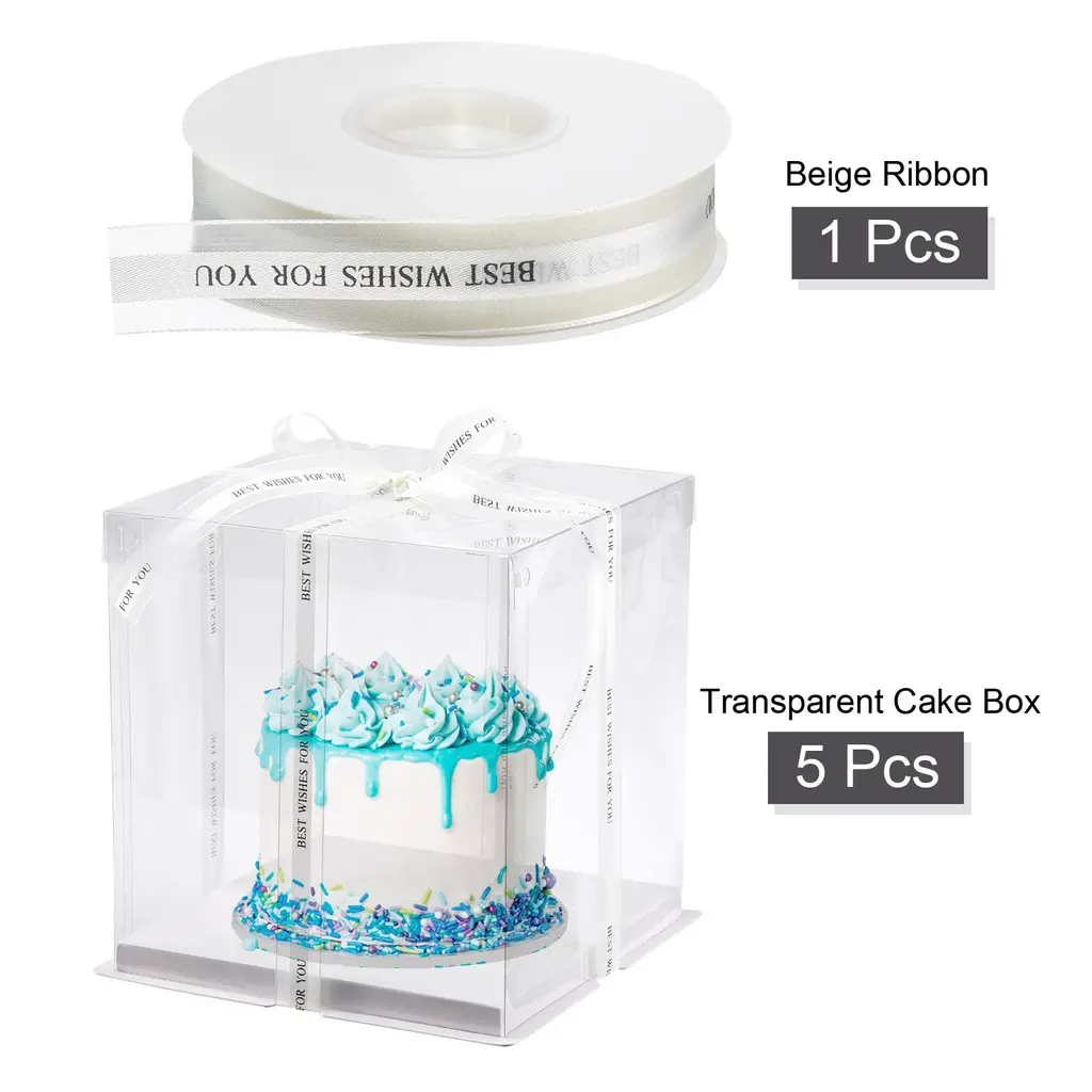 Good Material: Made of a combination of PET materials and cardboard, this clear cake box offers a sturdy and durable construction.Stylish and Clear Design: With its transparent construction, this clear cake box allows for a visual appealing presentation of your cakes or desserts. The sleek design adds a touch of elegance to any occasion.Easy to Install: This clear cake box is designed for easy and hassle-free assembly, saving you time and effort. Simply fold the box into shape. The double-sided protective film around the edge, remember to tear off before use.Wide Application: This clear cake box is not limited to just cakes. Its spacious interior can accommodate various desserts, such as cupcakes, pastry, or even small gifts. Suitable for occasions such as birthdays, weddings, Thanksgiving, Halloween, Christmas, anniversary, etc.Specification:Material: PET + Cardboard , PolyesterColor:WhiteSize:220x220x240mm/8.66x8.66x9.45"(L x W x H),45 yard x25mmPackage Content:5pcs x Transparent Cake Box, 1pcs x Beige Ribbon