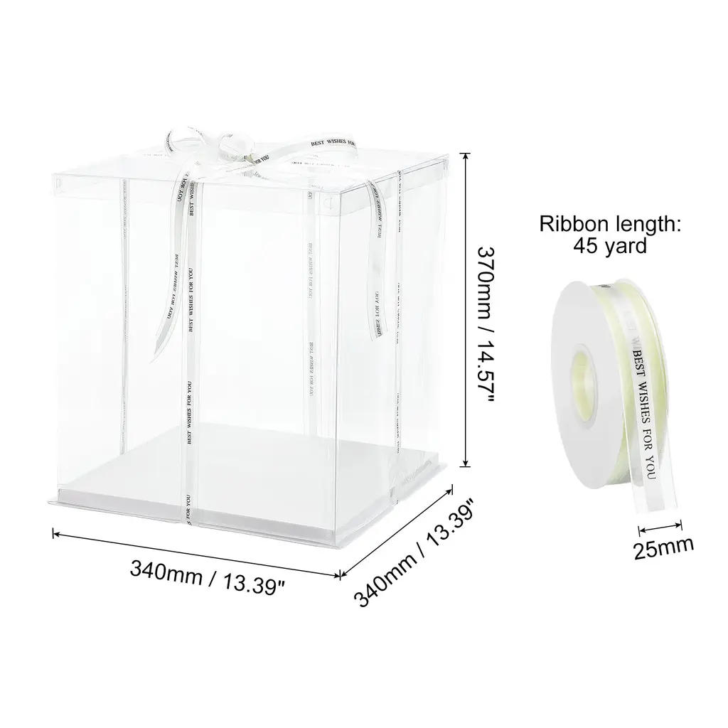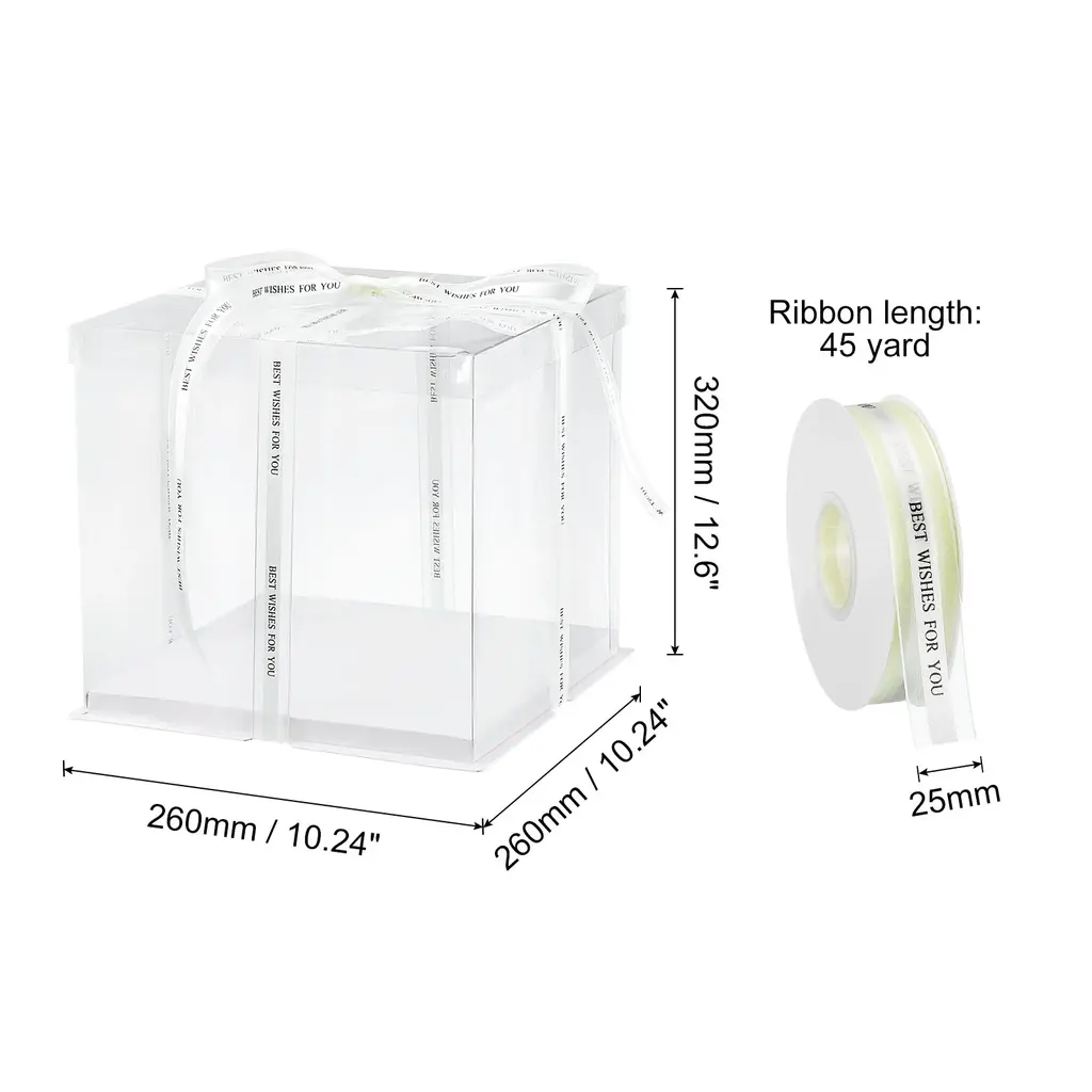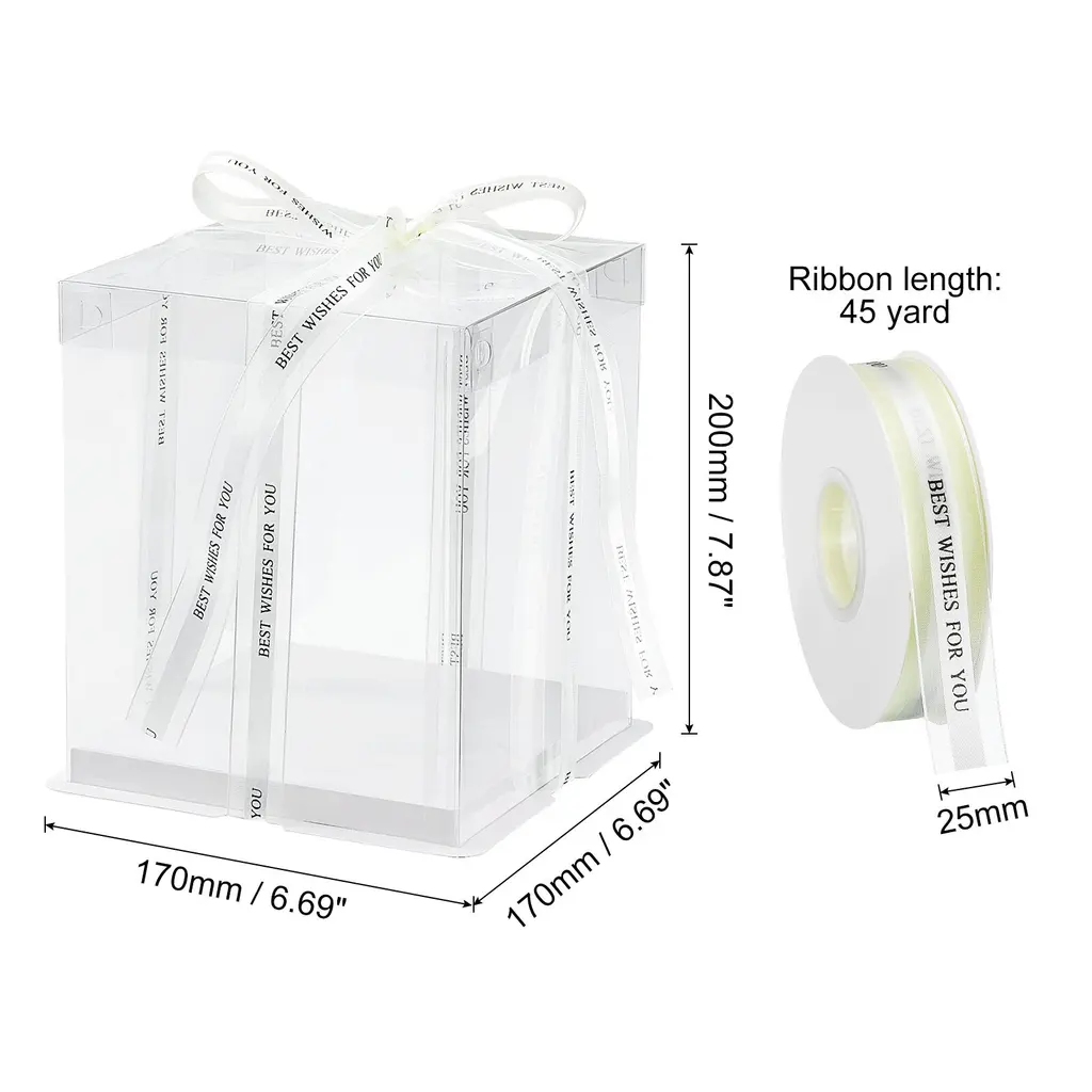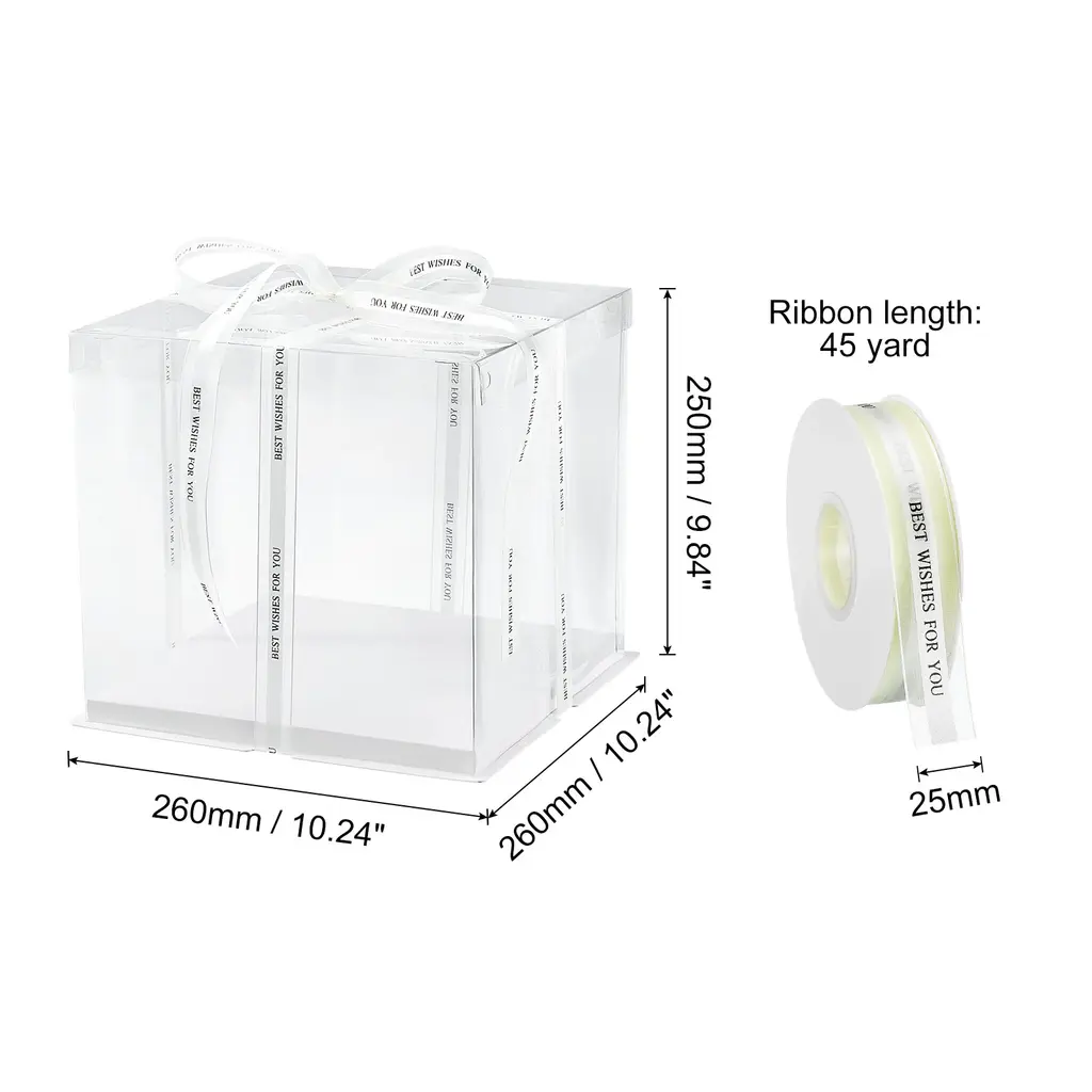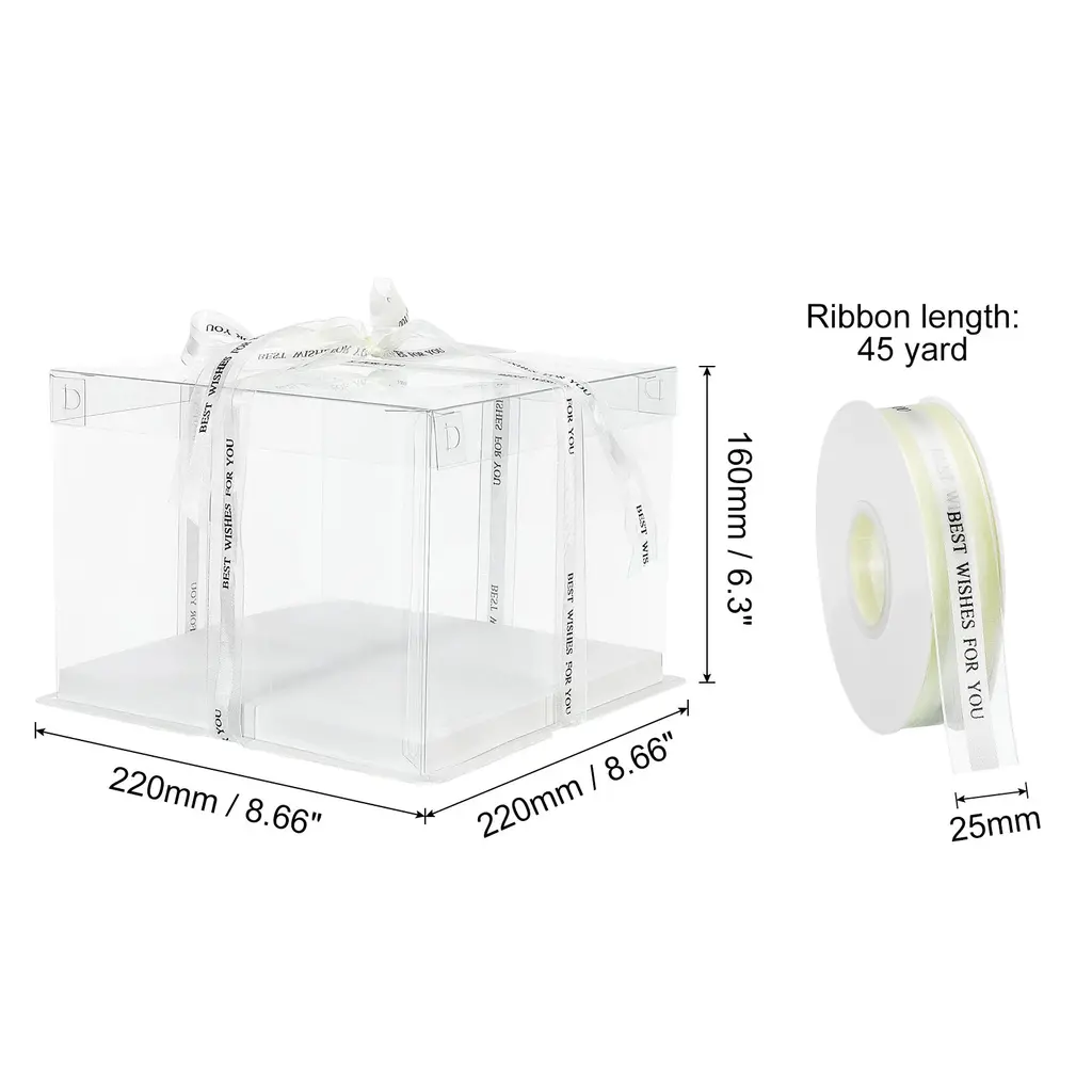 Good Material: Made of a combination of PET materials and cardboard, this clear cake box offers a sturdy and durable construction.Stylish and Clear Design: With its transparent construction, this clear cake box allows for a visual appealing presentation of your cakes or desserts. The sleek design adds a touch of elegance to any occasion.Easy to Install: This clear cake box is designed for easy and hassle-free assembly, saving you time and effort. Simply fold the box into shape. The double-sided protective film around the edge, remember to tear off before use.Wide Application: This clear cake box is not limited to just cakes. Its spacious interior can accommodate various desserts, such as cupcakes, pastry, or even small gifts. Suitable for occasions such as birthdays, weddings, Thanksgiving, Halloween, Christmas, anniversary, etc.Specification:Material: PET + Cardboard , PolyesterColor: WhiteSize:170 x 170 x 120mm / 6.69" x 6.69" x 4.72" (L x W x H), 45 yard x 25mmPackage Content:6pcs x Transparent Cake Box, 1pcs x Beige Ribbon