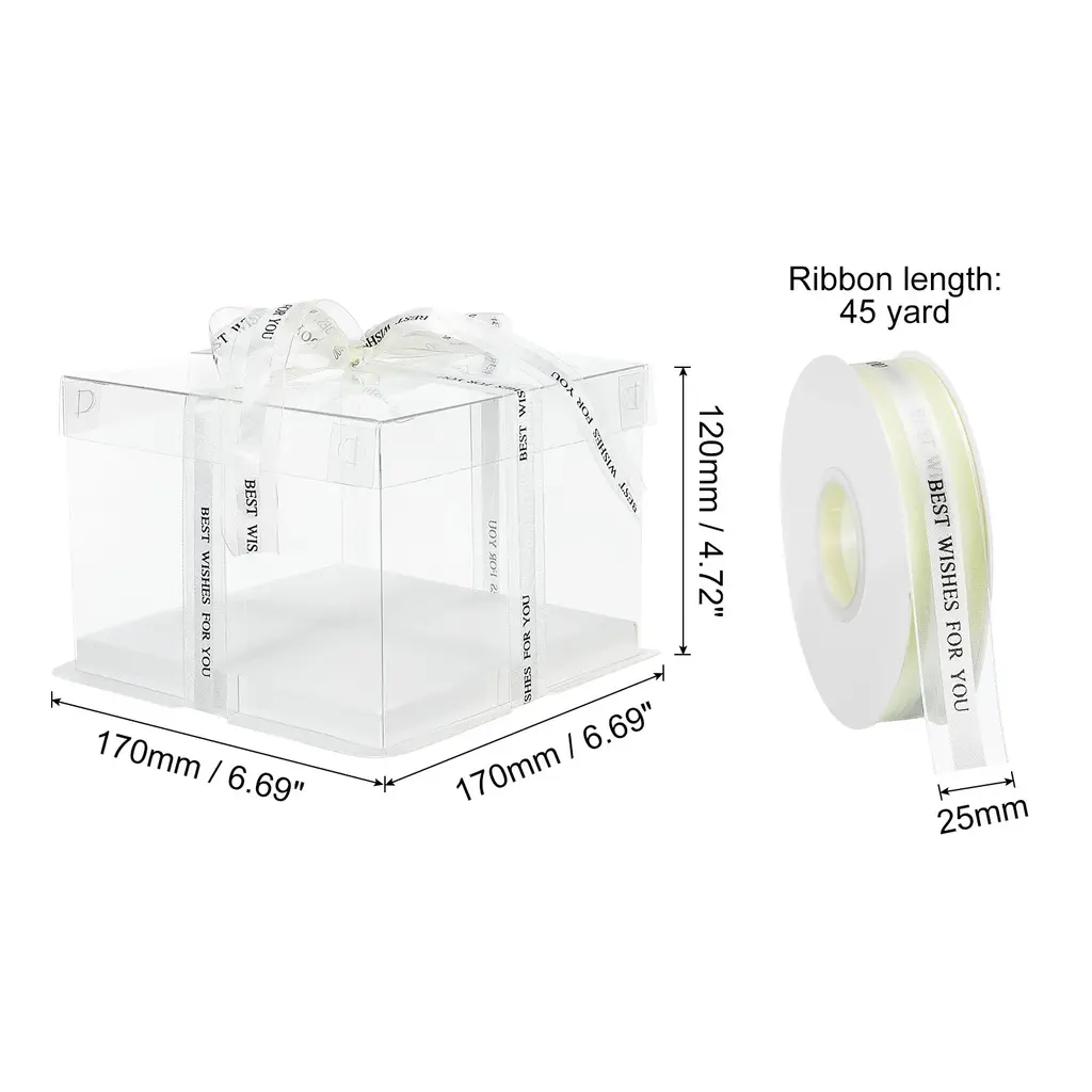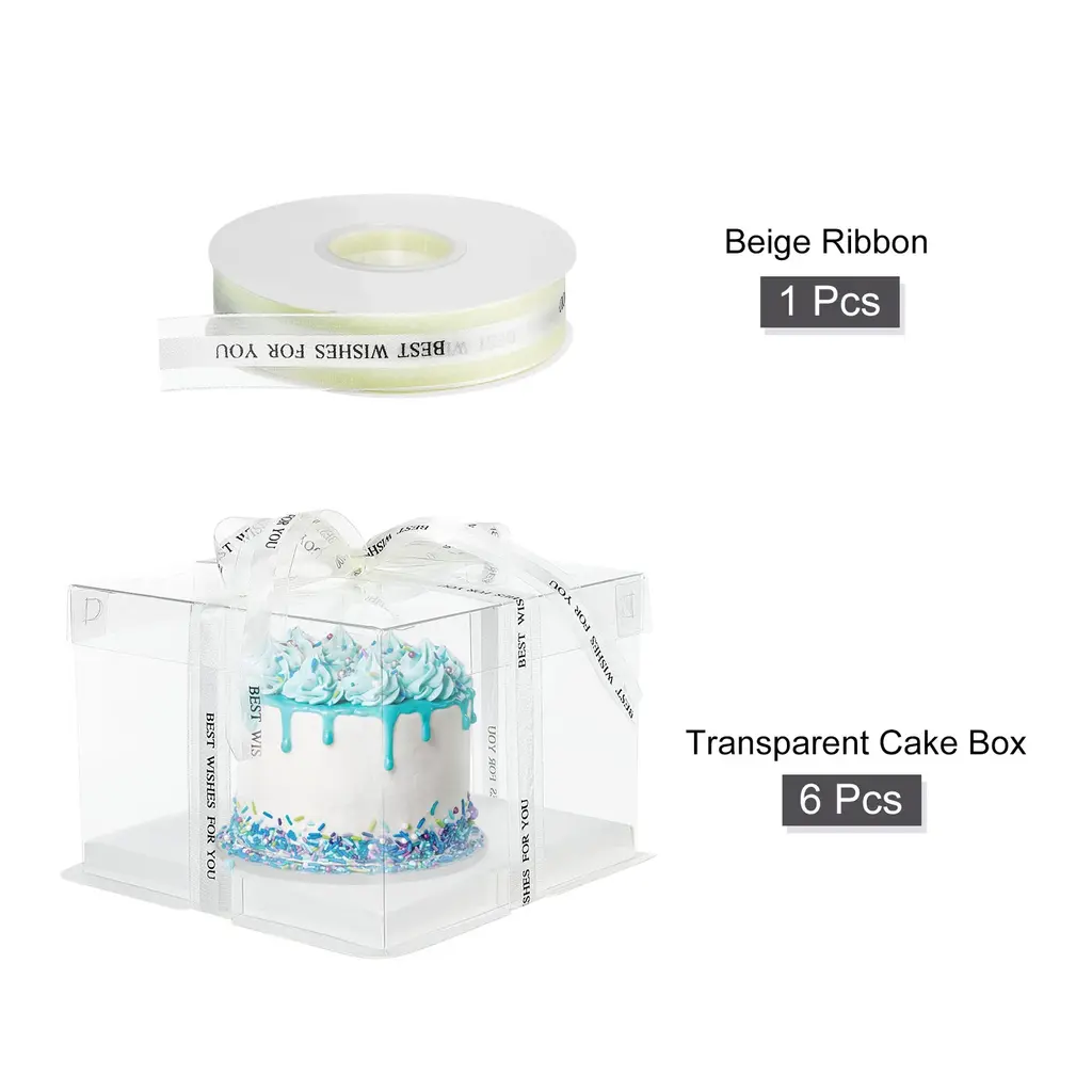 Good Material: Made of a combination of PET materials and cardboard, this clear cake box offers a sturdy and durable construction.Stylish and Clear Design: With its transparent construction, this clear cake box allows for a visual appealing presentation of your cakes or desserts. The sleek design adds a touch of elegance to any occasion.Easy to Install: This clear cake box is designed for easy and hassle-free assembly, saving you time and effort. Simply fold the box into shape. The double-sided protective film around the edge, remember to tear off before use.Wide Application: This clear cake box is not limited to just cakes. Its spacious interior can accommodate various desserts, such as cupcakes, pastry, or even small gifts. Suitable for occasions such as birthdays, weddings, Thanksgiving, Halloween, Christmas, anniversary, etc.Specification:Material: PET + Cardboard , PolyesterColor: WhiteSize:170 x 170 x 120mm / 6.69" x 6.69" x 4.72" (L x W x H), 45 yard x 25mmPackage Content:6pcs x Transparent Cake Box, 1pcs x Beige Ribbon