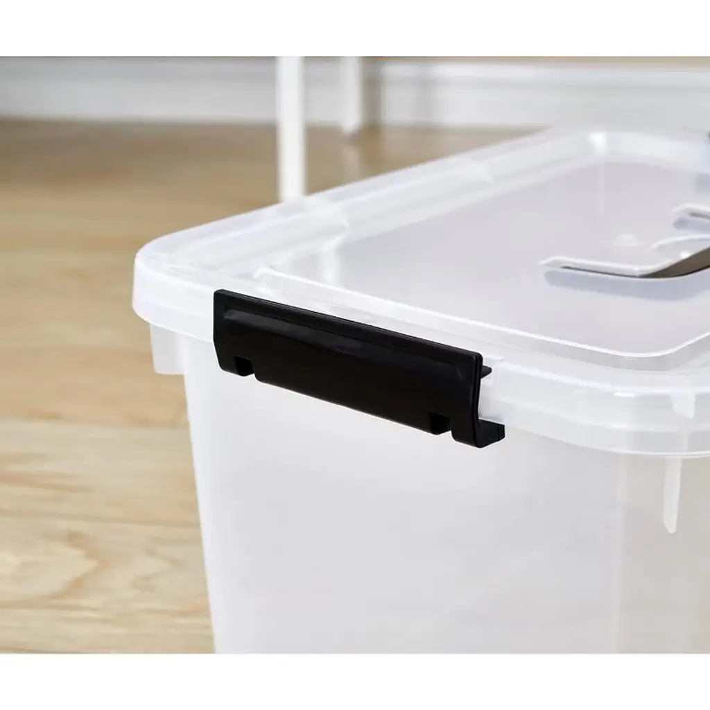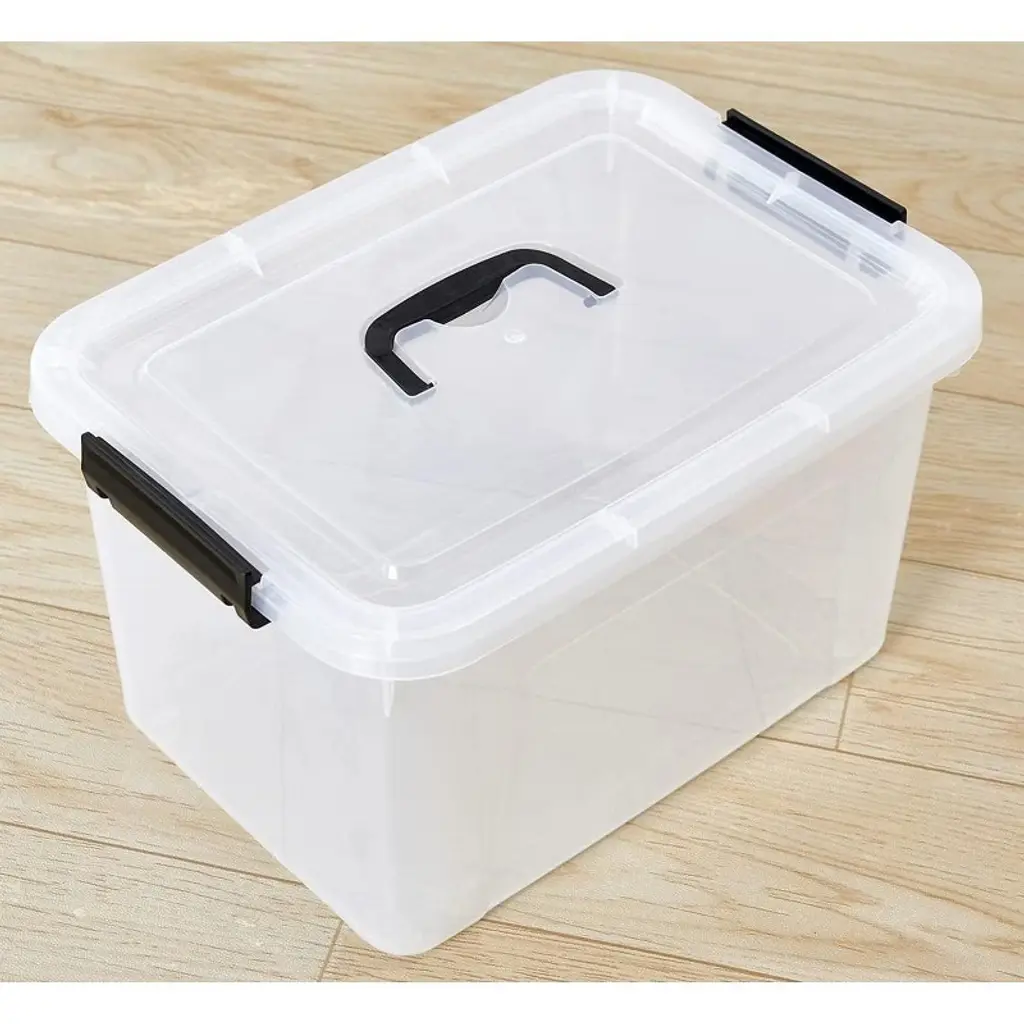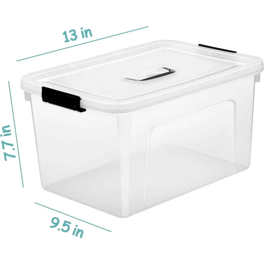 Storage box outside size: 13"x9.5"x7.7"; Inside size:11.4"x8"x7.3". Clear storage latch bin with clear lid, black handle, volume 12 Qt. Made of durable plastic. High quality material product impact resistant. Plastic clear latches box large enough to organizing towel, toy, books, files. Large clear storage bin perfect for using in bedroom, garage, bathroom, office.