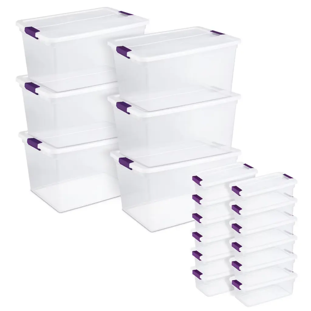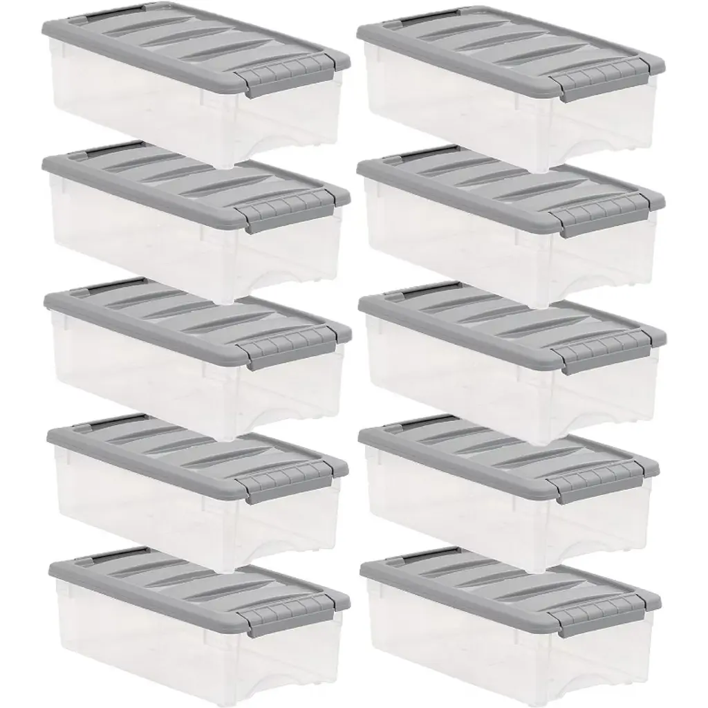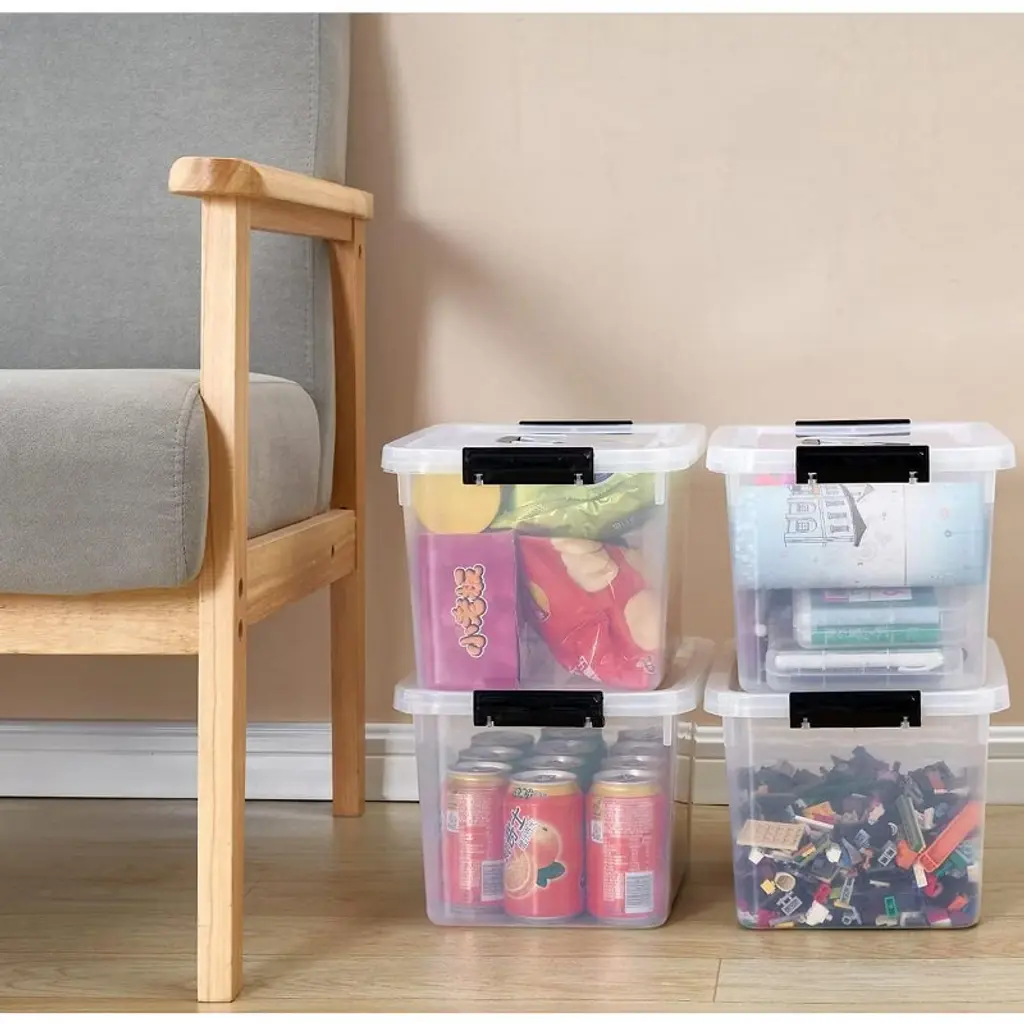 Storage box outside size: 13"x9.5"x7.7"; Inside size:11.4"x8"x7.3". Clear storage latch bin with clear lid, black handle, volume 12 Qt. Made of durable plastic. High quality material product impact resistant. Plastic clear latches box large enough to organizing towel, toy, books, files. Large clear storage bin perfect for using in bedroom, garage, bathroom, office.