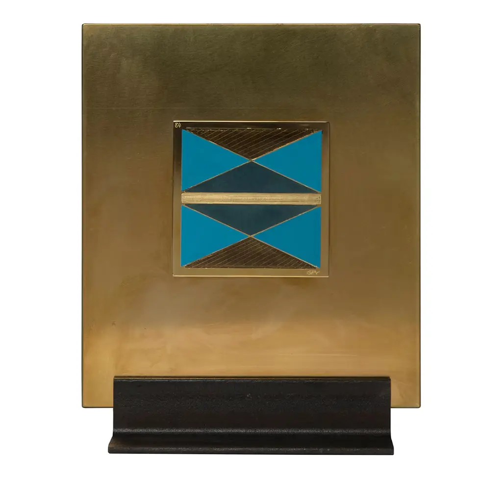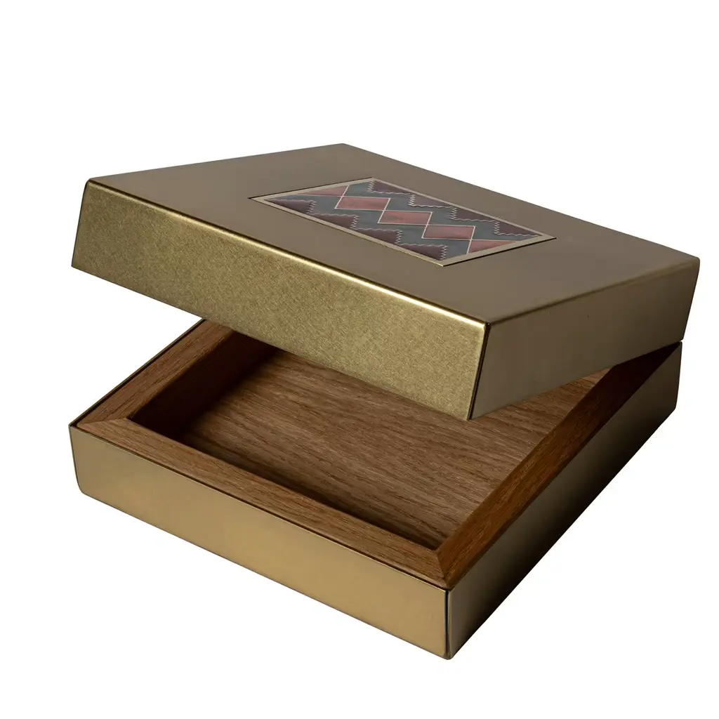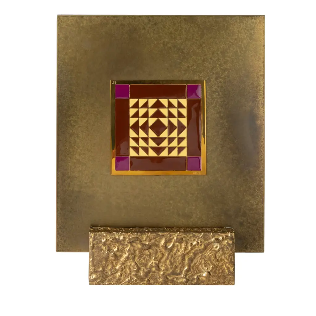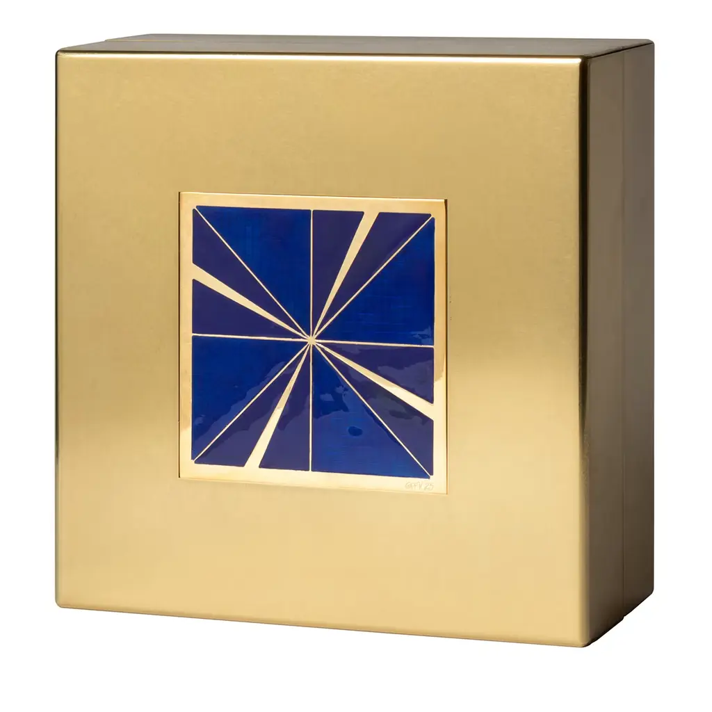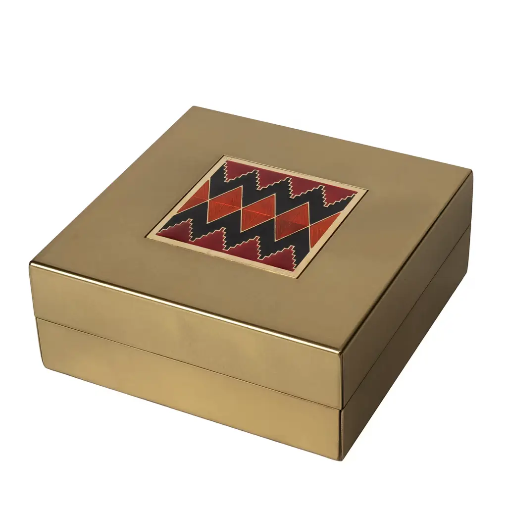 The “Carré Cloisonné boxes” by Piccoli Smalti are refined objects designed to blend functionality and a jewel- like aesthetic. The square box is coated in satin brass. The top cover is decorated with a precious carré cloisonné handcrafted in Tuscany with red and black nuances geometric figures colored. The inside part is displaying a single capacious compartment in order to accomplish different uses.