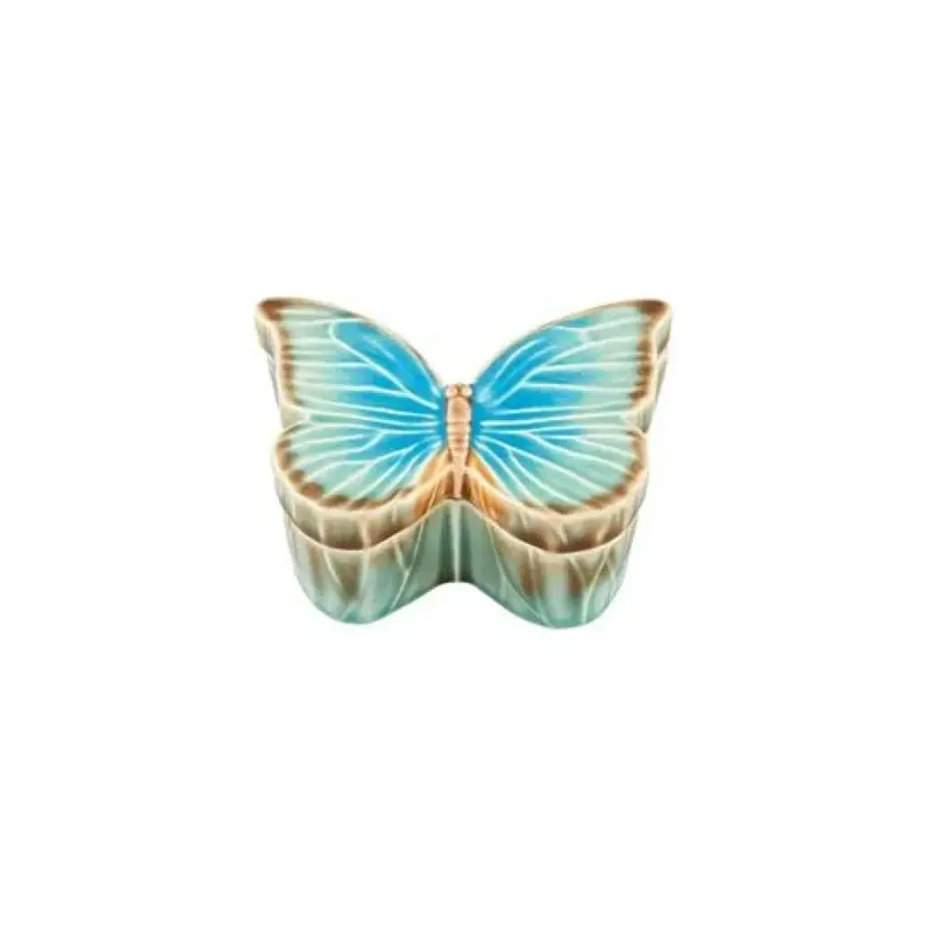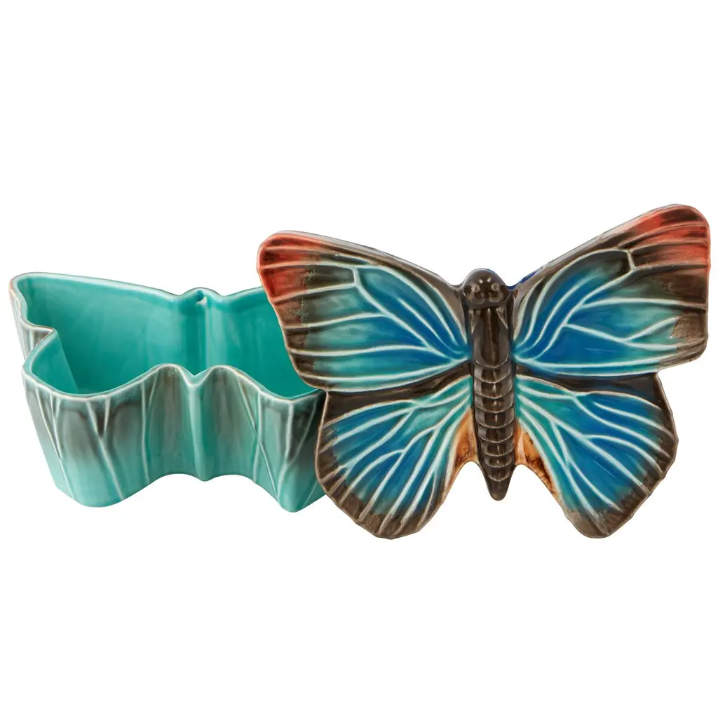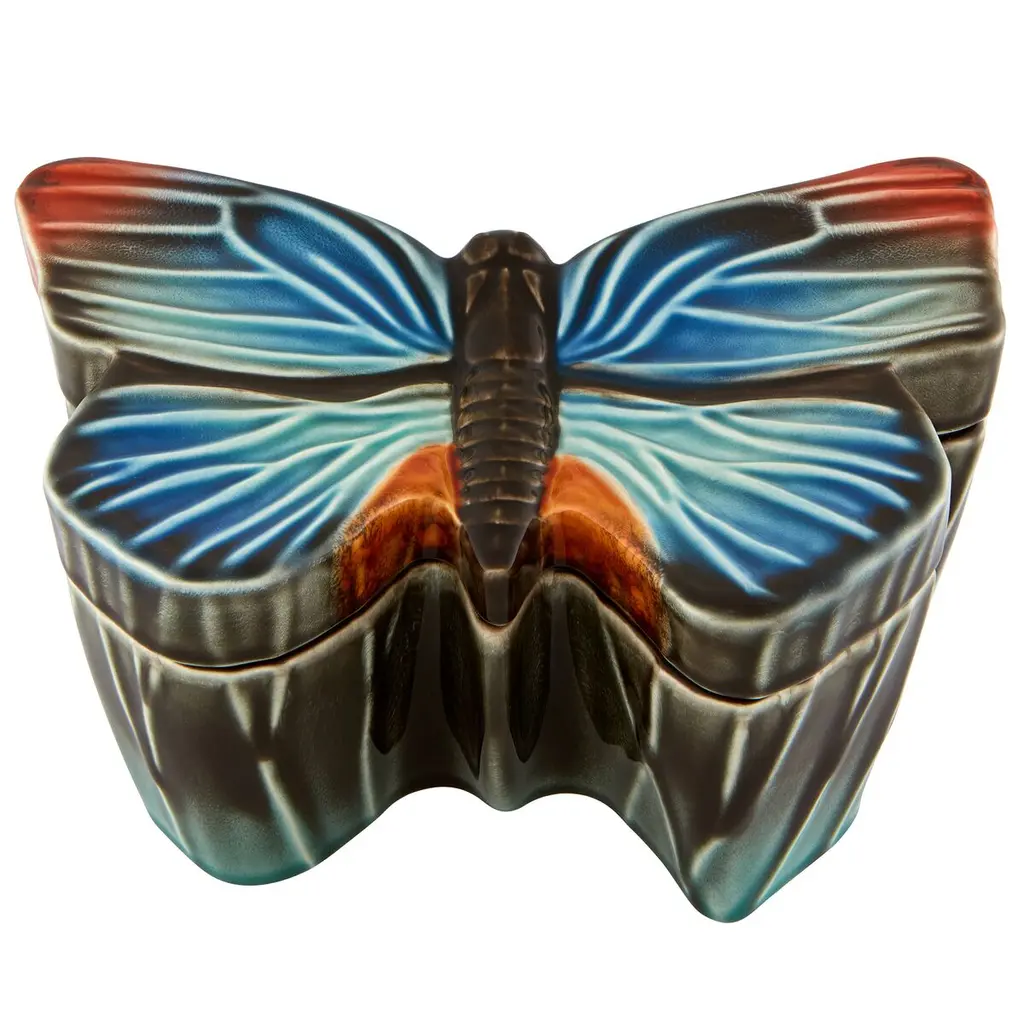 Supermodel Claudia Schiffer collaborated with Bordallo Pinheiro on this lidded earthenware box shaped like a butterfly. The box was hand-painted to achieve the graceful blending of colors that accentuates its fine detailing.
