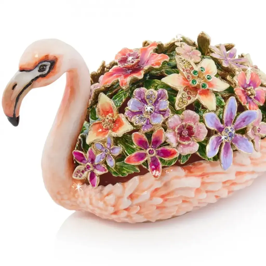 Immerse yourself in the enchanting beauty of nature with the Clover Floral Flamingo Box. Delicately hand-painted flowers adorn the lid, capturing the essence of a blooming garden. The box's graceful flamingo shape not only safeguards your keepsakes but also brings the elegance of these majestic birds into your living space, creating a truly captivating and picturesque addition to your décor.