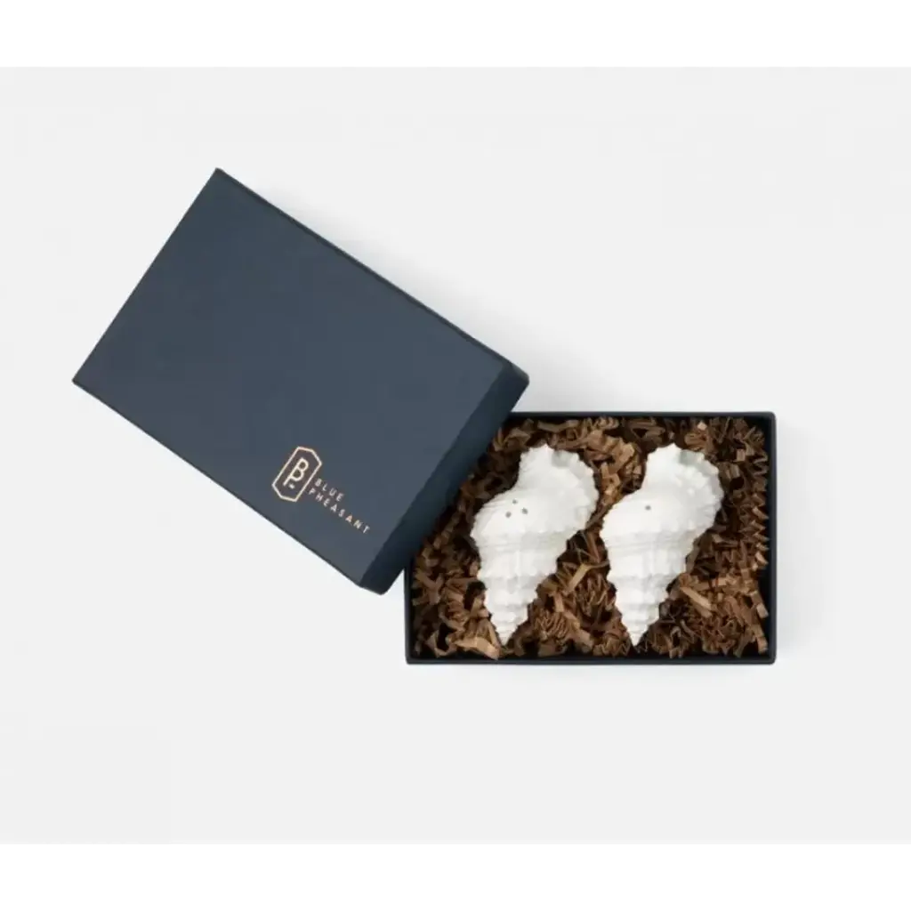 Highly detailed, handcrafted porcelain in the shape of conch shells. Blue Pheasant's products are handmade with care by artisans using natural materials. They are not mass produced, so variation between products should be expected, and this is why we love them! It is these irregularities that makes Blue Pheasant what it is—a special brand whose collections are distinctly handmade, full of charm and originality you’ll never find in machine-made products.