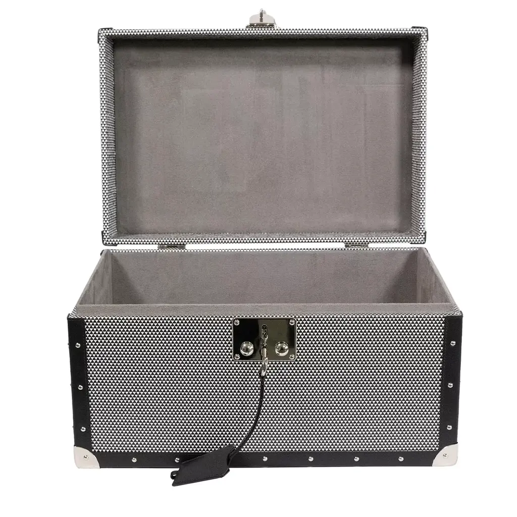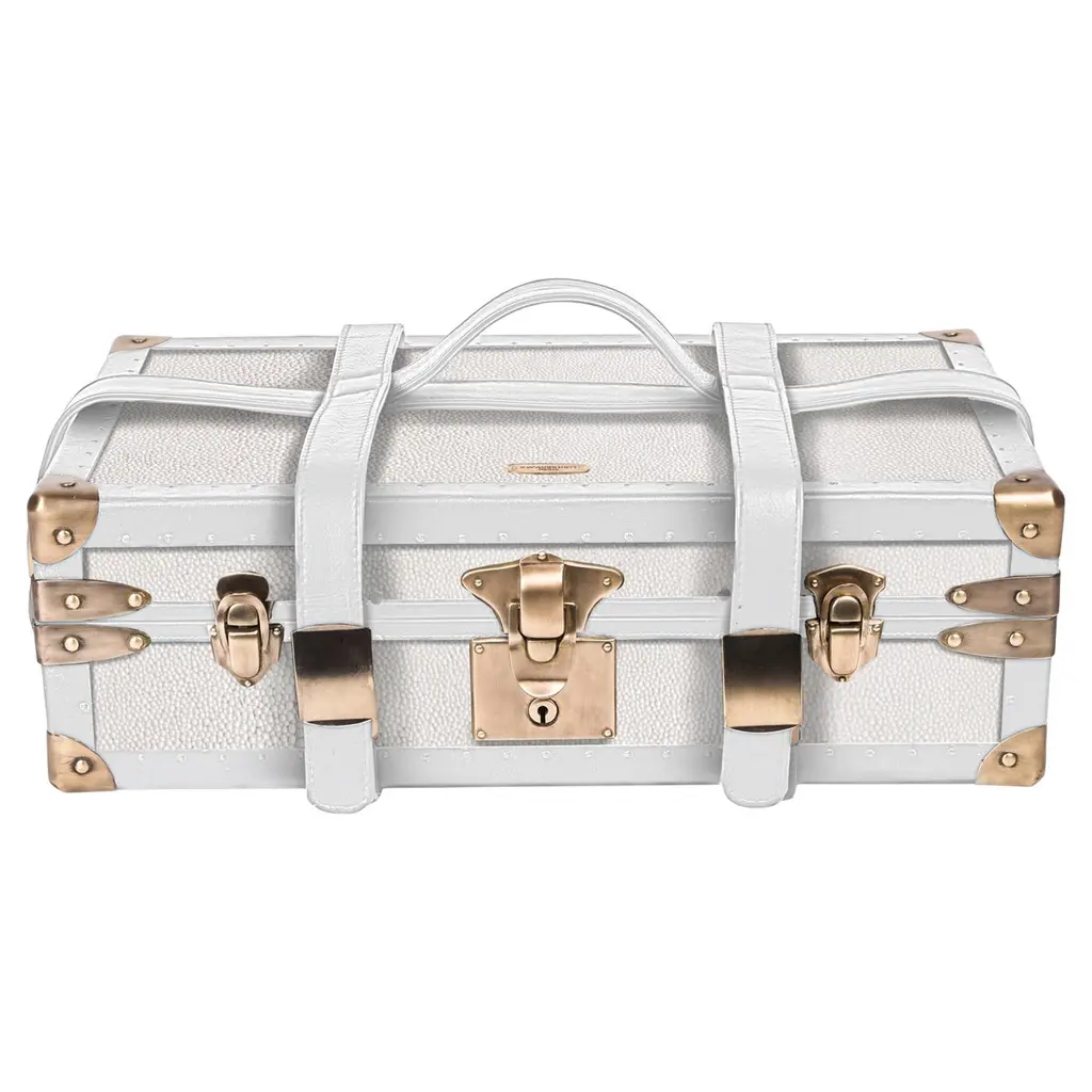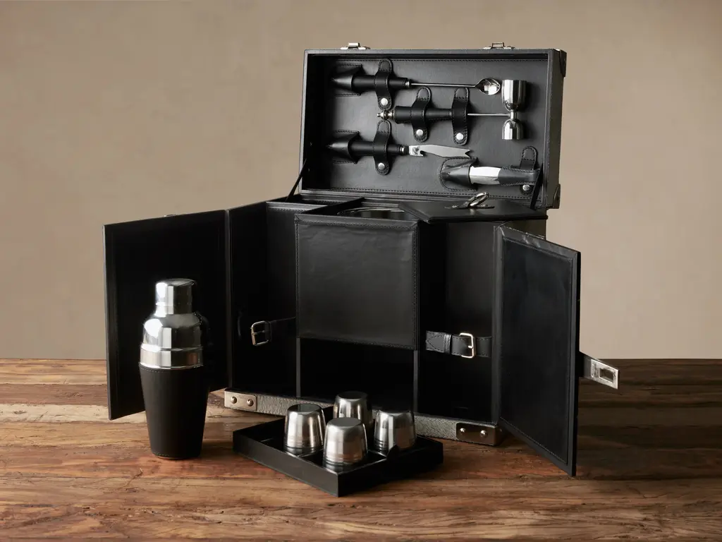 Whether you’re traveling for a holiday or headed to a friend’s backyard barbeque, our Colette Bar Box provides portable cocktail service in style. Crafted from hair on hide and leather, this one-of-a-kind bar box includes a stainless-steel cocktail shaker, four glasses, and other bar tools so you can shake, stir, and serve wherever you may be. Box is crafted by artisans in India from natural hair on hide and leather. Barware is crafted from stainless steel and leather. Box includes one cocktail shaker, four glasses, one pairing knife, one double-sided jigger, one stirrer, tongs, and ice bucket. Each glass has a 4.75 fl. oz. liquid capacity. Due to its natural hide, each piece may vary in shading, hair length, and texture, making it a unique work of art. No two bar boxes will be exactly alike. Food safe.