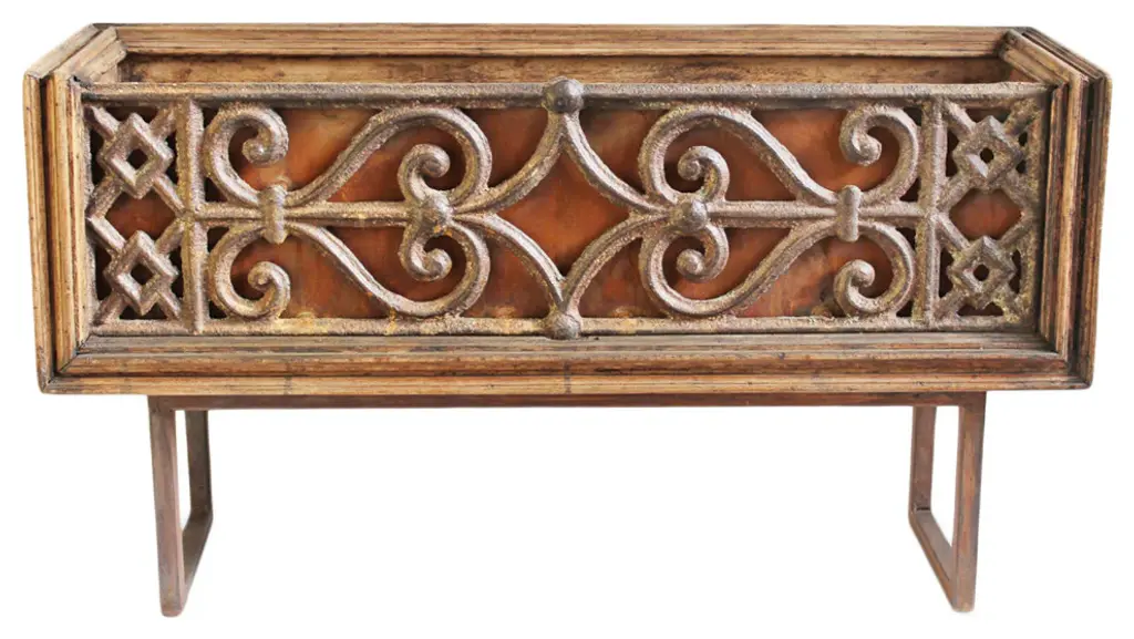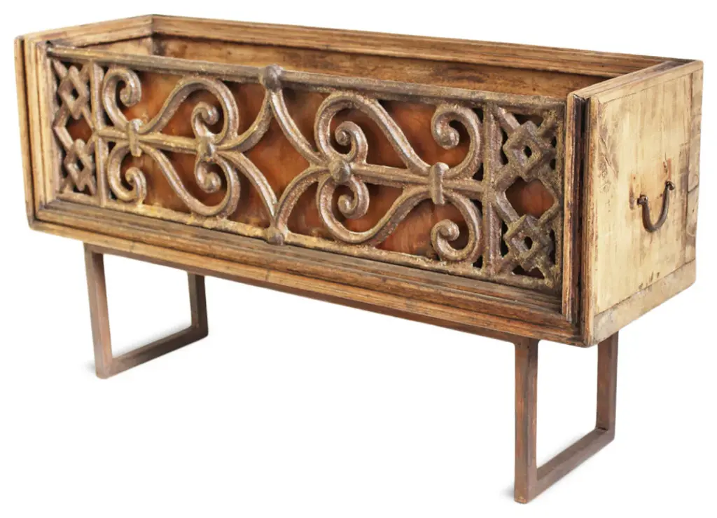 Consigned original cast iron balustrade railing panel inset into old wood box. Iron handles and iron U shape support legs. Raw aged wood and iron finish. Can be used indoors or out as a decorative box or planter.Condition: Great, with signs of age and useOrigin: IndiaEra: Mid 1900''s