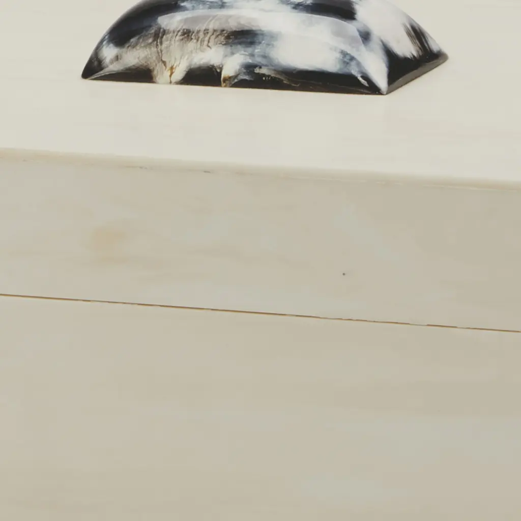 This sophisticated box in clean, cream resin is delicately accented with the perfect horn accent. This refined design shows restraint making it an elegant addition to your coffee table.