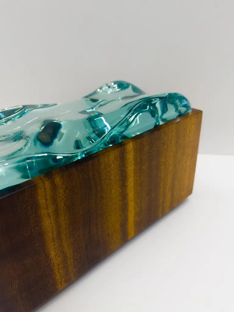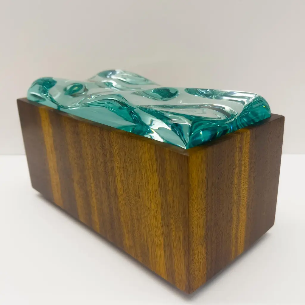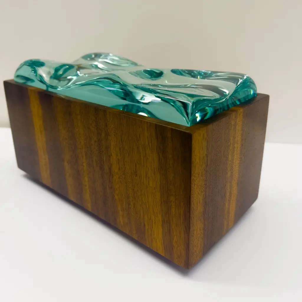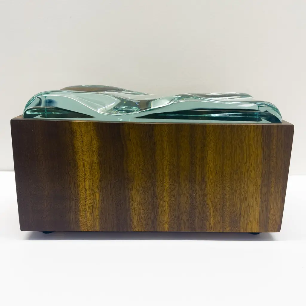 2023 Collection of Decorative boxes by Ghiró Studio.The type of craftsmanship and the materials used for the production make this box a unique object, in fact it is impossible to make two perfectly identical ones.This box was made by working Bois De Rose wood. This precious wood owes its value both to the particularity of its veins and to its intense rose fragrance which is released during processing and whose essence remains for several years.The wood has been smoothed and polished to bring out its natural color and the golden veins that illuminate and embellish it.The lid of this box is entirely hand-worked crystal from a crystal rock. The crystal has an intense aquamarine color and has been sculpted to recreate waves.The originality, elegance and preciousness of this box make it perfect for decorating any space. It is also ideal as a jewelry box.This box is new and in excellent condition. Every imperfection is to be considered a value and not a defect, a guarantee of the extreme naturalness and craftsmanship of our product. These items are handmade and will not be all exactly the same.