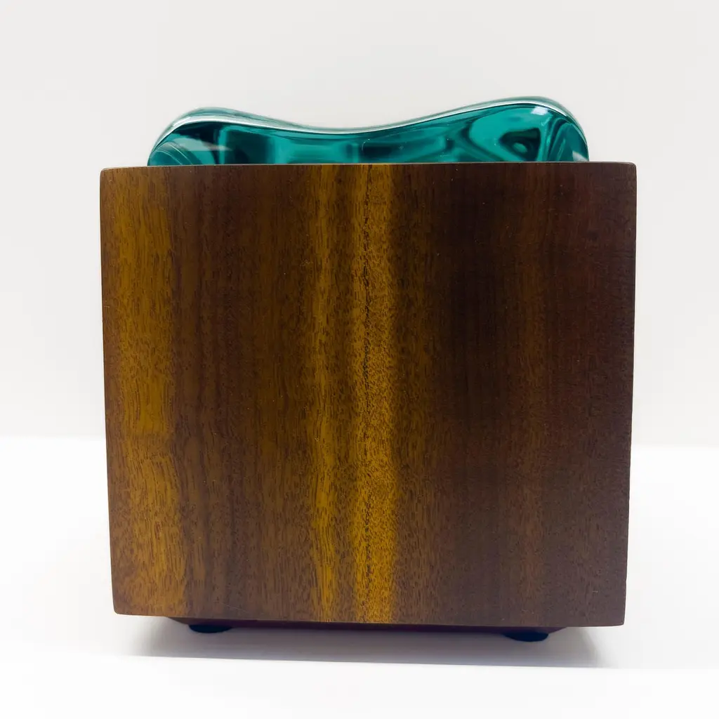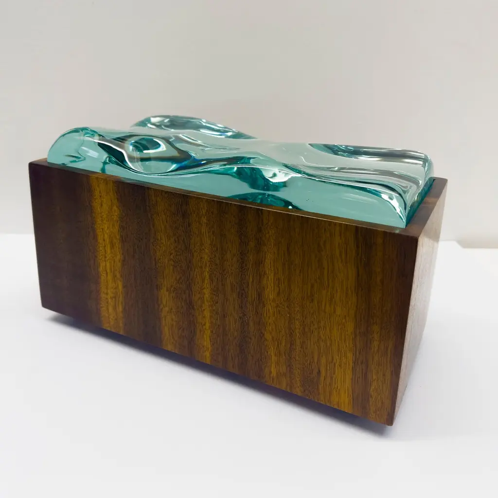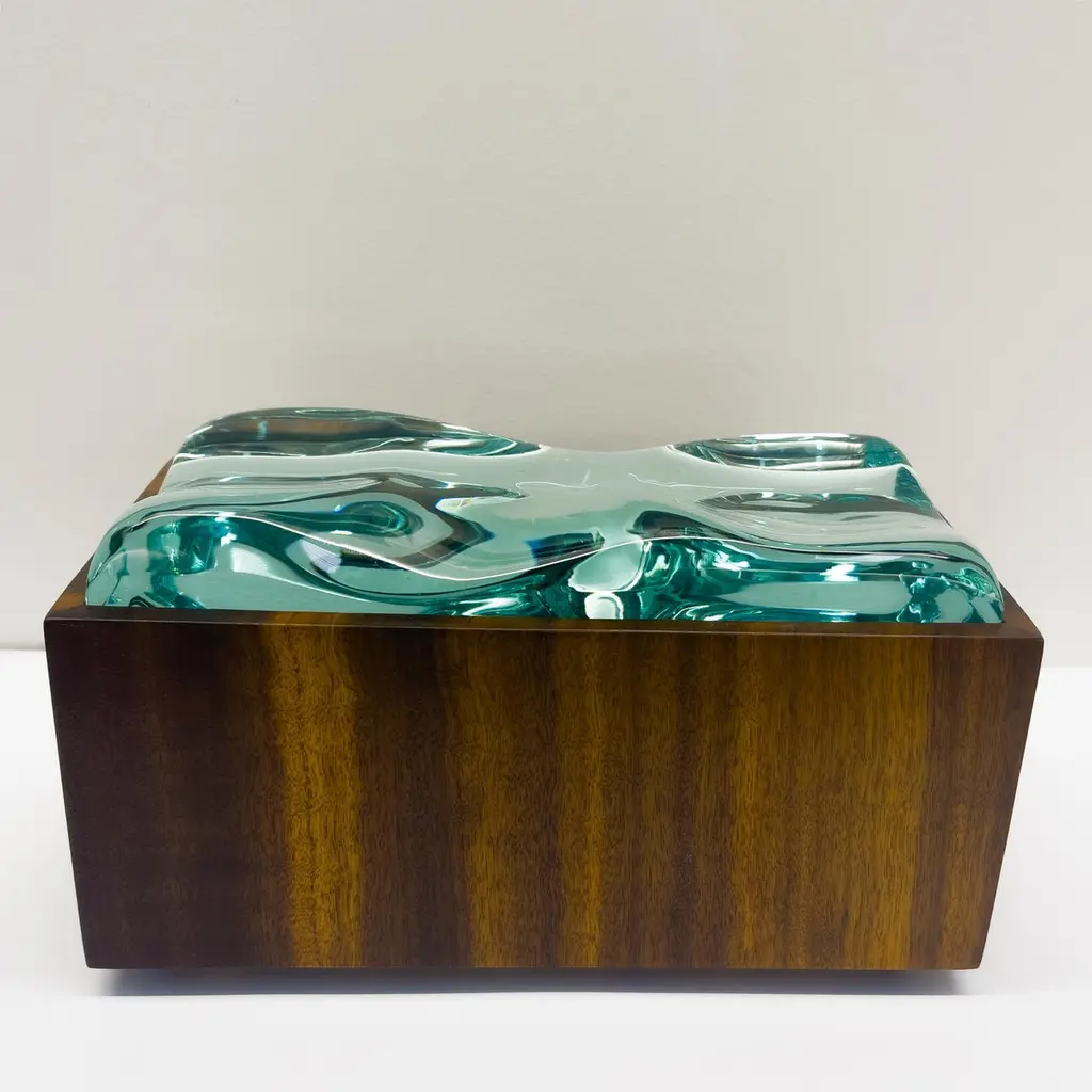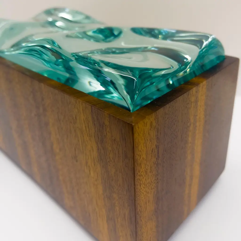 2023 Collection of Decorative boxes by Ghiró Studio.The type of craftsmanship and the materials used for the production make this box a unique object, in fact it is impossible to make two perfectly identical ones.This box was made by working Bois De Rose wood. This precious wood owes its value both to the particularity of its veins and to its intense rose fragrance which is released during processing and whose essence remains for several years.The wood has been smoothed and polished to bring out its natural color and the golden veins that illuminate and embellish it.The lid of this box is entirely hand-worked crystal from a crystal rock. The crystal has an intense aquamarine color and has been sculpted to recreate waves.The originality, elegance and preciousness of this box make it perfect for decorating any space. It is also ideal as a jewelry box.This box is new and in excellent condition. Every imperfection is to be considered a value and not a defect, a guarantee of the extreme naturalness and craftsmanship of our product. These items are handmade and will not be all exactly the same.
