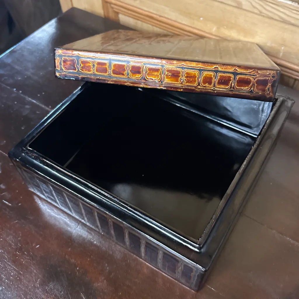 A supremely elegant black lacquer box decorated with delicate gold lines to create an organic linear horizontal pattern. These boxes from Myanmar are hand painted with stunning precision. They are feather light but make a strong visual impact with their deep saturation of color and luster - especially with the luster of gold in this pattern. This delightful box would add a refined addition to a library shelf or desk. This box could also be the ultimate gift box or storage for a treasured keepsake!
