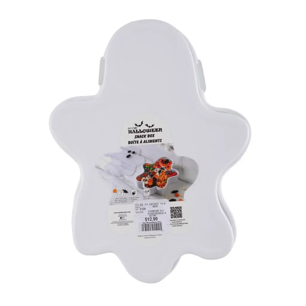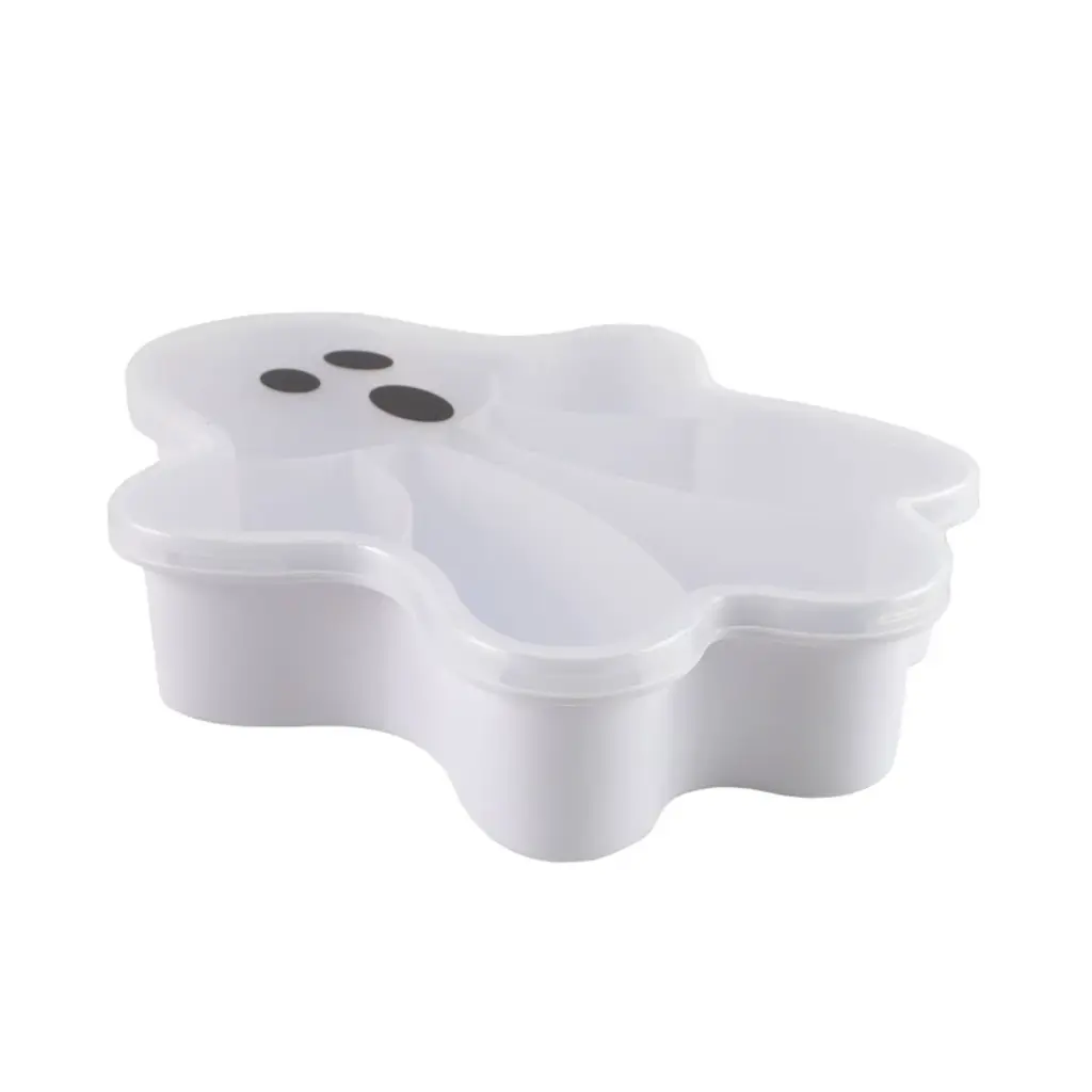 This Halloween-themed plastic snack box is shaped like a whimsical ghost, bringing a playful and spooky touch to snack time. Crafted from durable, lightweight plastic, the box features friendly face printed onto the lid. The interior includes compartments for separating different treats or snacks, making it both fun and functional. Perfectly sized for kids' lunches, party favors, or festive gatherings, this ghost-shaped box is easy to carry, clean, and reuse. Its charming design adds a delightful Halloween spirit to any occasion, making it a seasonal favorite for children and adults alike.