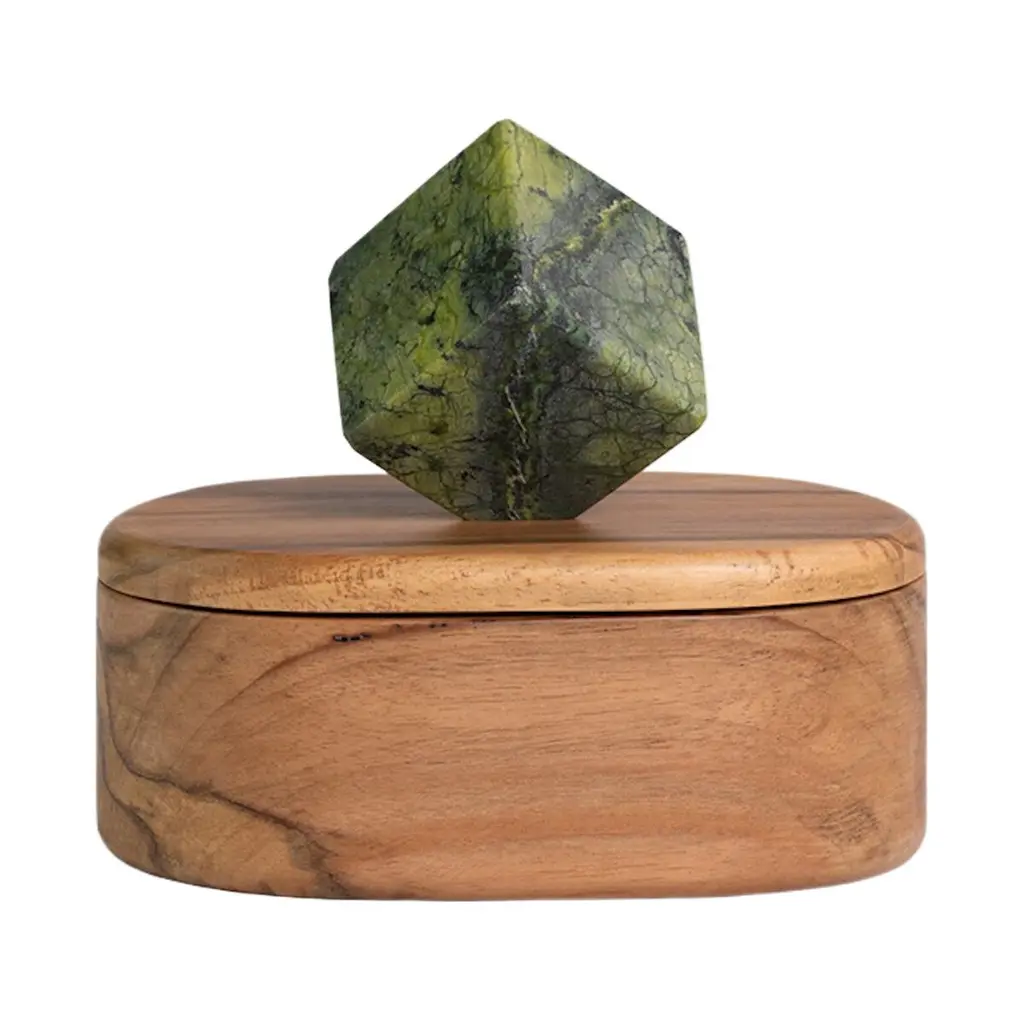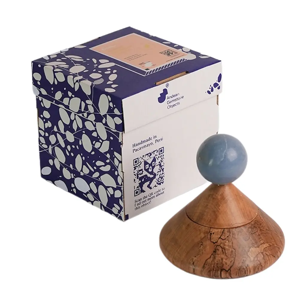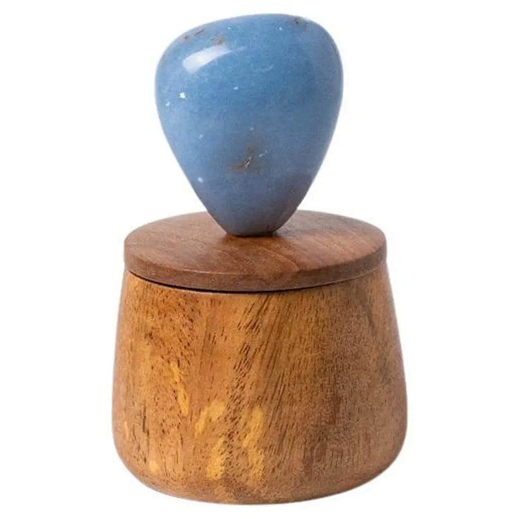 Cool cone jewel box carved from wood and gemstone. A dreamy accent for your nightstand or desk to hold jewels, airpods and more. The cone everything box catchall box is carved using traditional wood carpentry techniques in Magdalena de Cao, Perú. The sphere-shaped gemstone handle is a geometric element that makes the moment of opening it up feel extra special. Dimensions are 5 1/2″ long / 5 1/2″ wide / 5 1/2″ tall. Body and lid are carved from wood with a stone handle.