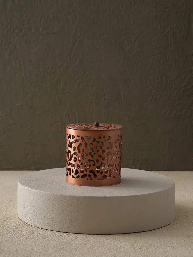 Sleek and sculptural, the Round Abstract Cut-Out Brass Box – Copper Finish brings a bold design statement to any space. Crafted from solid brass and finished in a warm copper tone, this decorative box features a dynamic abstract pattern cut through its cylindrical frame. The matching lid is topped with a smooth brass knob, adding a refined touch to its artistic form. Ideal for holding small keepsakes, jewelry, or simply styled as a standalone accent, it’s a piece that effortlessly blends function with modern elegance.