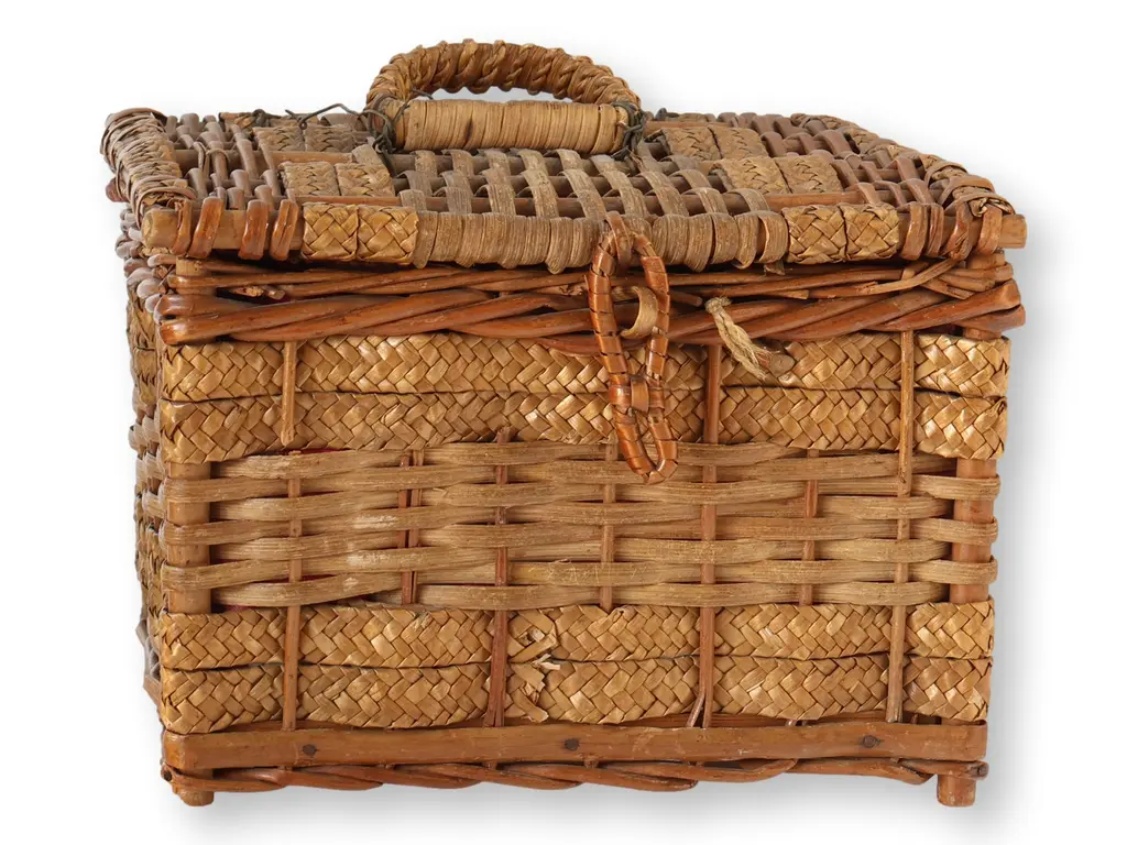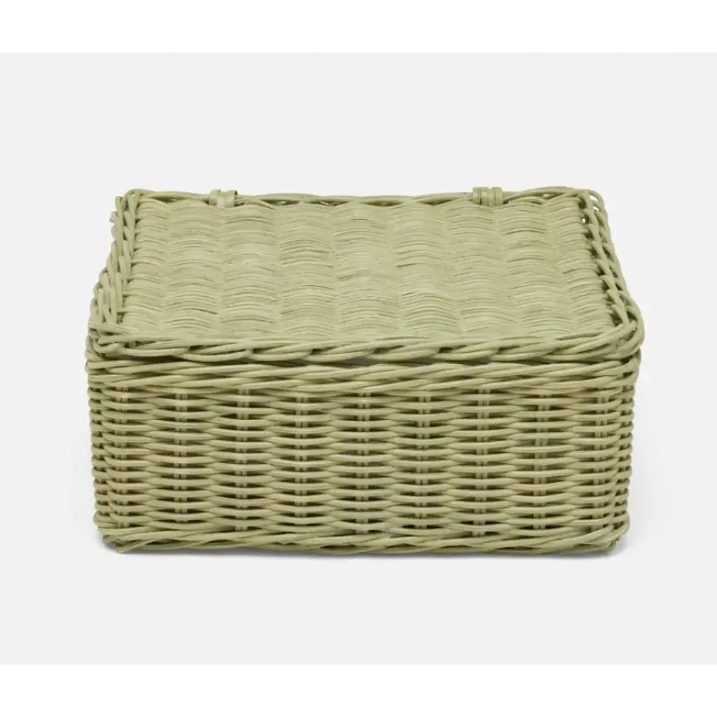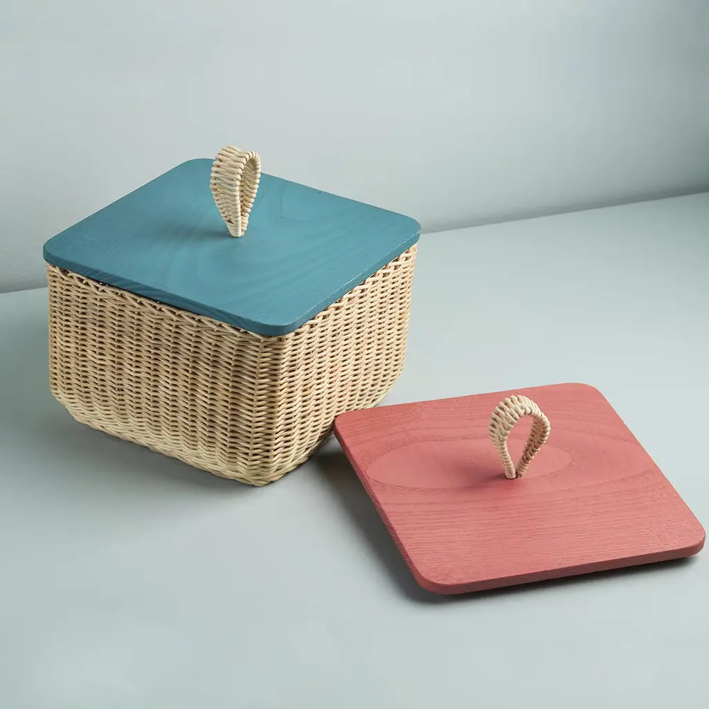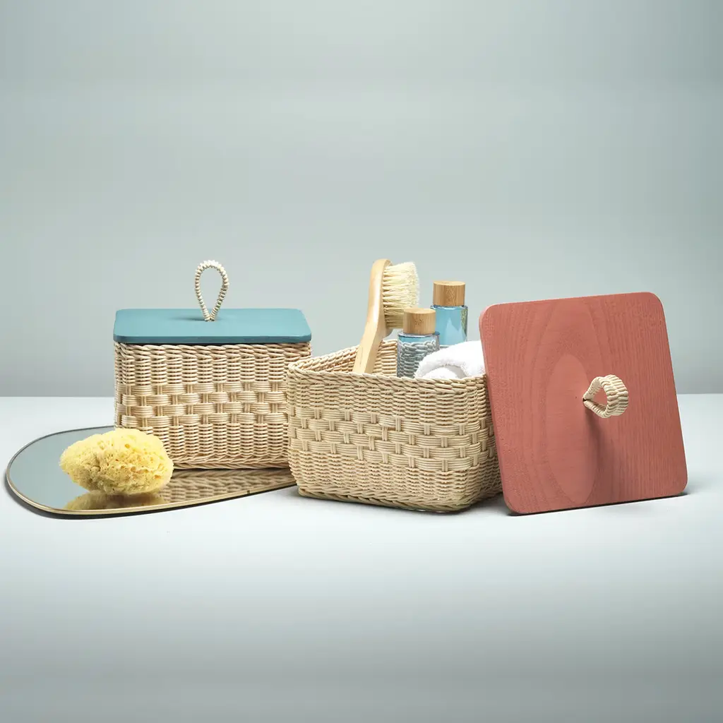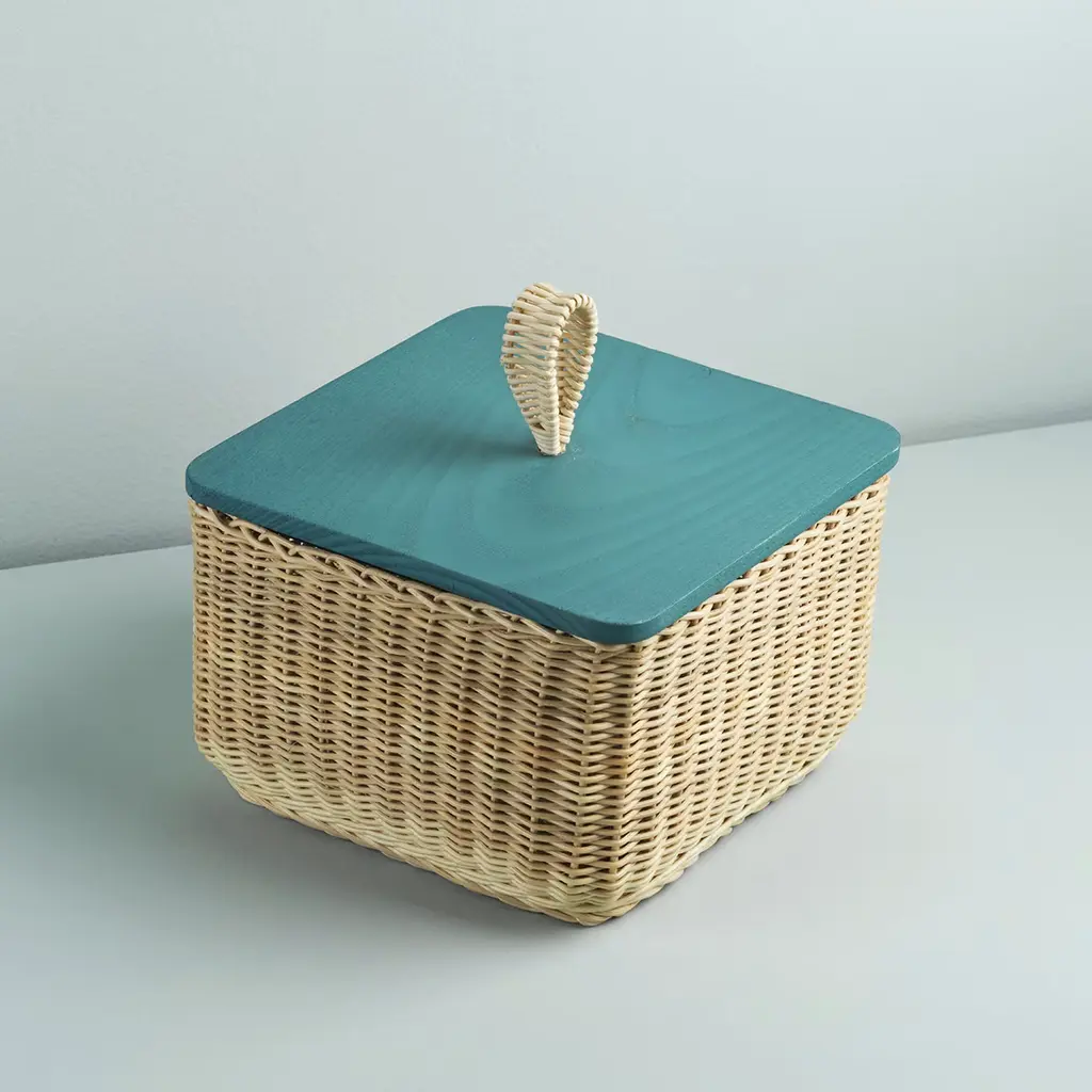 The ideal piece for storing treasured beauty essentials or sewing kits, this square-cut wicker box in drawn reed is a testament to weaving mastery. The flat lid in solid ash stained in teal following the open-pore technique is equipped with a small loop ensuring its quick and easy lifting. A water-based finish characterizes both the basket and loop, guaranteeing their durability. Hazelnut, coral, and natural finishing options are also available for the lid upon request.