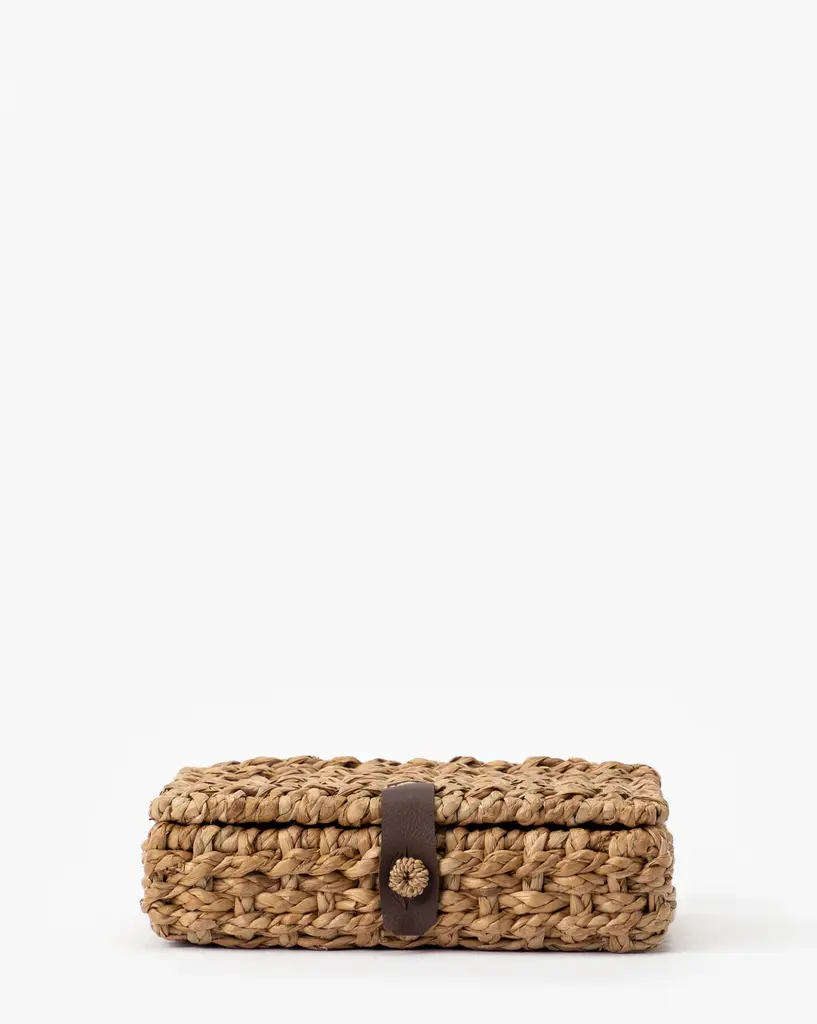 Intricately braided seagrass set inside a wire frame, the Corinne Woven Box boasts rustic yet refined detail. With a crafted leather clasp, the decorative box delicately contributes an organic feel to a shelf or console vignette.