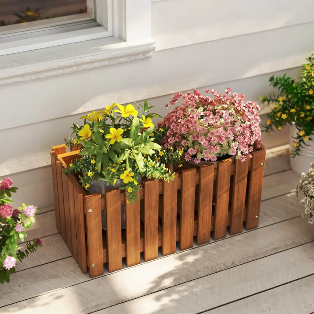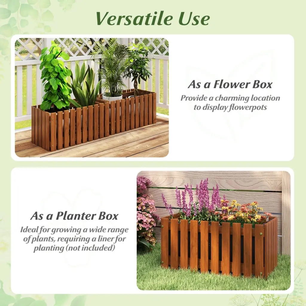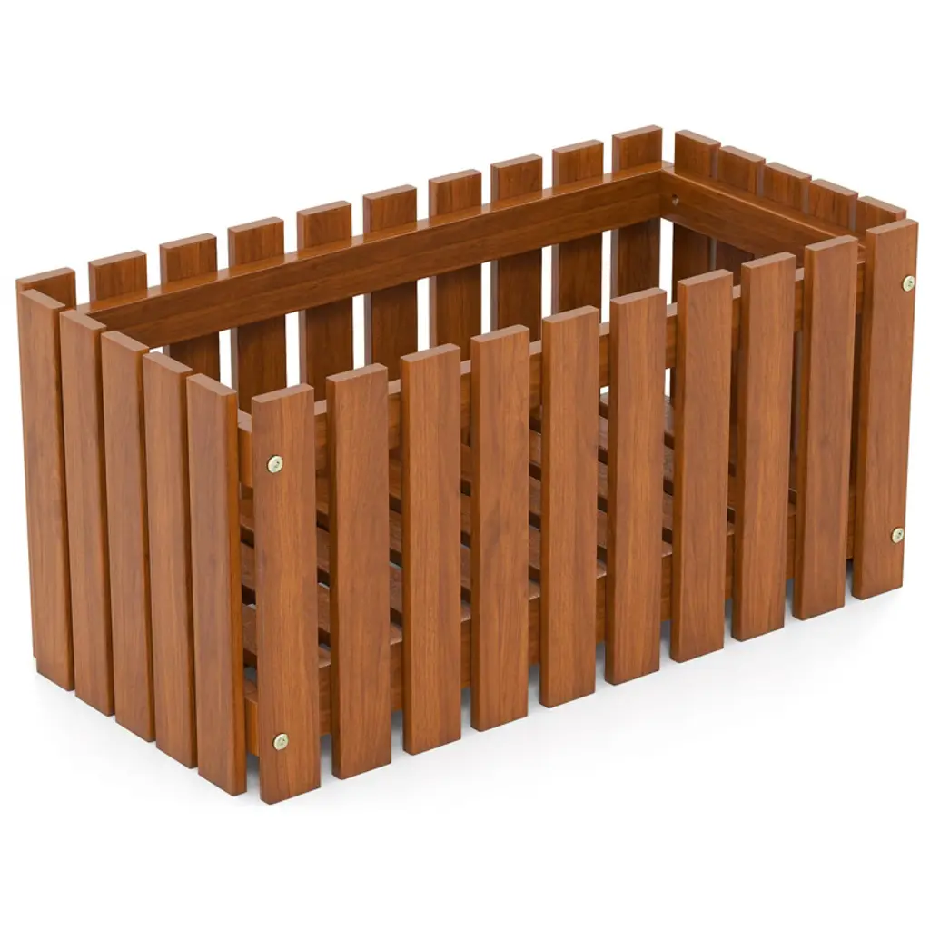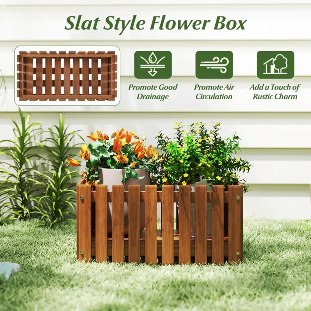 Elevate Your Gardening Game! Our slat style flower box is crafted from PEFC-certified solid wood and protected with a weather-resistant teak oil finish, ensuring durability and resilience against outdoor elements. The timeless design incorporates a practical slat style which enhances plant health by promoting adequate drainage and ventilation. Ideal for a variety of settings, from balconies and patios to indoor areas, it integrates seamlessly into both contemporary and classic decorations. Perfect for displaying decorative plants or growing an array of flowers and herbs, it offers flexibility and style in one package.FeaturesCrafted of solid wood, warp-resistant, reliable, built to last The wood surface with delicate craftsmanship is smooth and splinter-free Treated with waterproof teak oil finish to withstand the elements Features a sleek slat style design, add a touch of rustic charm and elegance The slatted panels allow for efficient drainage and good ventilation Functional as a flower box, provide a charming location to display flowerpots Ideal for growing a wide range of plants, requiring a liner for planting (not included) Note: Before adding soil to the planter, please add a liner (not included) inside Ideal for various settings, such as homes, balconies, patios, porches, gardens, etc Assembly required Color: Natural Material: Wood Product Dimensions: 25" x 12" x 12" (L x W x H) Interior Size: 22" x 10" x 8" (L x W x H) Weight Capacity: 44 lbs Net Weight: 15/30 lbs Package Includes: 1/2 x Wooden Flower Box 1 x User's Manual