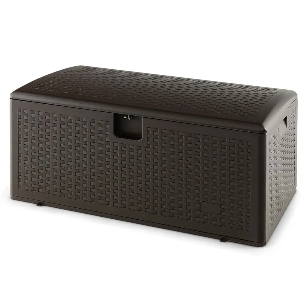 The deck box will enhance indoor and outdoor storage space! 28/73/100/120/130 gallon capacity is perfect for collecting garden tools, patio accessories, cushions and more. Besides, the storage box is sturdy enough to be regarded as a stool or side table, greatly satisfying your different needs. It is made of premium HDPE material for long-lasting use, which has the characteristics of weather-resistant and water repellent. More, the lockable design avoids the loss of patio and pool accessories. All in all, the classic storage box is a great addition for patio, garden, backyard, porch, and poolside.Features28/73/100/120/130 gallon deck box keeps your sundries in an orderly way Premium HDPE material is weather-resistant and water repellent Lockable design can well protect your belongings (the lock is not included) Comes with built-in handles for easy transportation Lid with straps is convenient to open and close Also available to be used as a seat bench or a side table Exquisite rattan imitation surface highlights your living surroundings Applicable to indoor, patio, porch, yard or garden, etc Easy to assemble according to the instructionColor: Brown Material: HDPE, Metal Overall Dimension: 20.5" x 20" x 20" /45" x 21" x 22"/45" x 21" x 22"/50" x 26.5" x 25.5"/50" x 29" x 25"(L x W x H) Net Weight: 18/34/41/48.5/48 lbs Weight Capacity of Top: 220 lbs Package Includes: 1 x Deck Box 1 x User Guide