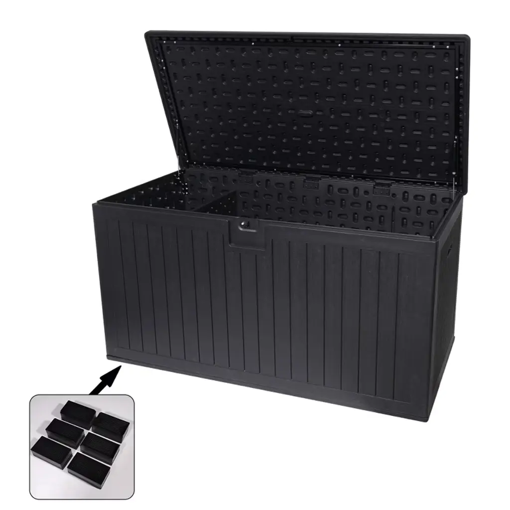 Your messy backyard needs a 105 gallon deck box! With a large capacity of 105 gallon, this 50.5'' x 25.5'' x 25.5'' deck box is perfect for yard, poolside, balcony and more places to store gardening tools, pool supplies as well as outdoor cushions. Since it is made of HDPE, the deck box is sun-proof for long-term outdoor use. Also, HDPE doesn't easily absorb water to ensure a dry interior space. The lid can be flipped open with pre-installed straps for easy access to items while preventing water from accumulating in the box. With side recessed handles, you can move it from one place to another place easily. And its lockable design will keep your items safe, but the lock is not included. Moreover, the deck box features a dual-wall structure and a metal cross bar, both highly enhance its sturdiness. Finally, the whole assembly hardly requires tools and can be finished quickly. Assembly Video:https://cdn1.costway.com/Install_video/93172450.mp4Features105 gallon inner space to store tools, pool supplies, pillows and more Made of HDPE which is heat resistant, cold resistant and sun protection Dual-wall structure and a metal cross bar for better sturdiness Lockable design to keep items safe (the lock is not included) Side built-in handles for convenient transportation Lid with pre-assembled straps easy to open and close Pre-installed holes for firm fixation with your own ground stakes Applicable to garden, deck, poolside, indoor places and more Easy installation under the guidance of a detailed manualColor: Brown Material: HDPE, Metal Overall Dimension: 50.5'' x 25.5'' x 25.5'' (L x W x H) Inner Dimension: 48.5'' x 22.5'' x 22.5'' (L x W x H) Net Weight: 43 lbs Package Includes: 1 x Storage Deck Box 1 x User Guide