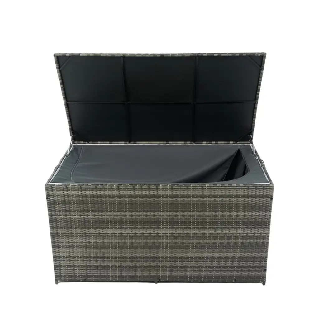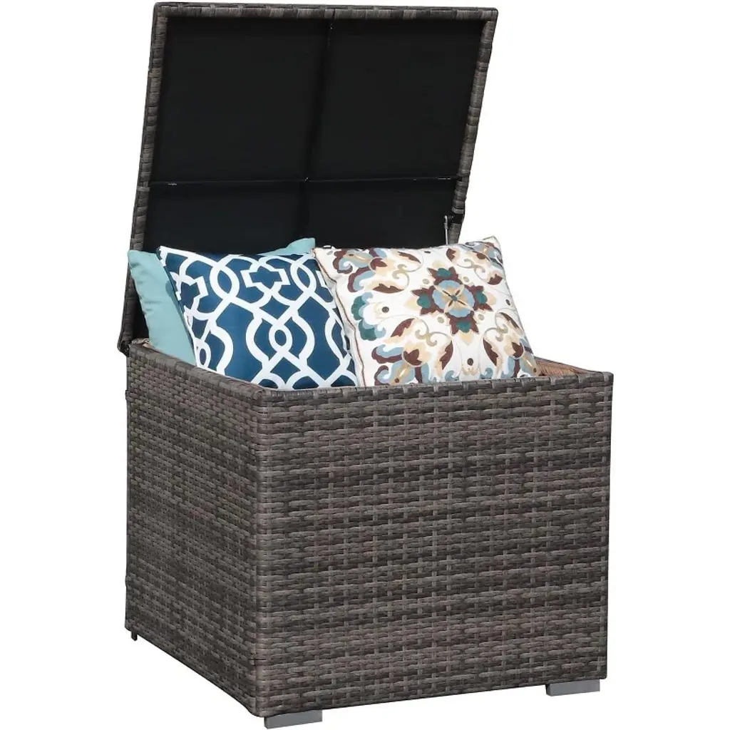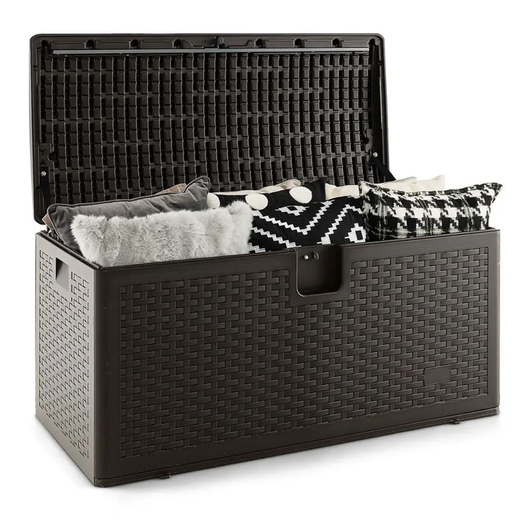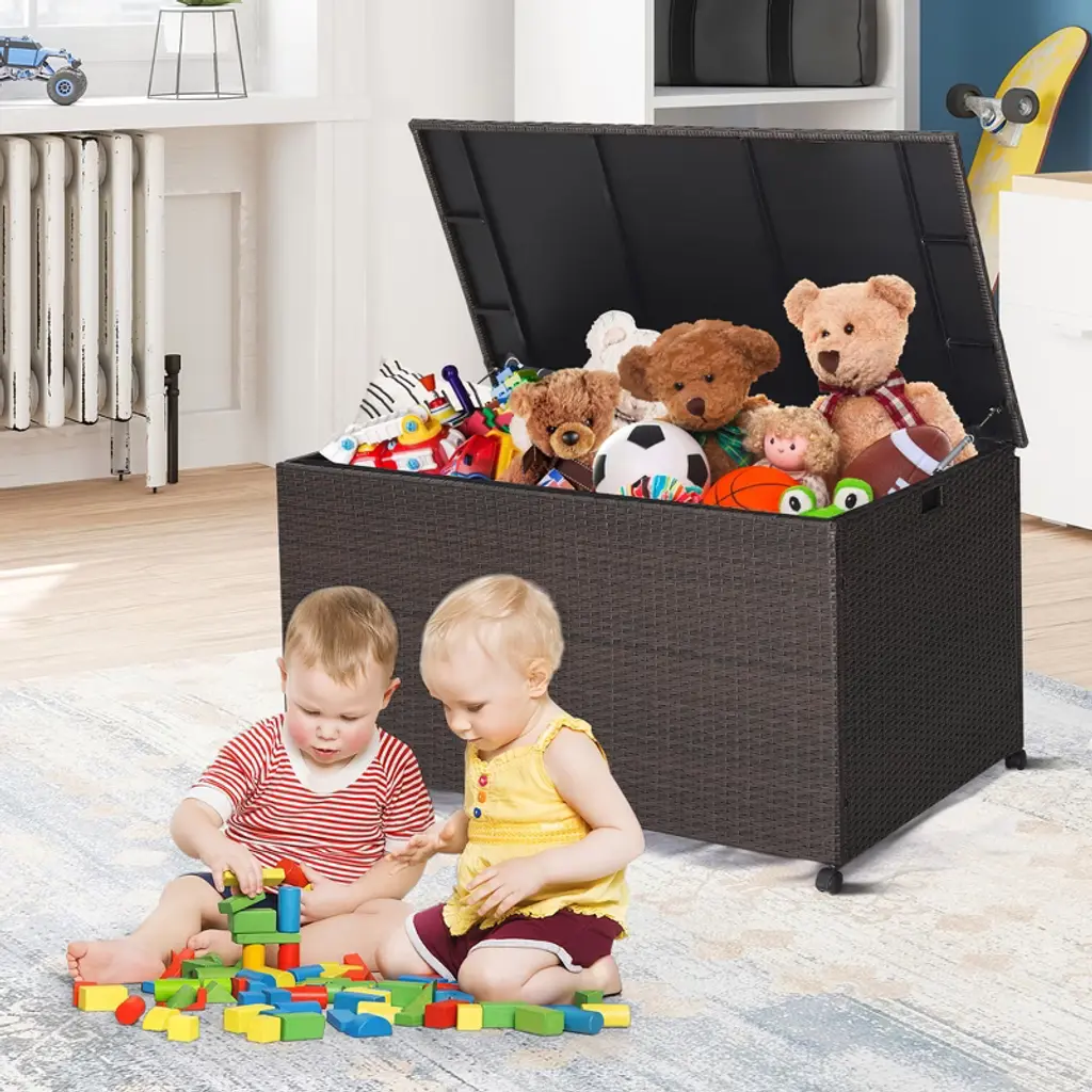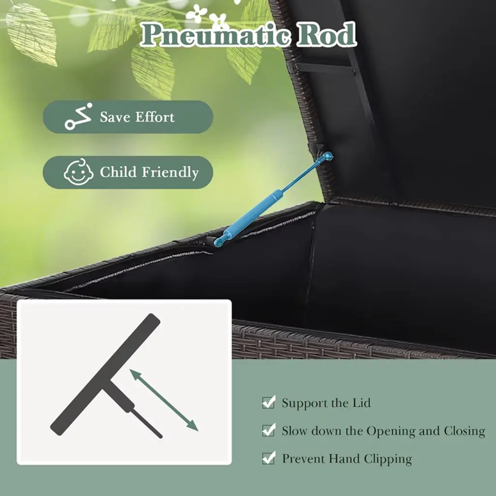 Add a perfect outdoor furniture piece to your home! Constructed from heavy-duty steel frame and sturdy top board, this storage box has a stable structure. The wrapped PE rattan that resists water and sun also makes it sturdy and suitable for the backyard, patio, poolside, etc. When you open or close the lid, the pneumatic rods slow down the speed, ensuring safety and effort saving. With its large storage space, this wicker storage cabinet can store not only some cushions, but also some other items, such as gardening tools, pool supplies, children’s toys and so on. And the water-resistant liner can well protect the items inside. In addition to the use of storage, the outdoor rattan box also allows you to put your magazines, coffee and more on the table top. If you need to, the built-in side handles and 2 wheels rotating 360 degrees will help you easily move it anywhere. FeaturesWeather-resistant PE rattan ensures long-term outdoor use Sturdy steel frame and top board make the box stable Pneumatic rod for easier and safer opening and closing the lid 360° rotatable wheels and built-in handles allow you to move easily Extra supporting middle legs ensure extra stability Removable liner with zipper design Protective liner prevents items from water or dust Used as a storage box or a patio side table 133 gallon large inner space for cushions, gardening tools, pool accessories, etc. Great addition to the backyard, garden, poolside and other outdoor places Easy to assemble with the clear user’s manual and hardware includedColor: Mix Brown Material: PE, Steel, PU Coated Polyester Fabric, PP Overall Dimension: 52'' x 28.5'' x 27.5'' (L x W x H) Inner Dimension: 49.5'' x 26.5'' x 24'' (L x W x H) Capacity: 133 Gallon Net Weight: 32 lbs Weight Capacity of Top: 165 lbs Weight Capacity of Interior: 165 lbs Package Includes: 1 x Storage Box 1 x Instruction