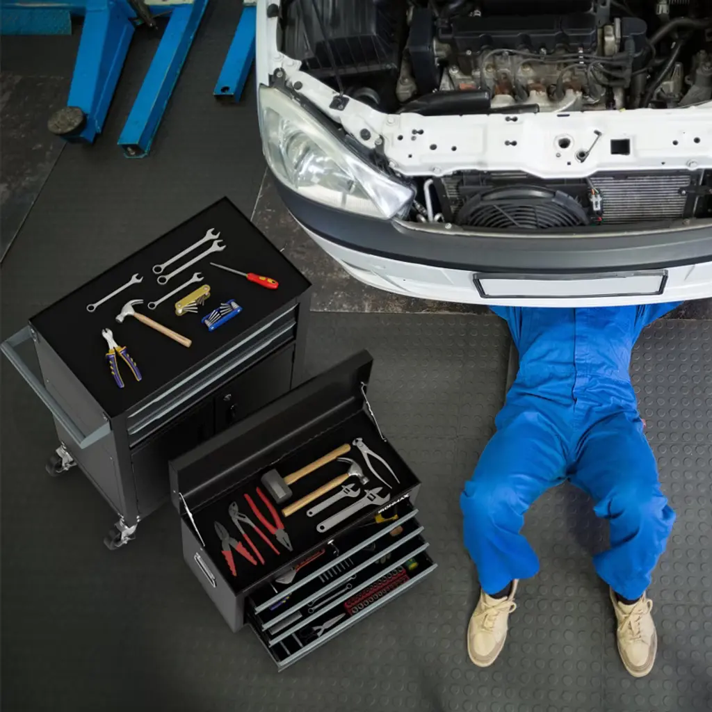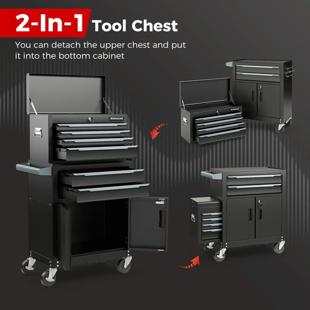 This is our stylish 2 in 1 tool chest with roller cabinet which ideal for garages, work spaces or anywhere tool organization is needed. Our tool cabinet cart are made of high-quality steel, durable and strong enough to store many different tools and other things. 4 small drawers, 2 large drawers, 2 trays and 1 big bottom cabinet provide large storage space for you. Tool chest and cabinet come in 2 pieces that allow you to use them separately or together according to your needs. The top chest is fully lockable to protect your tools and valuables. In addition, with four swivel casters ( 2 of them with brake) and a handle on one side , you can move it easily. Don't hesitate to buy one! The 4 drawers of top chest will automatically lock when the top lid and drawers are closed, and unlock when the top lid is opened for ease of useFeaturesBrand new and high quality Made of high-quality steel , sturdy and durable Powder Coated Finished Resists Rusts Large storage space for storing all kinds of items Lockable design for maximum security Handle on one side, easy to control the rolling tool cabinet Slide out drawers with ball-bearing rails, easy to push and pull out Universal wheel and 2 of them with brake, easy to move and beparked Detachable design for flexible use 4 hooks can hang some wrenches or other small items With EVA pads in every drawer to protect your tools from being scratched Easily assembly requiredColor: Black/Red Material: Steel Overall Dimension: 28'' x 13'' x 44''(L x W x H) Top Chest Size:23.5'' x 10.5'' x 13.5''(LxWxH) Tool Cabinet without Casters:24'' x 13'' x 30''(LxWxH) Weight Capacity of Each Drawer for Chest Box: 33 lbs Weight Capacity of Each Drawer for Cabinet : 55 lbs Net Weight: about 58.5 lbs Package Includes: 1x 2 PCS Tool Chest with Roller Cabinet