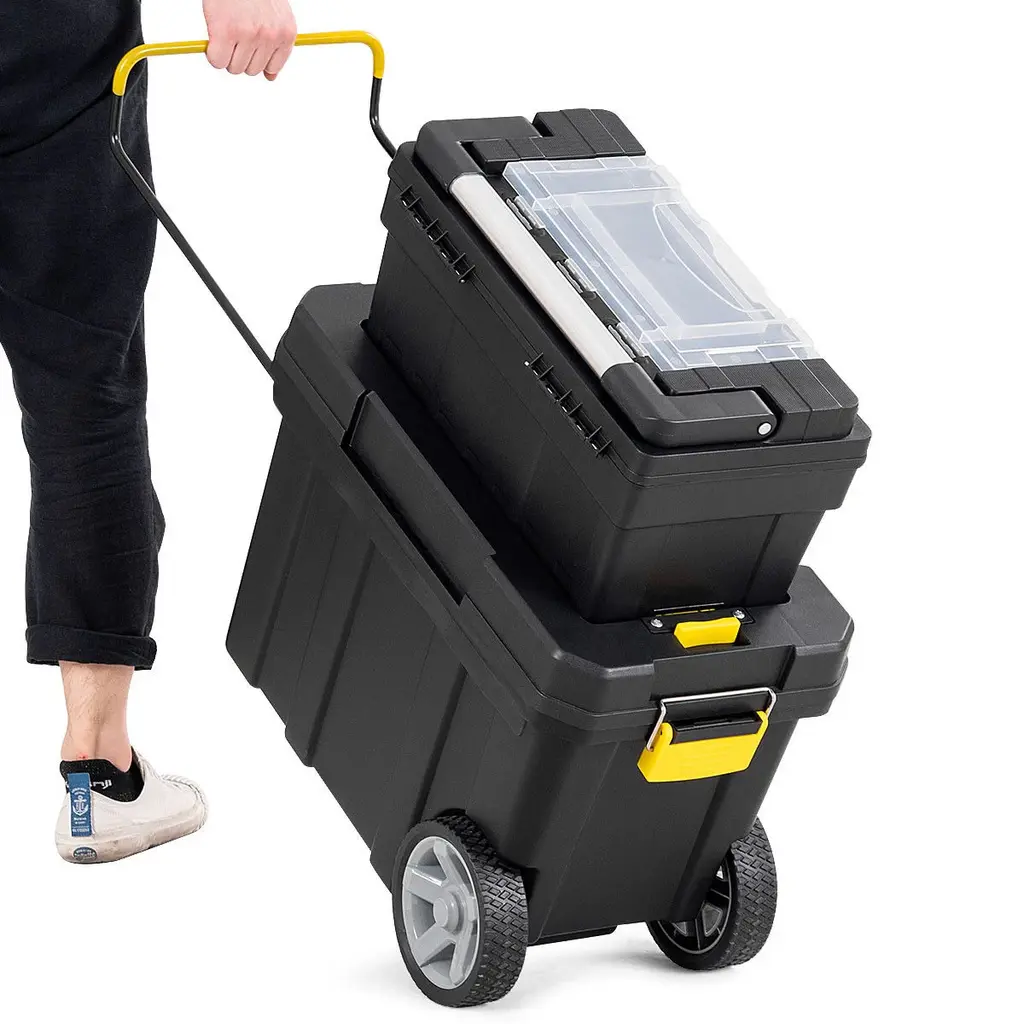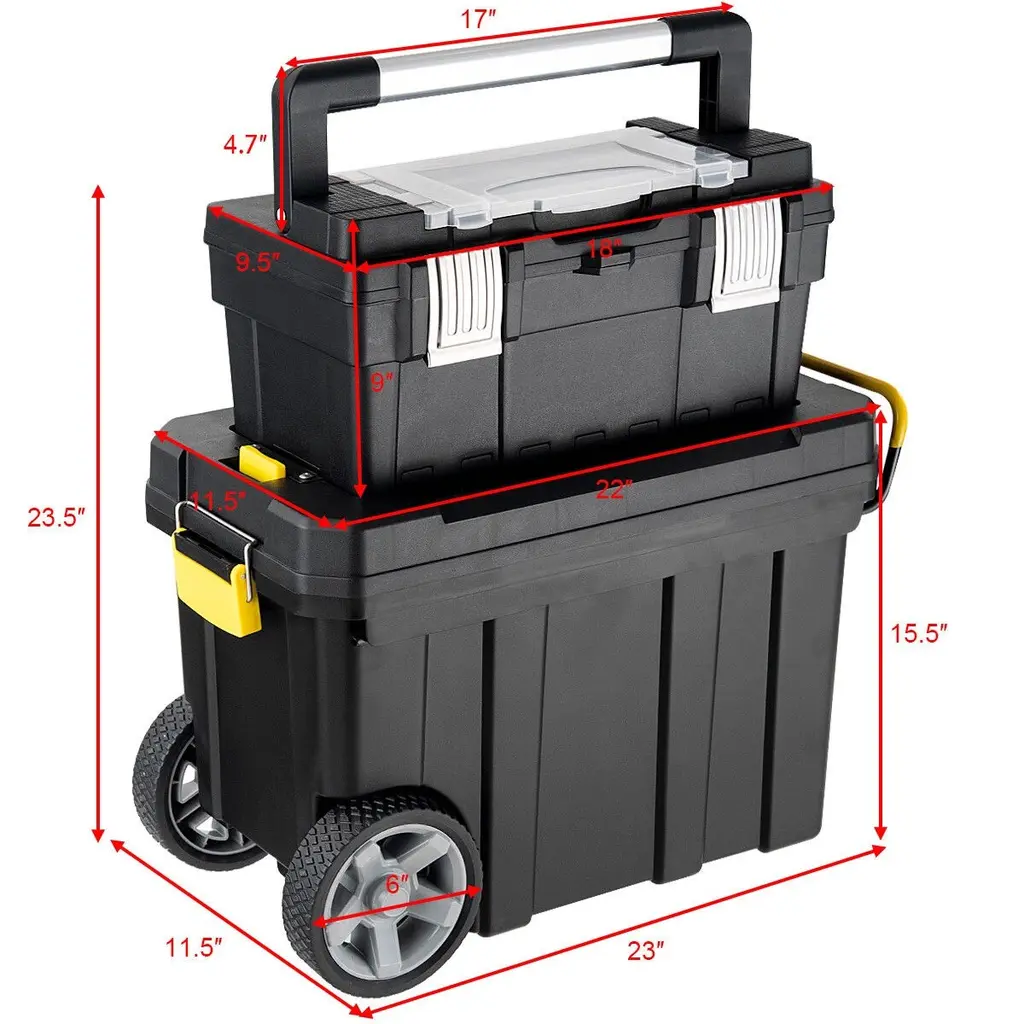 This is our new 2 in 1 tool box set which includes a 18 inch top tool box and a 23 inch bottom tool chest. The top tool box has a retaining buckle for maintaining security as well as stability during travel. The interior is organized to maximize the amount of available space, and there is even a tool divider in it for the easy compartmentalization of your tools. It allows users to store their most useful tools on the top portion of the tool box. For the bottom tool chest, it features telescopic handles and 2 heavy-duty road tested wheels for easy movement and use. Heavy tools and rarely used items can easily be stored below. 6'' oversize wheels for easy rolling over any surface. Polypropylene resin construction for long terms of use. There is no need to worry about the effects of chemical spills because this material is resistant to many chemical agents, and it also resists the corrosive effects of bases and acids. It is easy to clean, and you only need a damp cloth to give it a quick wipe. It is perfect for store heavy tools and rarely used items. Don't hesitate to buy one set nowFeature2 in 1 design:Top tool box and bottom tool chest Heavy duty steel latches for security and safety Solid construction for years of use Large storage capacity Top tool box features an interior organizer trayBottom tray for wider tools6'' oversize wheels for easy rolling over any surfaceEquip with Telescoping HandleBlack case makes it dirt-resistantSpecificationColor:Black Material:PPOverall Dimension:23''x11.5''x27.5''(LxWxH) Dimension Of Bottom Box:(23''-35.5'') x 11.5'' x 15.5'' (L x W x H) Dimension Of Top Box:18'' x 9.5'' x 9'' (L x W x H)Weight Capacity Of Bottom Box :110LbsWeight Capacity Of Top Box :44LbsNet Weight of whole set:about 15.5 LbsPackage Includes: 1 x Top Tool Box 1 x Bottom Tool Chest