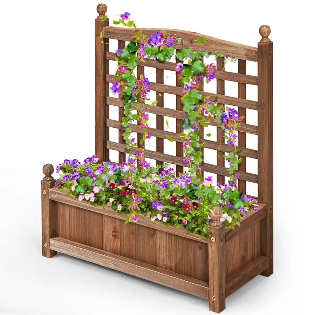 Are you still sad about not having a beautiful garden? Our planter with trellis can solve your problem. This is our planter with trellis which is made of solid wood and has unique and beautiful appearance. The natural fir is weather-resistance and sturdy which can be used for a long time. You don't have to worry about the wood breaking which is caused by exposure to the sun and wind. This pot has a grid design to support your climbing plants. The water outlet can be easily drained, allowing the plant to grow better. Our planter with trellis has a very large flower box that can hold a variety of plants you like. Of course, you can also grow crops. The exterior design is simple and easy to match and it is ideal to place in yard, garden, patio or balcony to be a perfect décor with many of your favorite plants. Our planter is definitely superior in quality and reasonable in price.Features100% solid wood for stability and durability Weather-resistant design is great for outdoor using Suitable for being placed in the balcony, garden and yard Designed with drain hole to prevent rotting of roots Large storage space for planting more plants High load capacity allows more plants to be suspended The built-in trellis offers great support for climbing plants Create a romantic pastoral atmosphere for your yard Easy installation neededColor: Dark brown Material: fir Net weight: 9.24lbs Product dimensions: 25'' (L) x 11'' (W) x 30'' (H) Inside dimension: 23'' (L) x 8.5'' (W)x 6''(H) Mesh size: 25'' (L) x 21'' (H) Package includes: 2x planter with trellis 1x Instruction Book