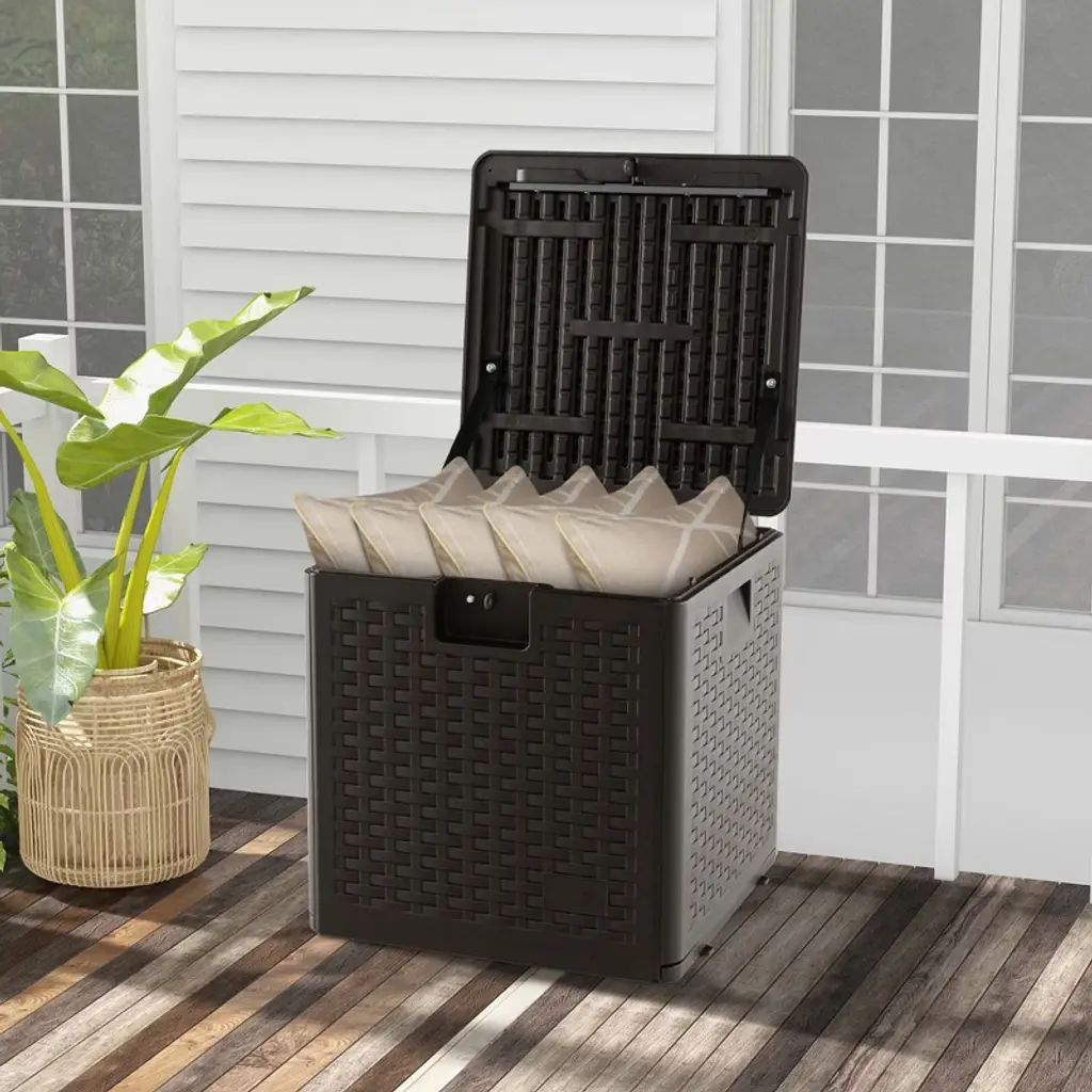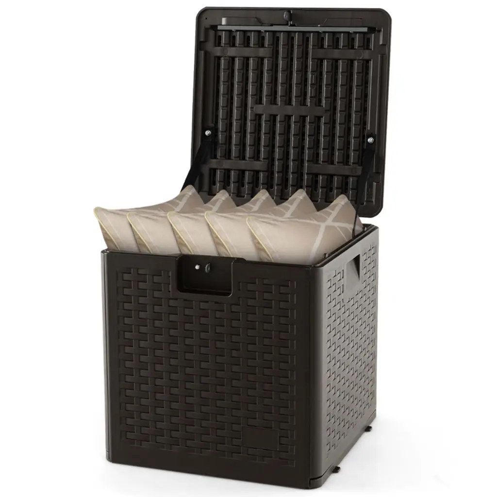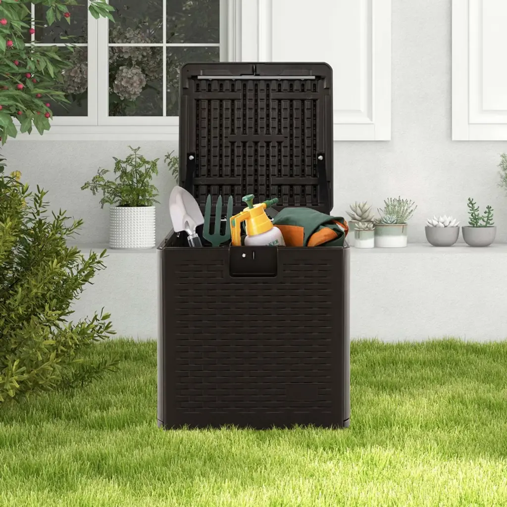 The deck box will enhance indoor and outdoor storage space! 28/73/100/120/130 gallon capacity is perfect for collecting garden tools, patio accessories, cushions and more. Besides, the storage box is sturdy enough to be regarded as a stool or side table, greatly satisfying your different needs. It is made of premium HDPE material for long-lasting use, which has the characteristics of weather-resistant and water repellent. More, the lockable design avoids the loss of patio and pool accessories. All in all, the classic storage box is a great addition for patio, garden, backyard, porch, and poolside.Features28/73/100/120/130 gallon deck box keeps your sundries in an orderly way Premium HDPE material is weather-resistant and water repellent Lockable design can well protect your belongings (the lock is not included) Comes with built-in handles for easy transportation Lid with straps is convenient to open and close Also available to be used as a seat bench or a side table Exquisite rattan imitation surface highlights your living surroundings Applicable to indoor, patio, porch, yard or garden, etc Easy to assemble according to the instructionColor: Brown Material: HDPE, Metal Overall Dimension: 20.5" x 20" x 20" /45" x 21" x 22"/45" x 21" x 22"/50" x 26.5" x 25.5"/50" x 29" x 25"(L x W x H) Net Weight: 18/34/41/48.5/48 lbs Weight Capacity of Top: 220 lbs Package Includes: 1 x Deck Box 1 x User Guide