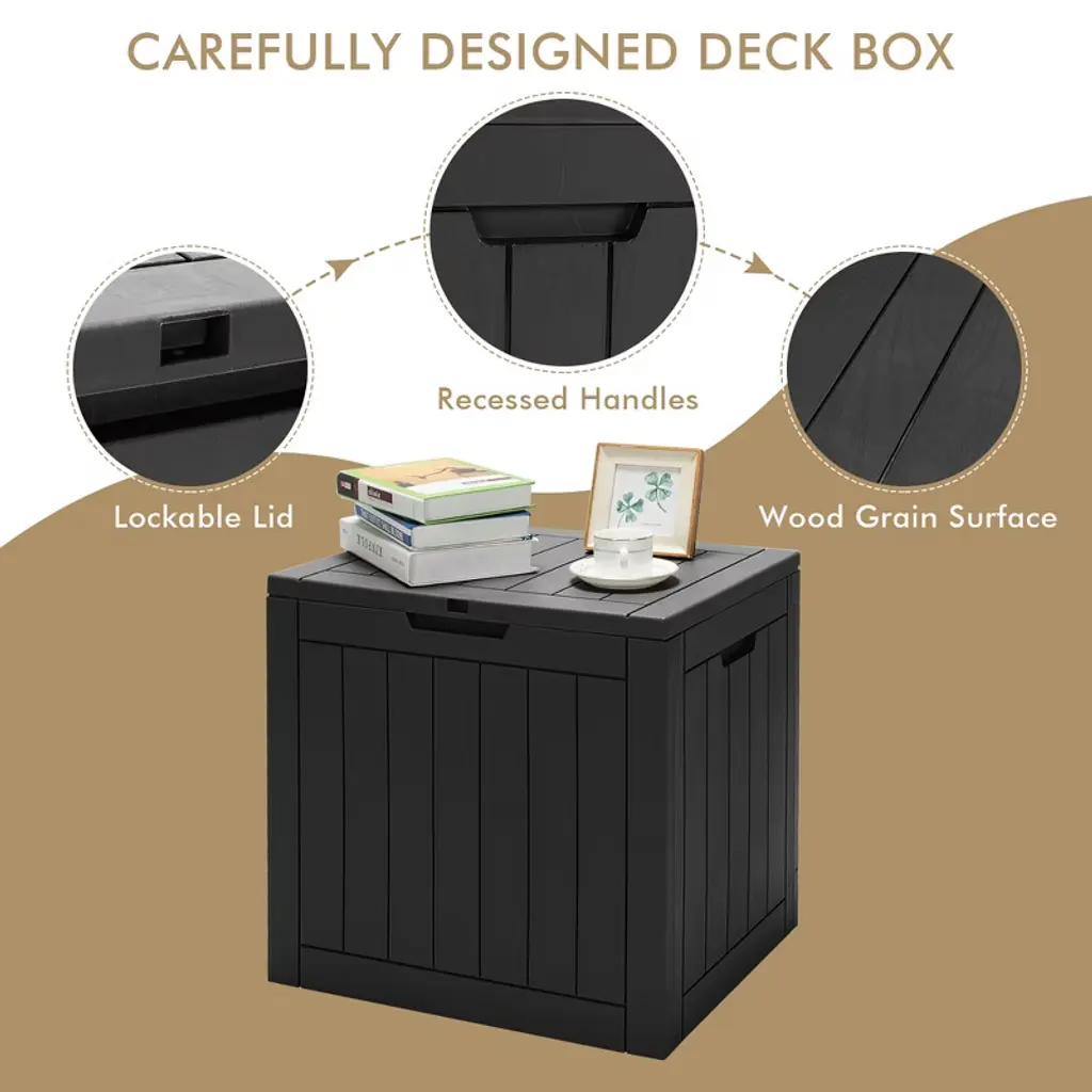 This storage container boasts its multifunctional design. It not only adds outdoor storage space but also can be used as a bench or side table. The natural wood grain tex ture makes it look great with other outdoor decorations. And with a 30-gallon volume that can accommodate everything from garden tools to patio supplies, it’s there to make your patio both elegant and functional. Besides, its relatively compact size makes it ideal for entryway, laundry room or garage storage. What’s more, with its sturdy PP material and weather-resistant design, this box will stand up to the outdoor environment and serve you well year after year. Features30-gallon capacity well accommodates pillows, pool toys and garden tools With lockable lid (lock is not included) for better protection Made of PP material that is sturdy and weather-resistant Wood grain surface goes well with outdoor decorations Can be used as a storage box , a patio bench or a side table With recessed side handles for easy portability No tools or ex tra accessories are required for assembly Color: Light Brown Material: PP Overall Dimensions: 22'' x 17'' x 21''(L x W x H) Net Weight: 8.5 lbs Interior Dimensions: 21'' x 16'' x 20''(L x W x H) Capacity: 30 Gallon/ 114 L Weight Limit of the Top: 154 lbs Package Includes: 1 x Deck Box 1 x User Manual